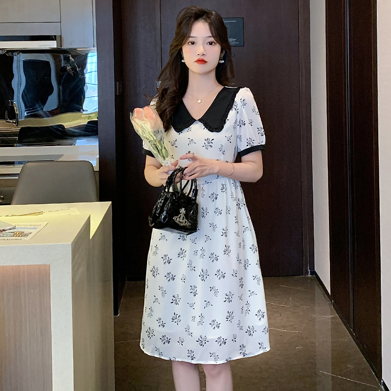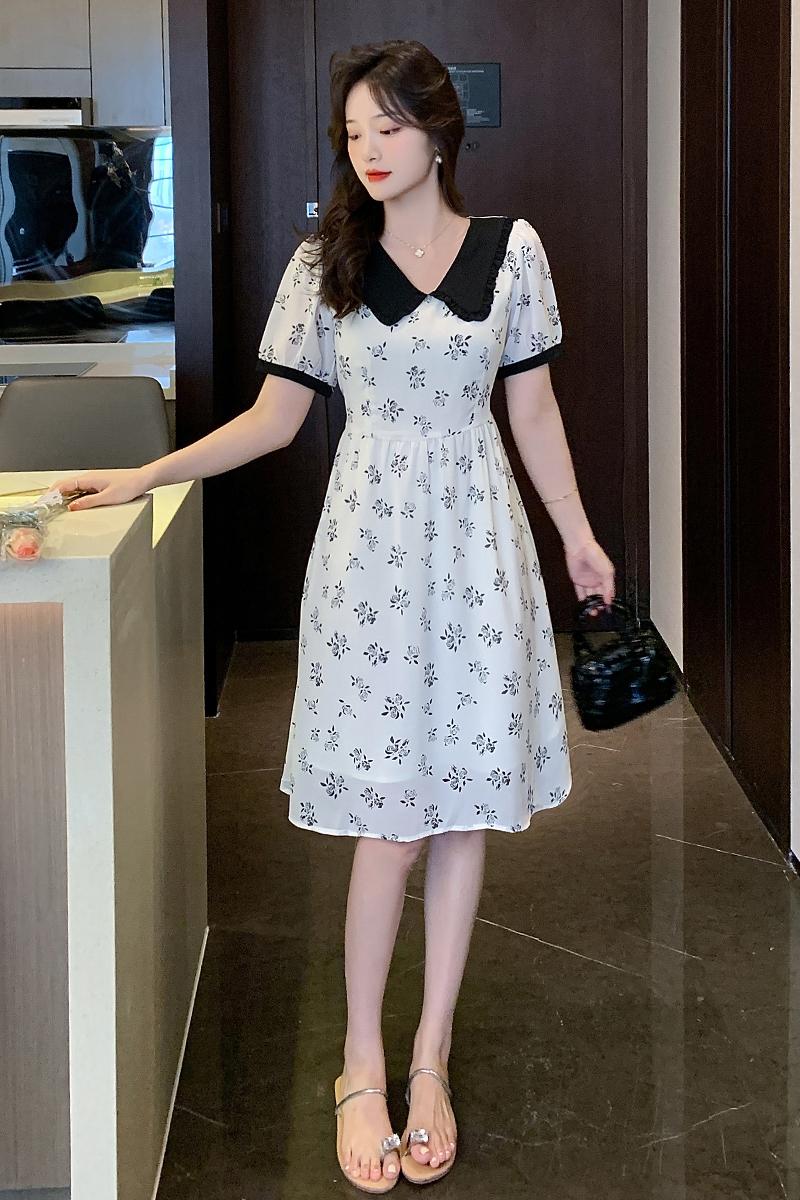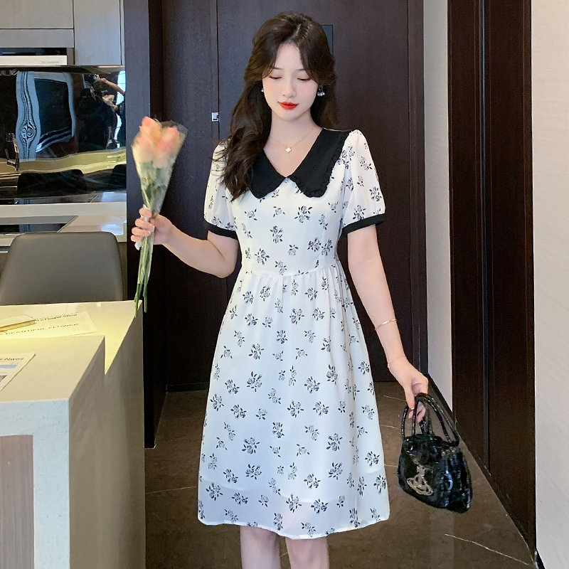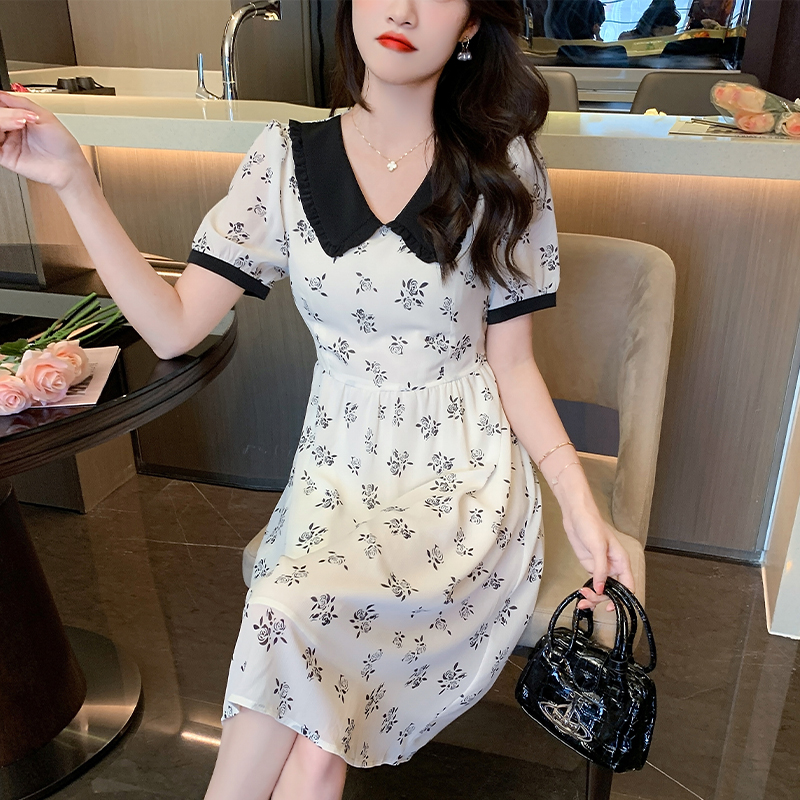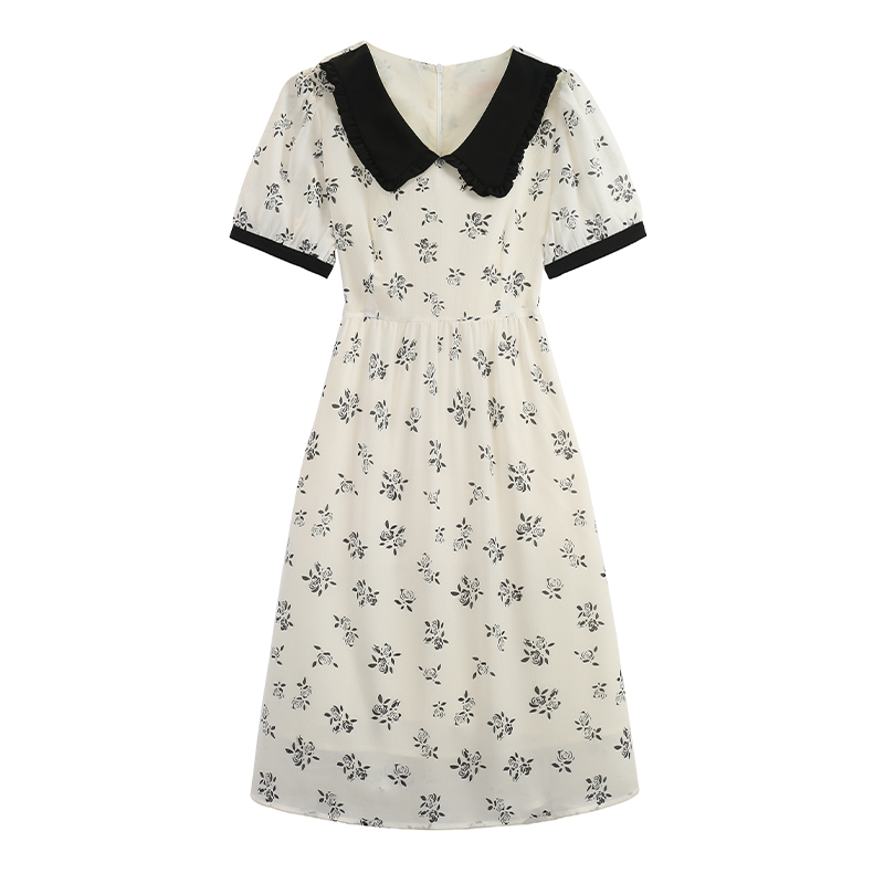 RY57# 实拍娃娃领收腰显瘦中长款气质A字裙夏季短袖日系印花雪纺连衣裙