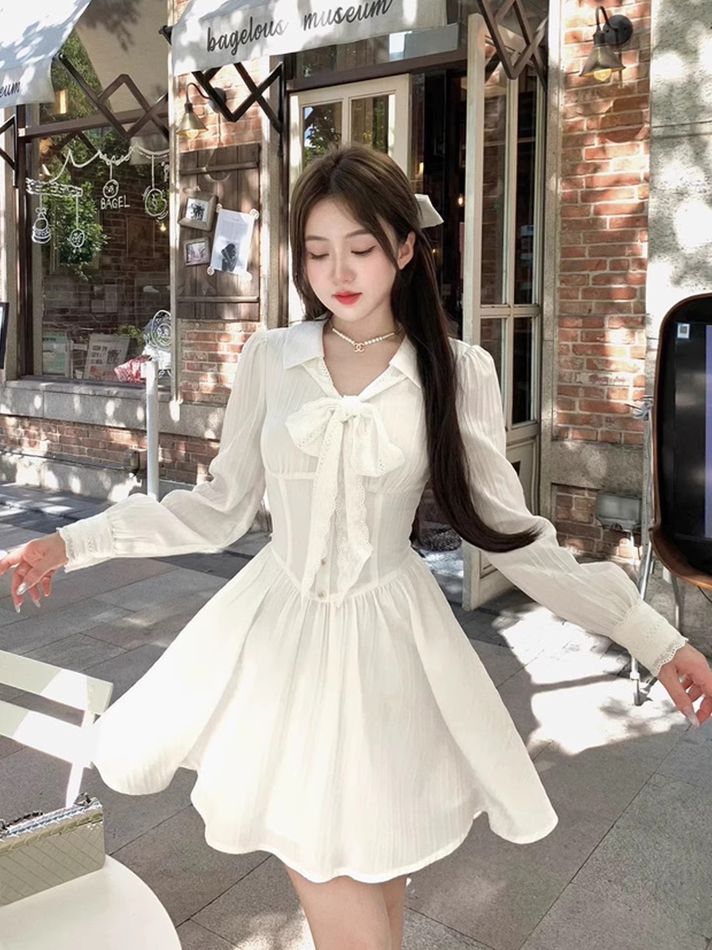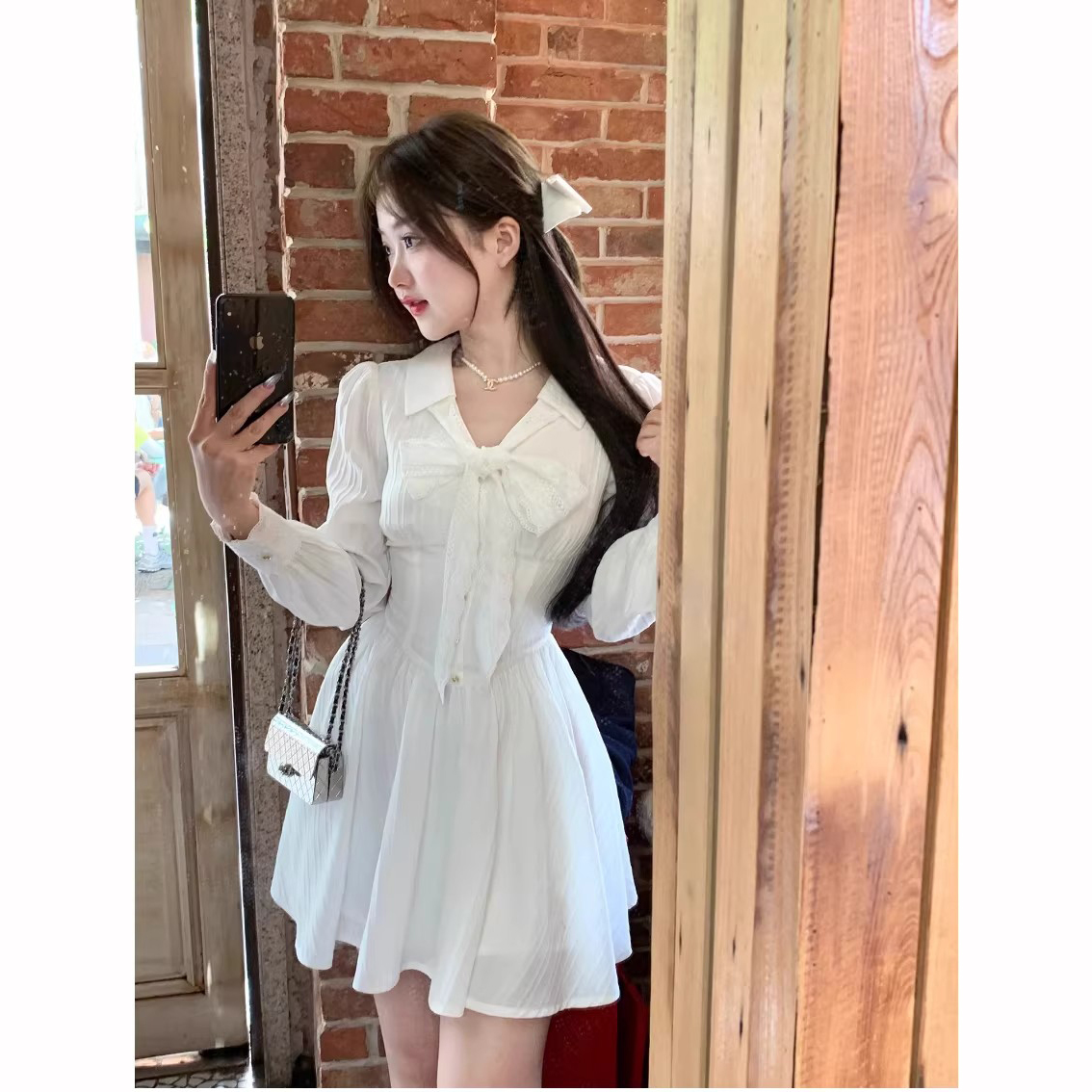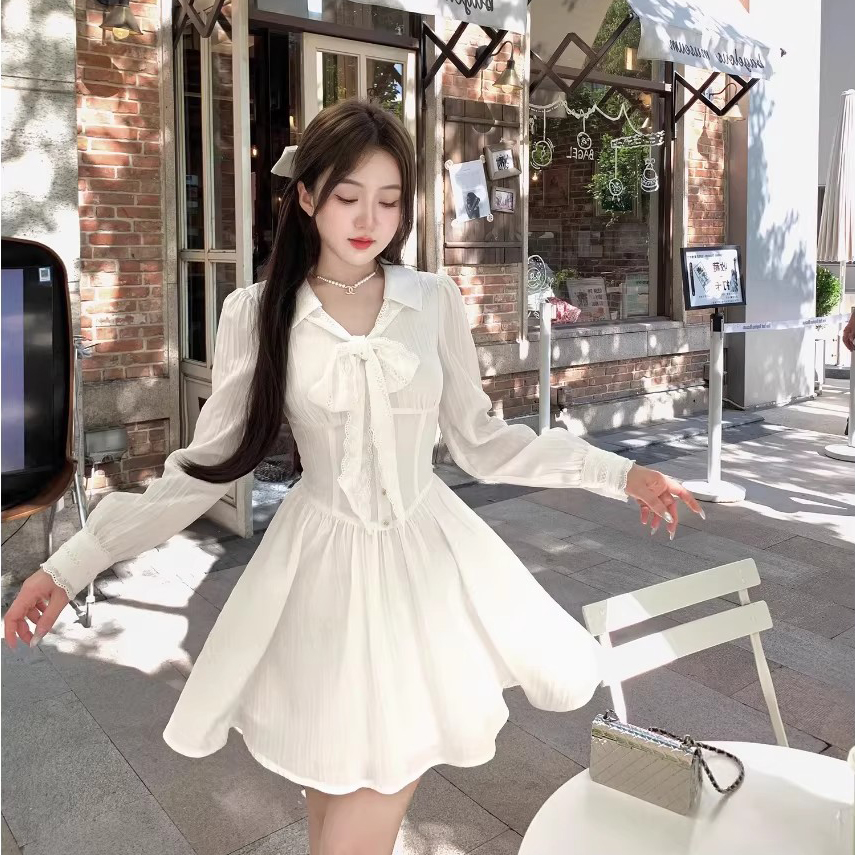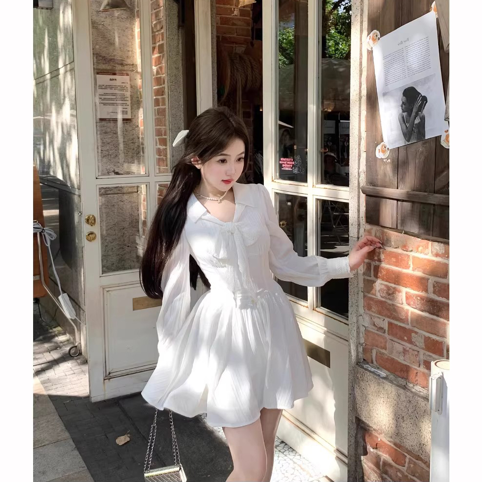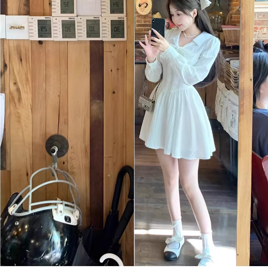 RY84# 双层套里悸动小白裙花边长袖衬衫连衣裙法式绝美白色春夏短裙穿搭
