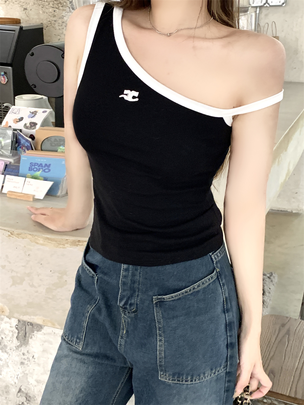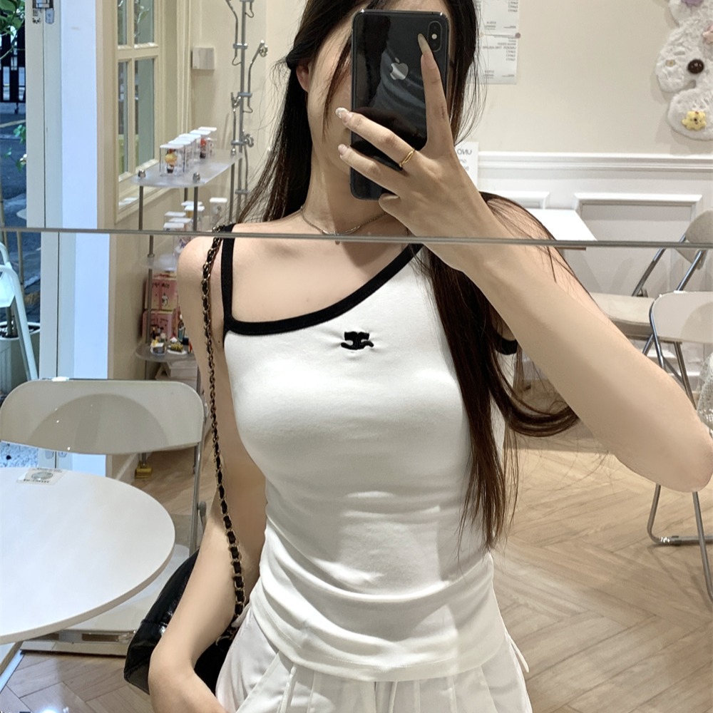 RY85# 一字领短袖T恤女刺绣