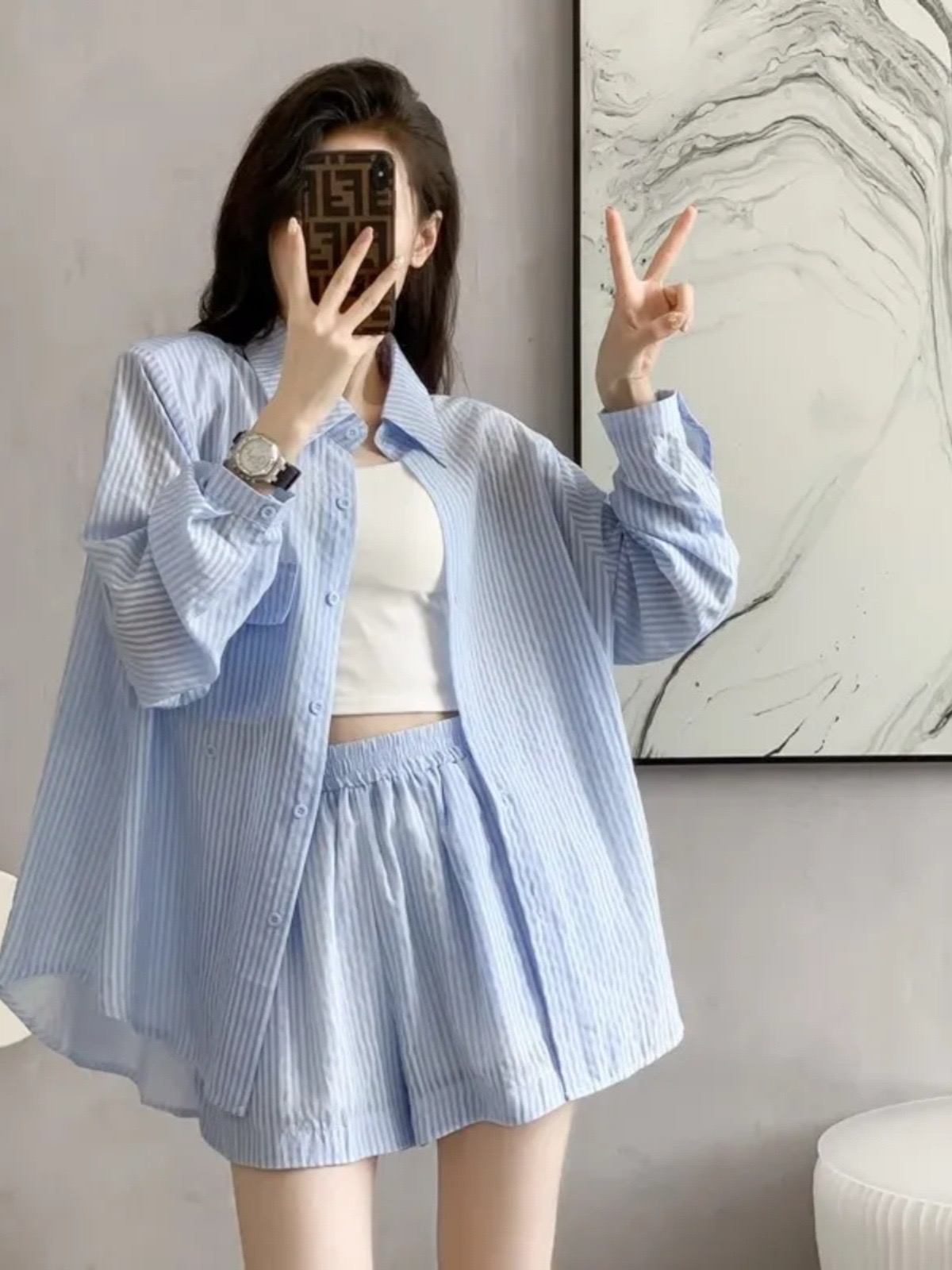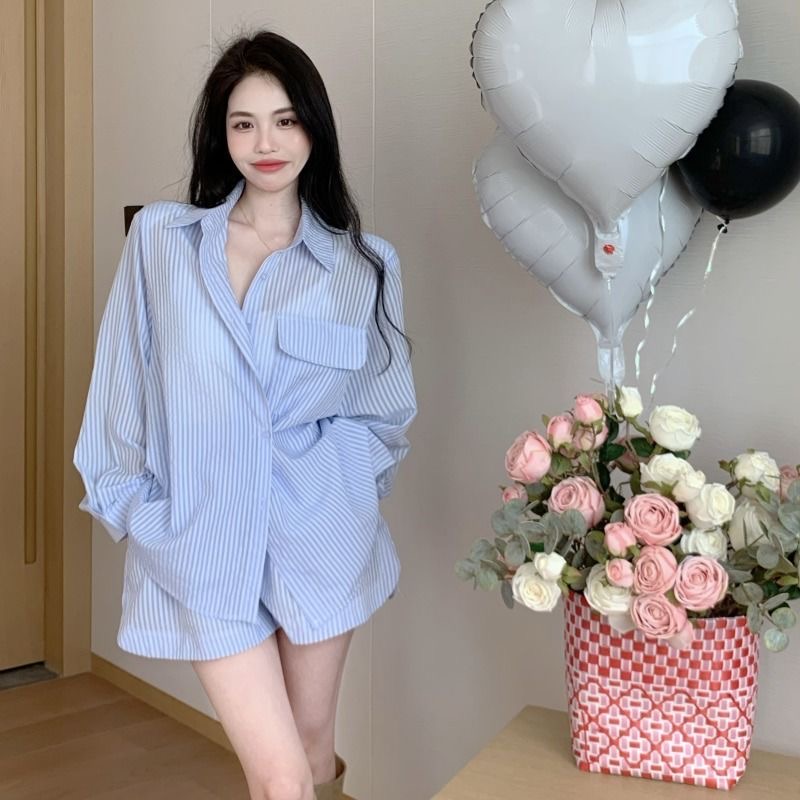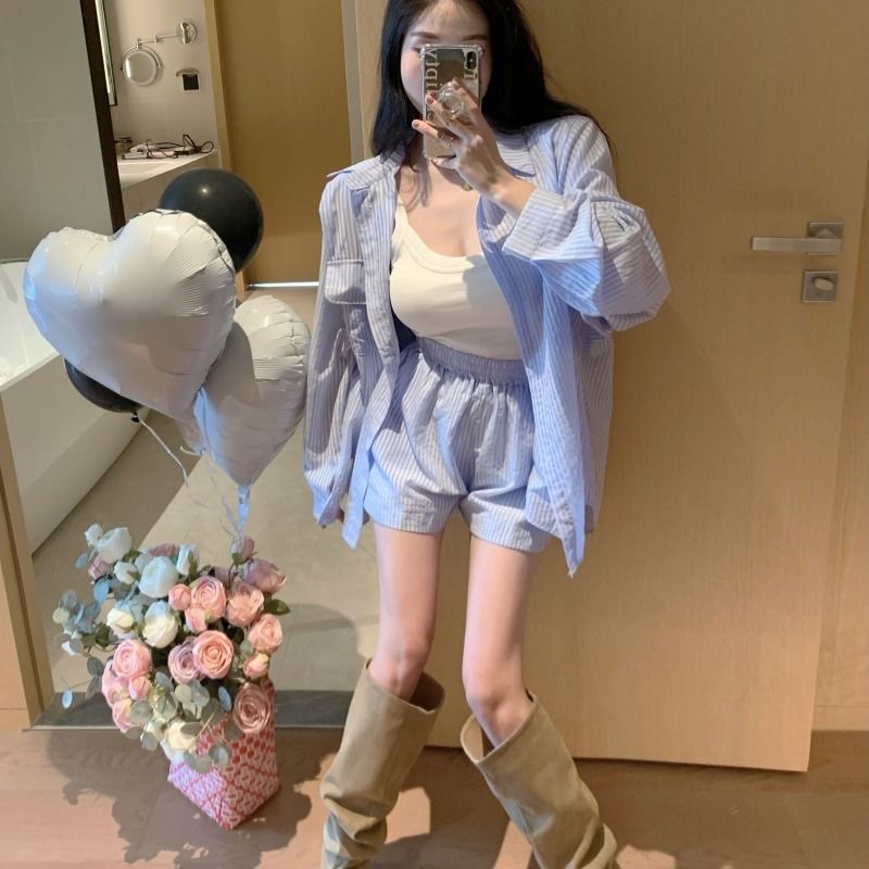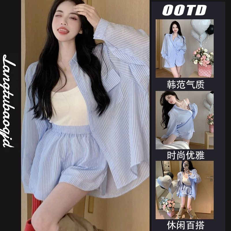 RY88# 薄款防晒衣女款衬衫套装2026新款夏季法式宽松条纹衬衫短裤两件套