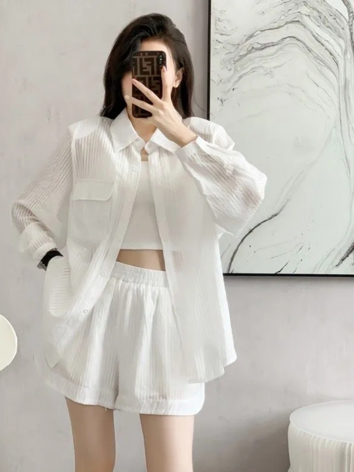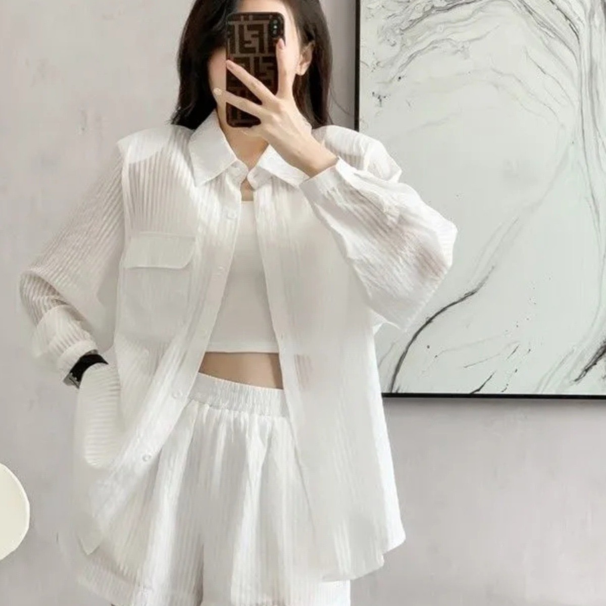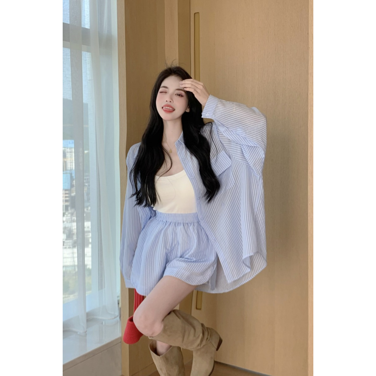 RY88# 薄款防晒衣女款衬衫套装2026新款夏季法式宽松条纹衬衫短裤两件套