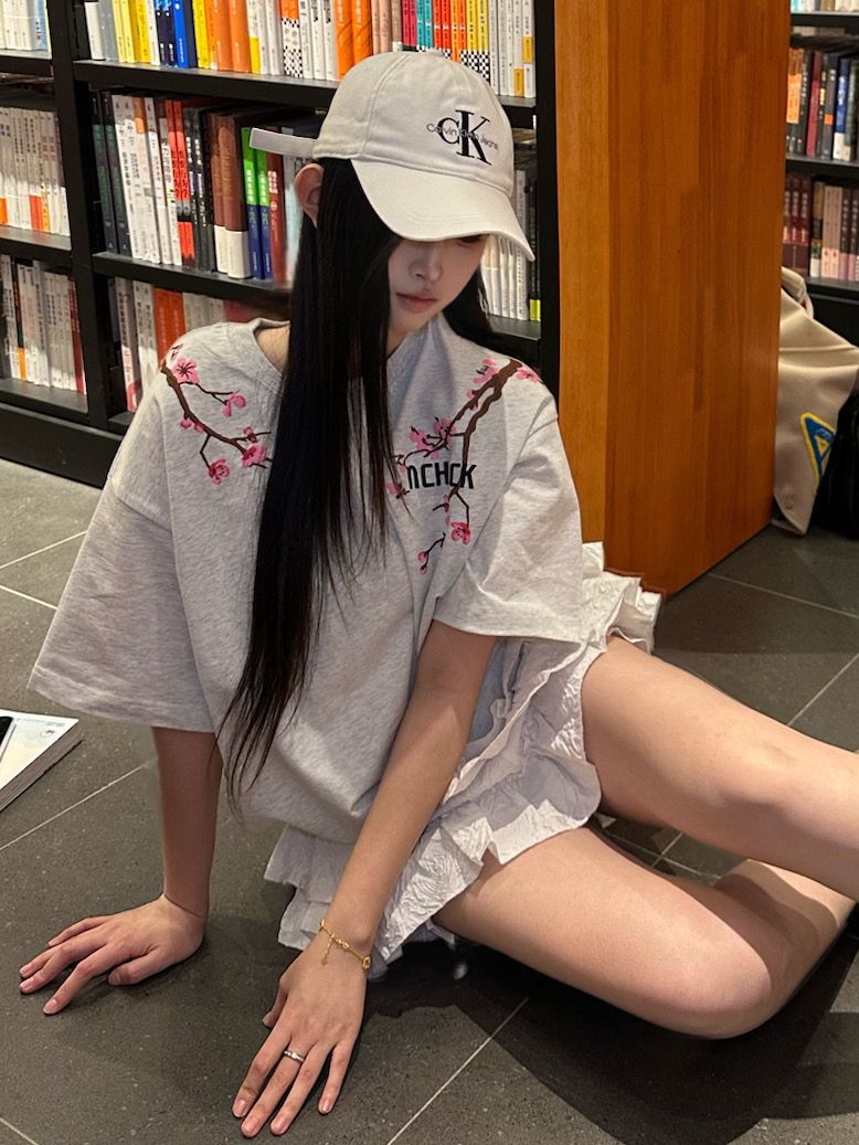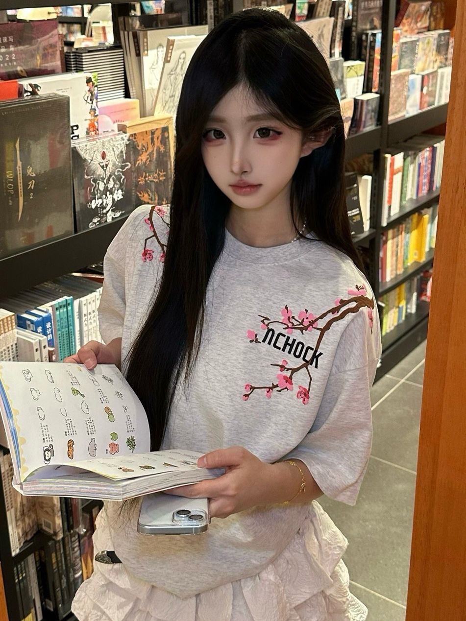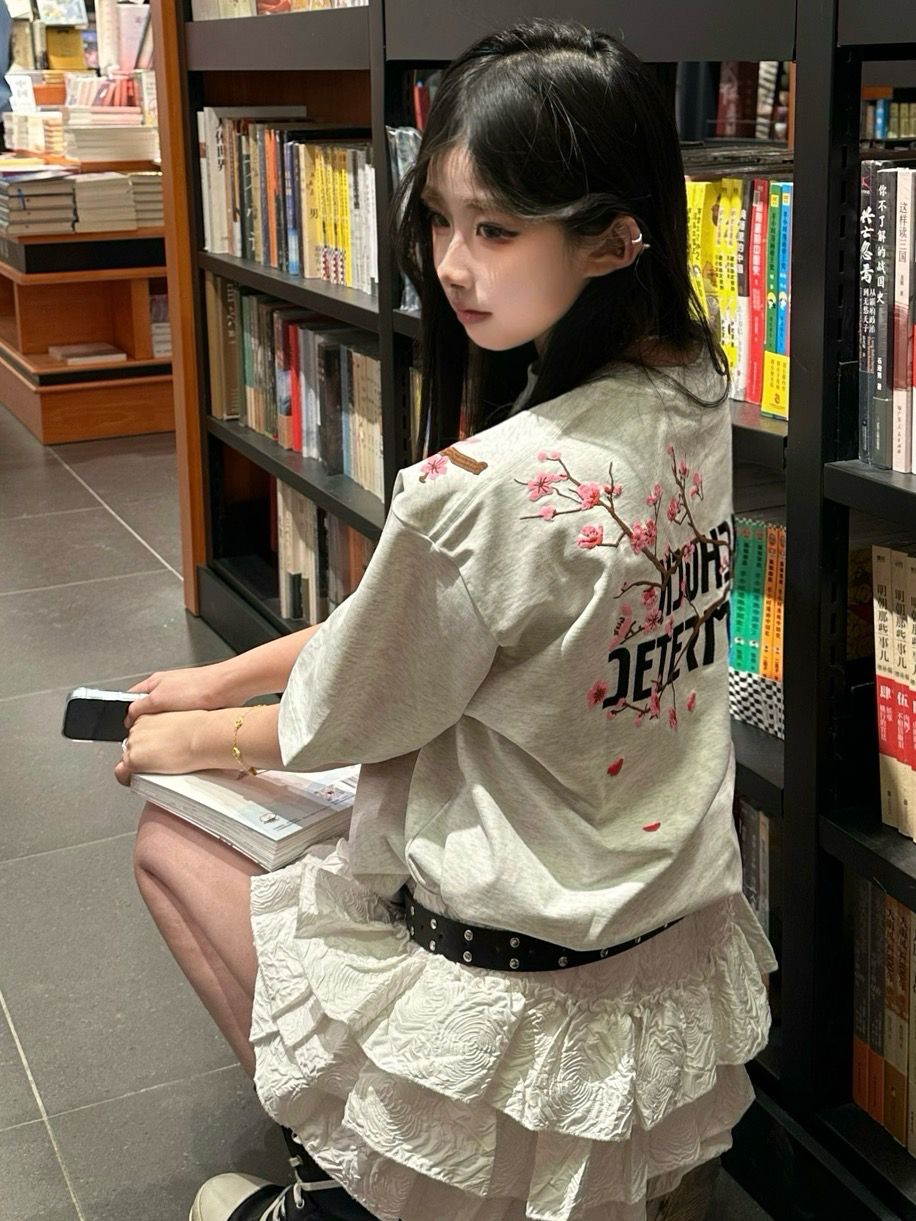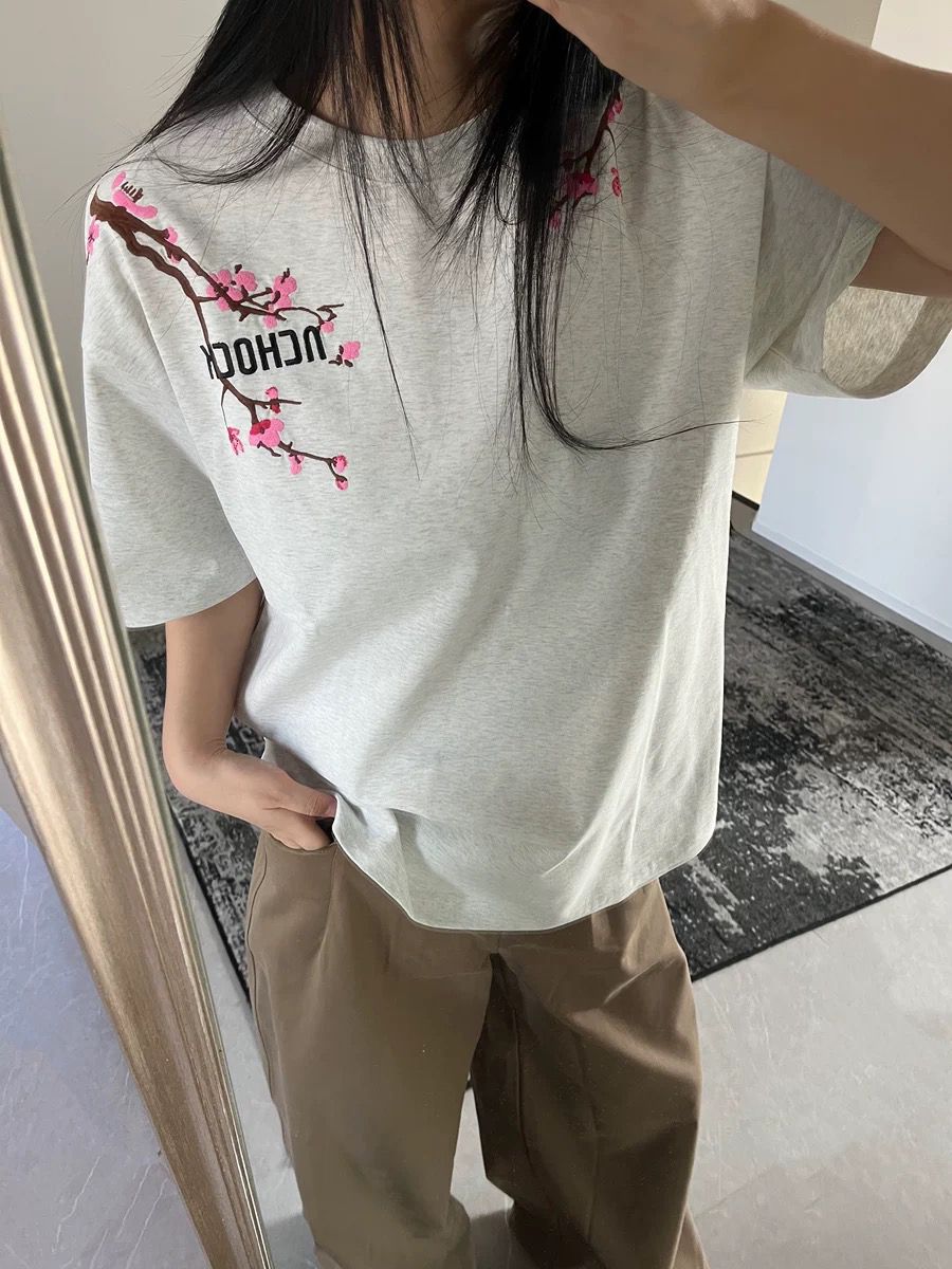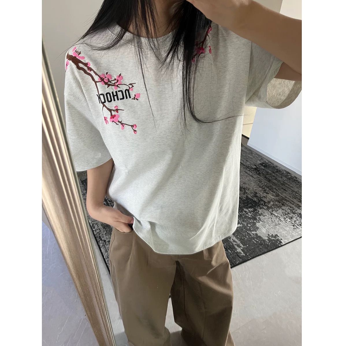 RY122# 纯棉原版刺绣品质升级美式设计白灰色上衣字母花朵短袖T恤