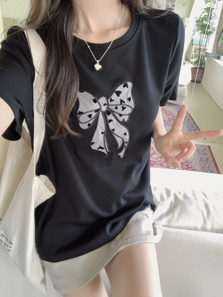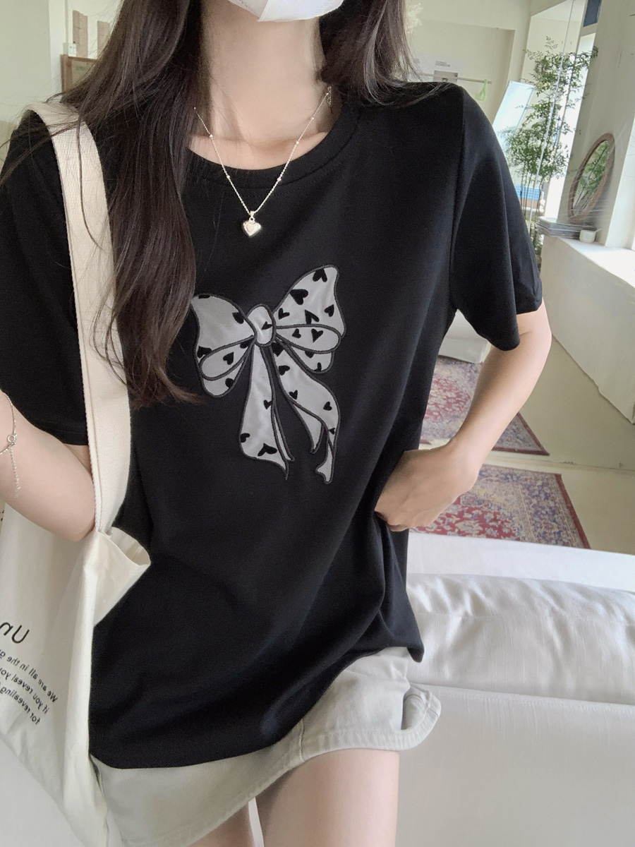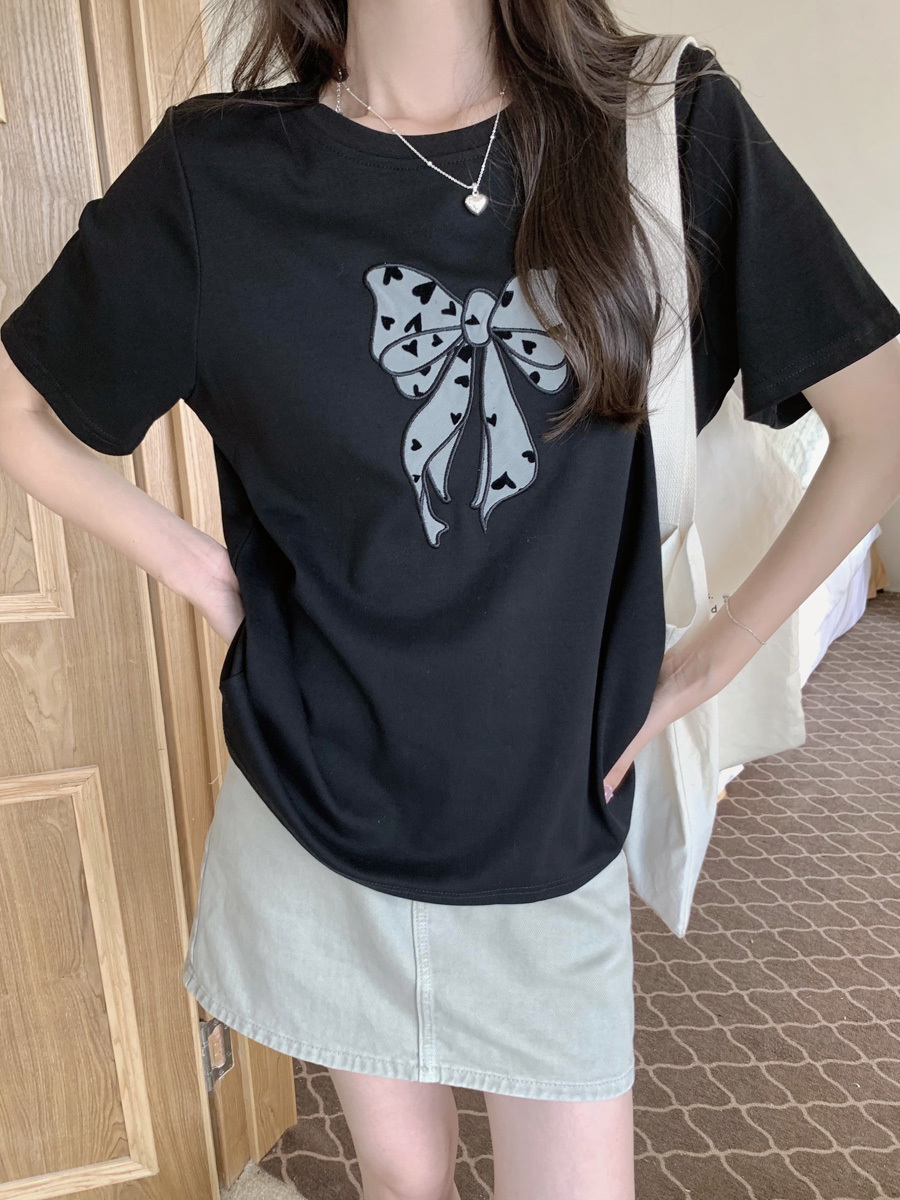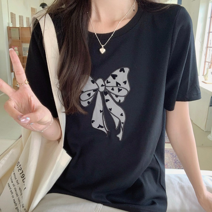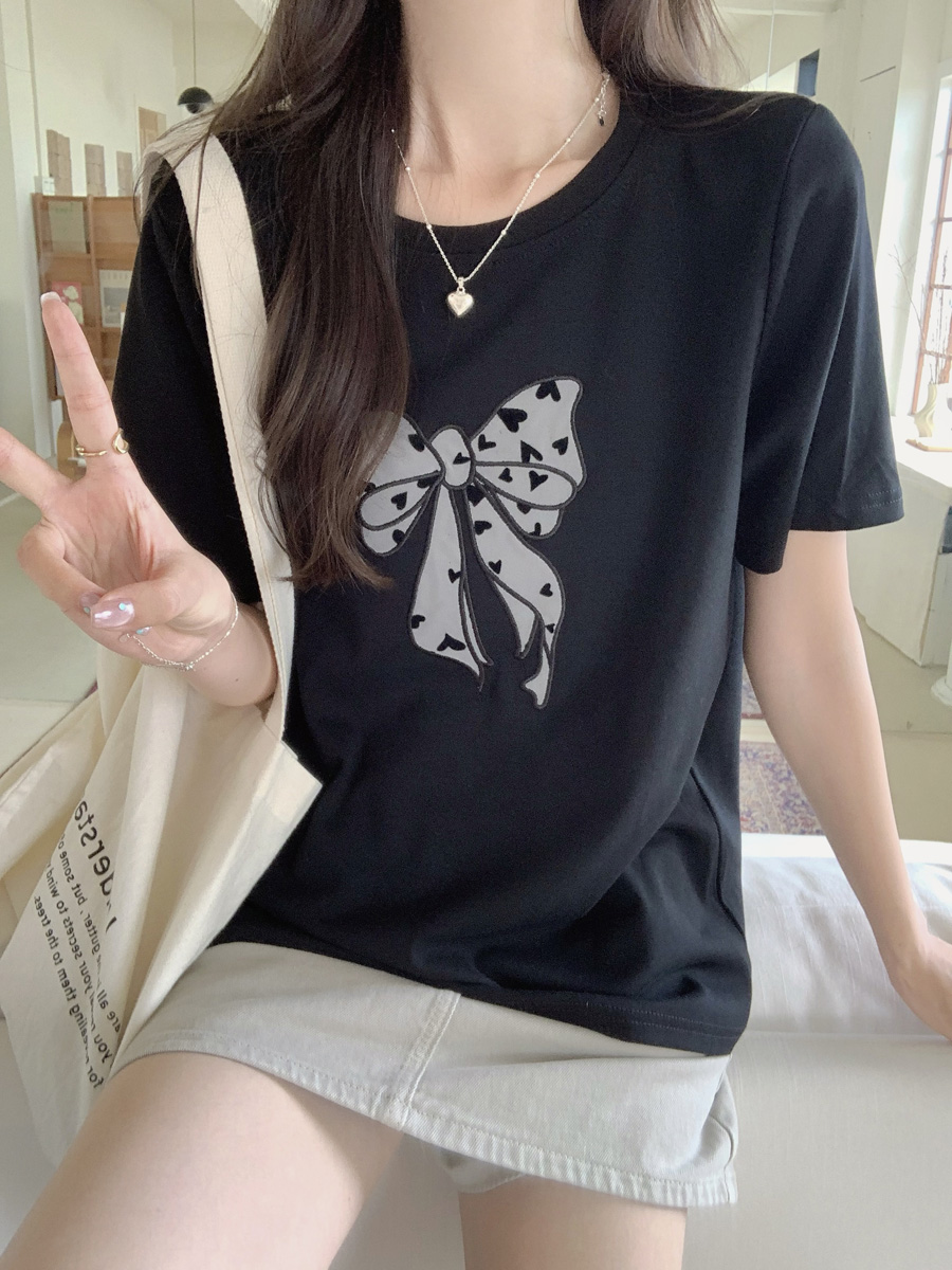 RY130# 实拍纯棉减龄甜美爱心蝴蝶结贴布短袖t恤女爆款宽松显瘦打底上衣