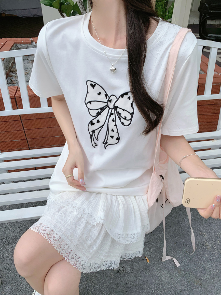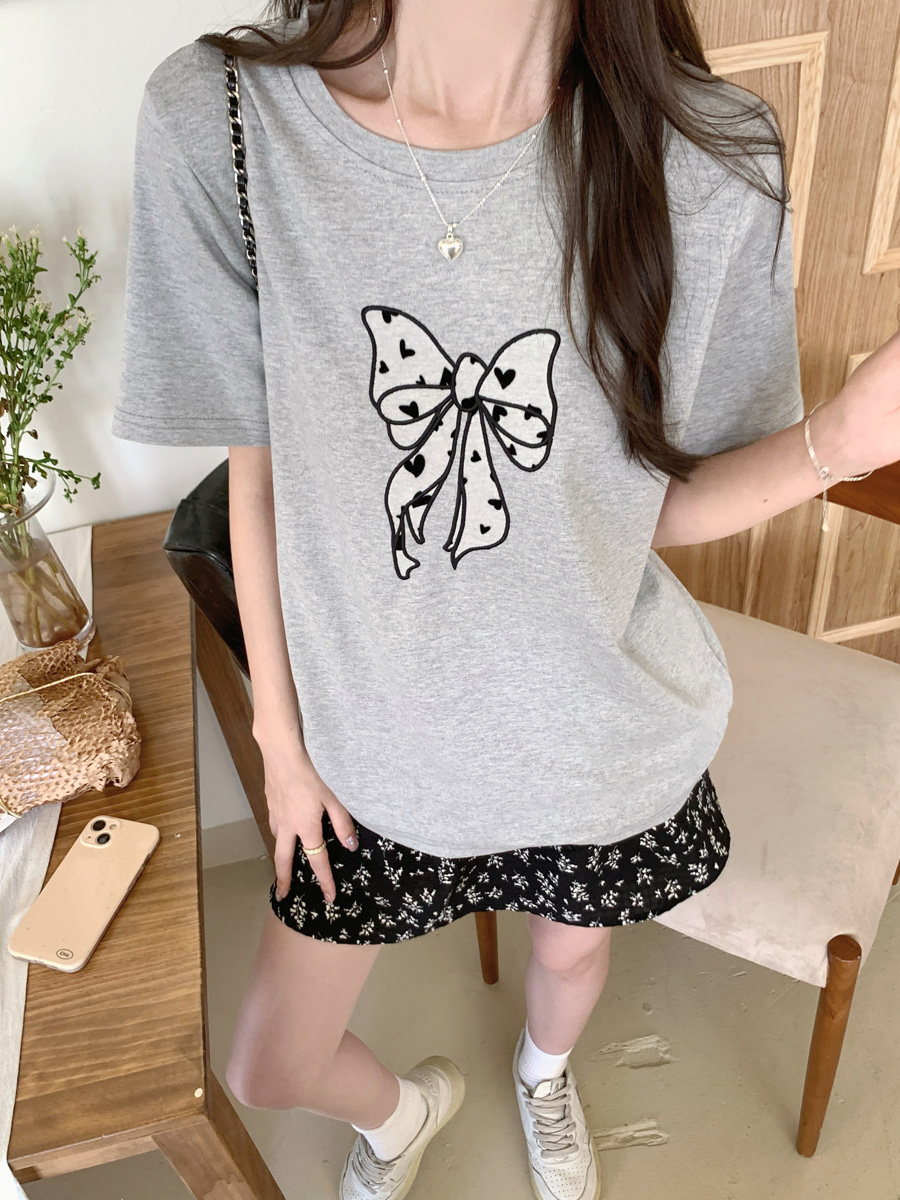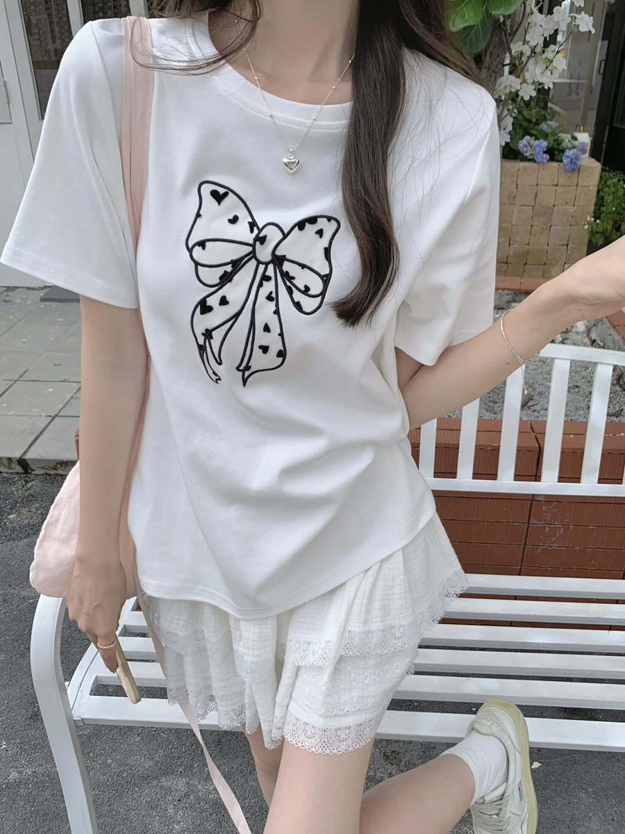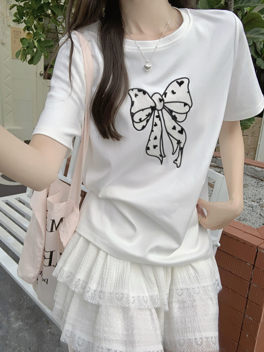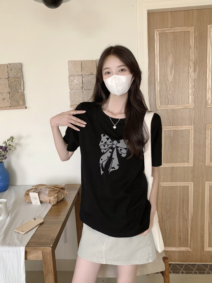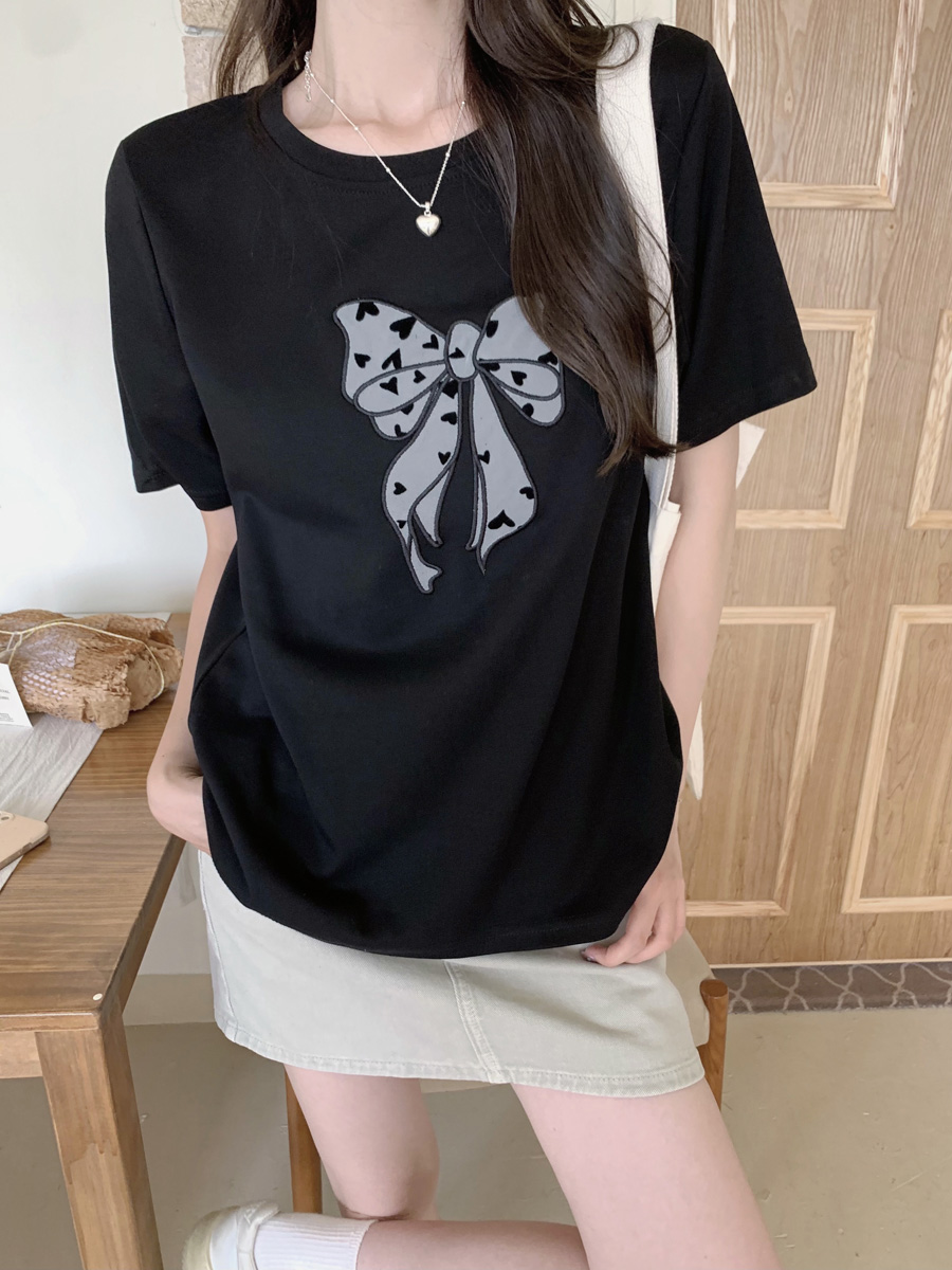 RY130# 实拍纯棉减龄甜美爱心蝴蝶结贴布短袖t恤女爆款宽松显瘦打底上衣