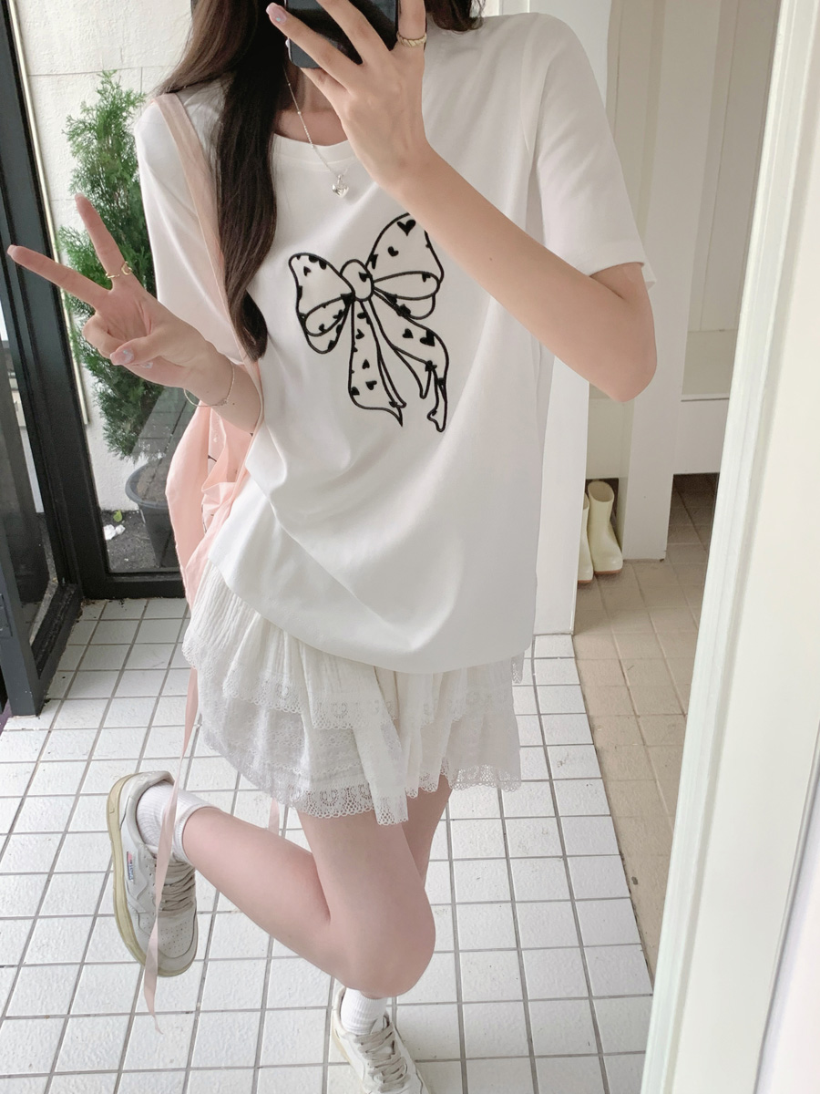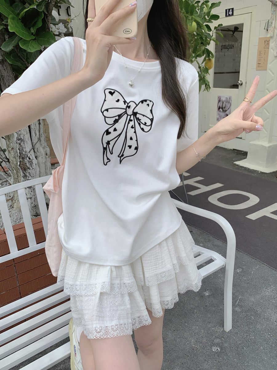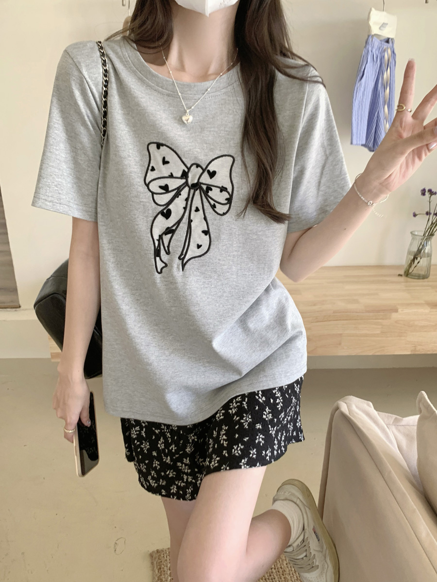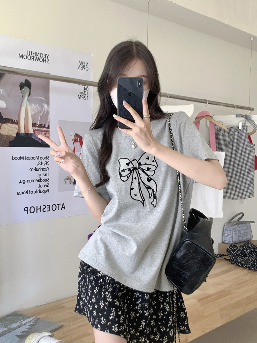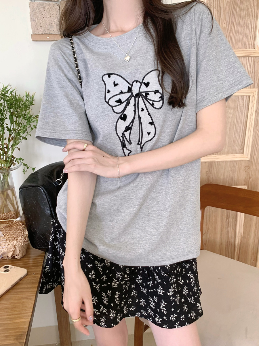 RY130# 实拍纯棉减龄甜美爱心蝴蝶结贴布短袖t恤女爆款宽松显瘦打底上衣