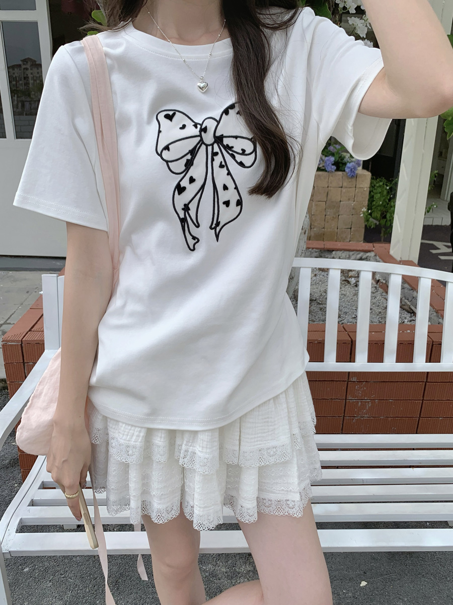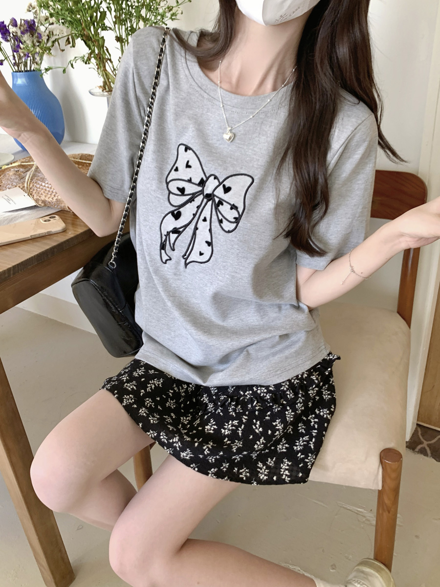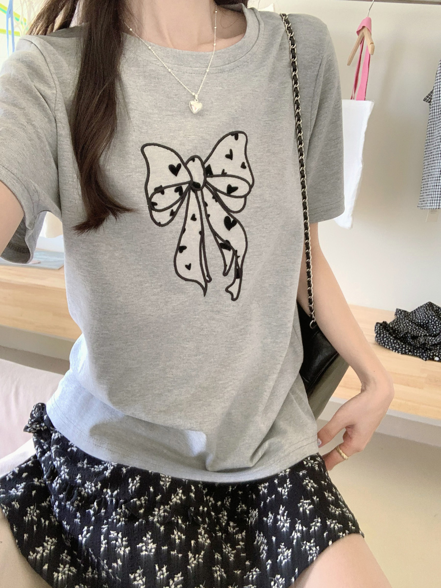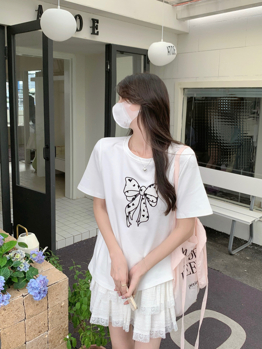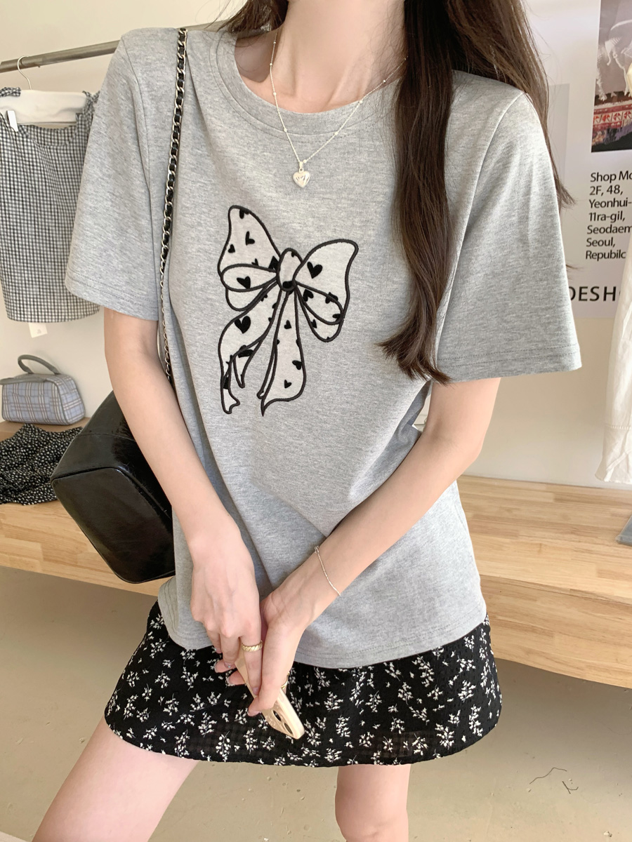 RY130# 实拍纯棉减龄甜美爱心蝴蝶结贴布短袖t恤女爆款宽松显瘦打底上衣
