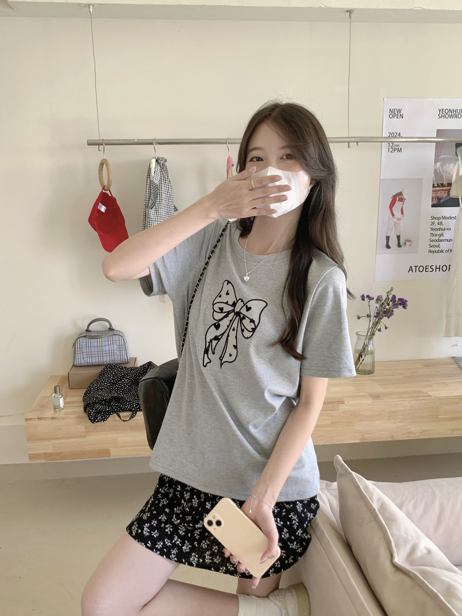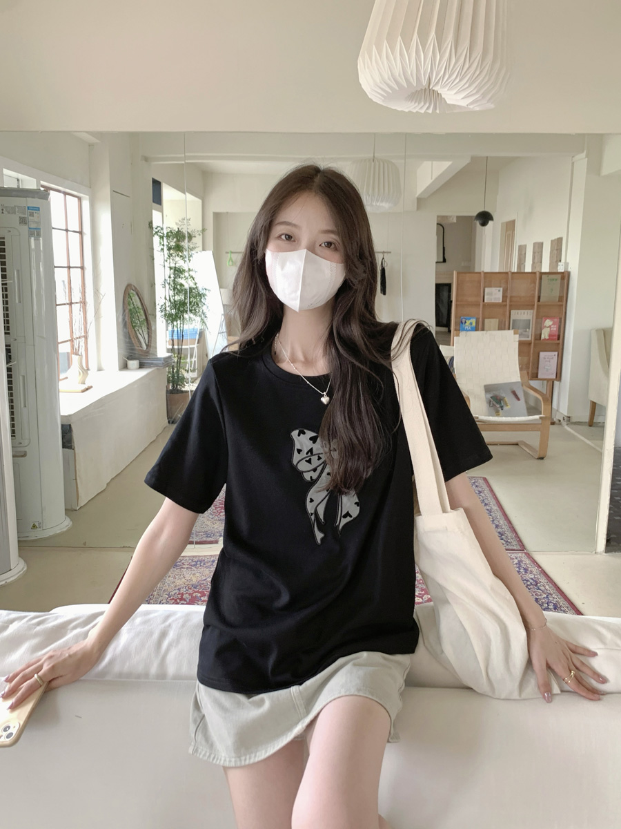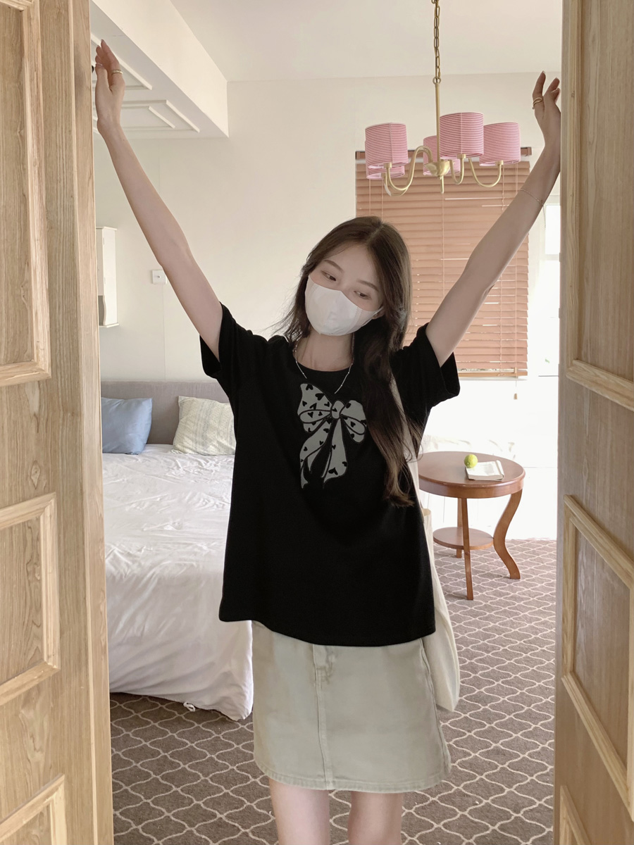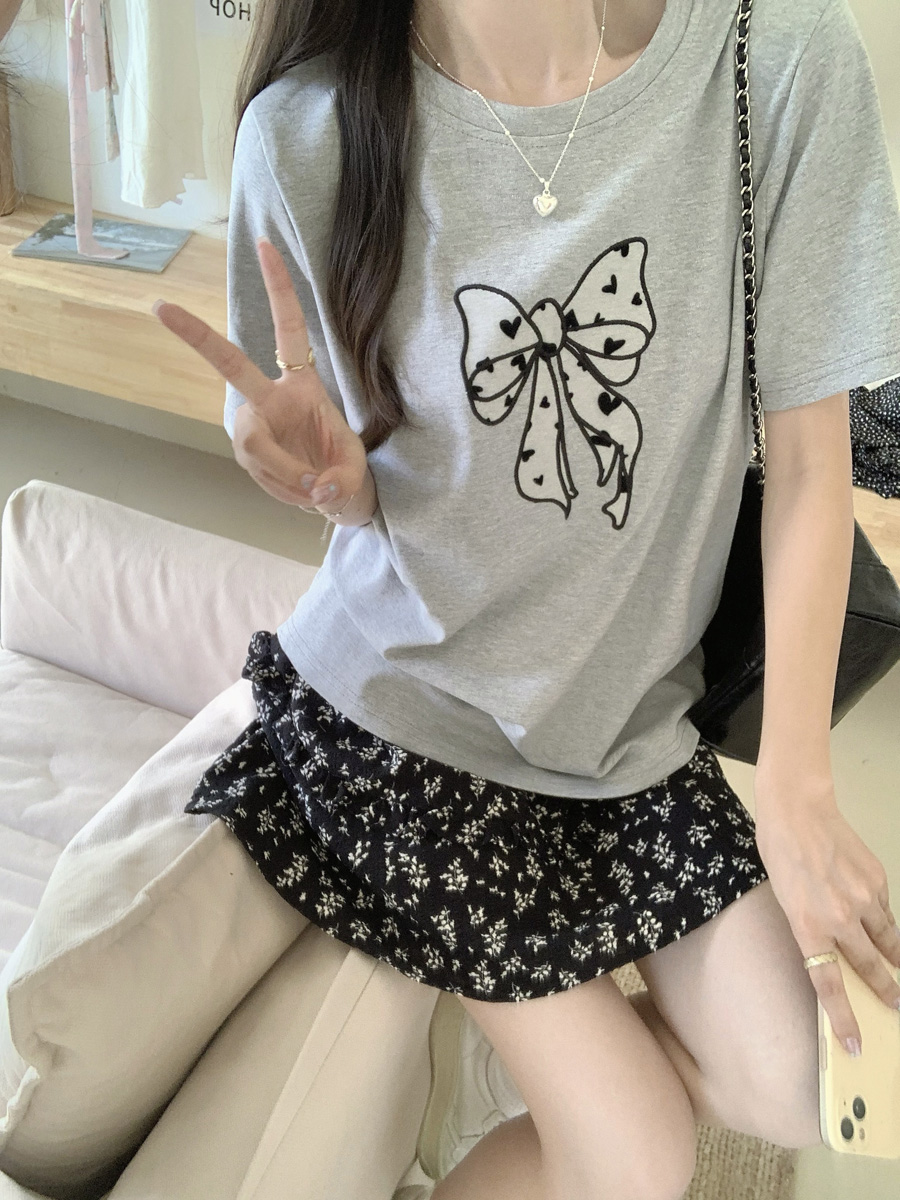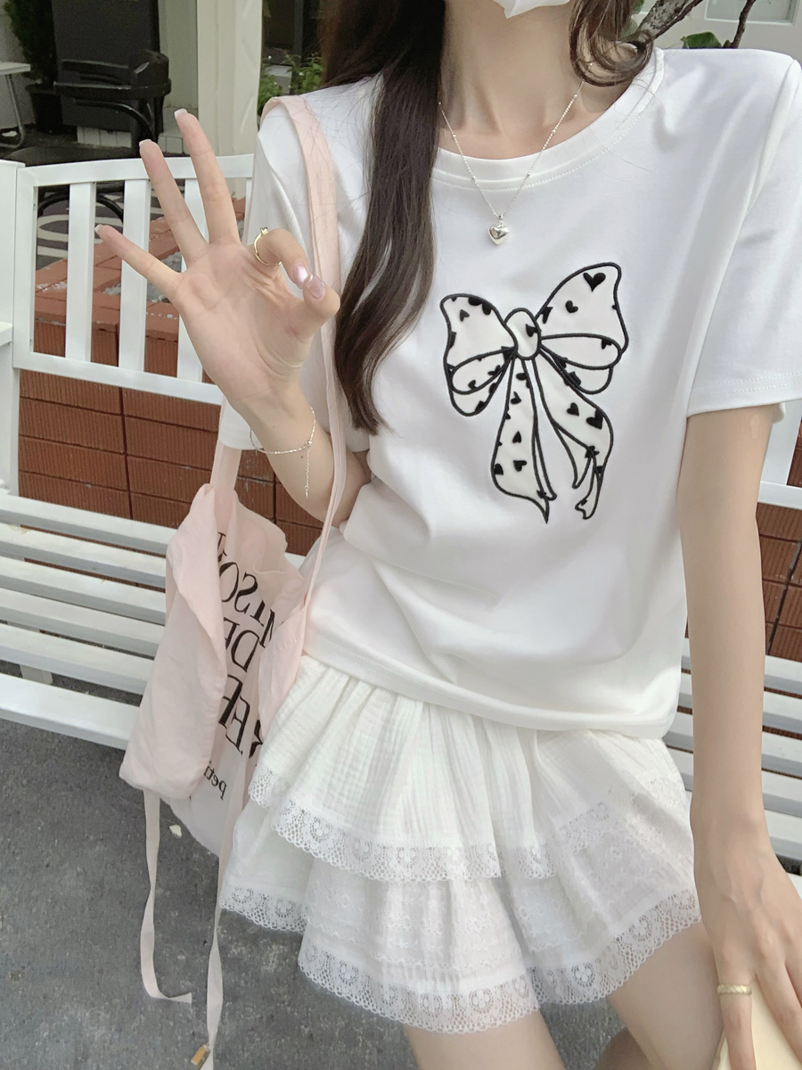 RY130# 实拍纯棉减龄甜美爱心蝴蝶结贴布短袖t恤女爆款宽松显瘦打底上衣