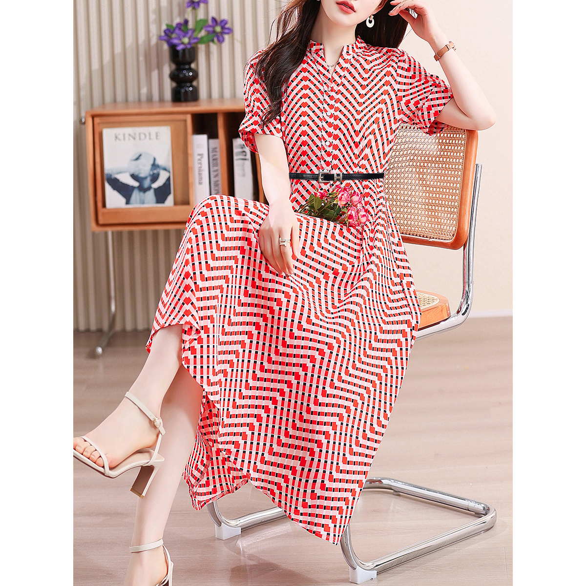 RY445# 实拍 红色格纹连衣裙女夏季新款中长款印花收腰显瘦气质雪纺裙子