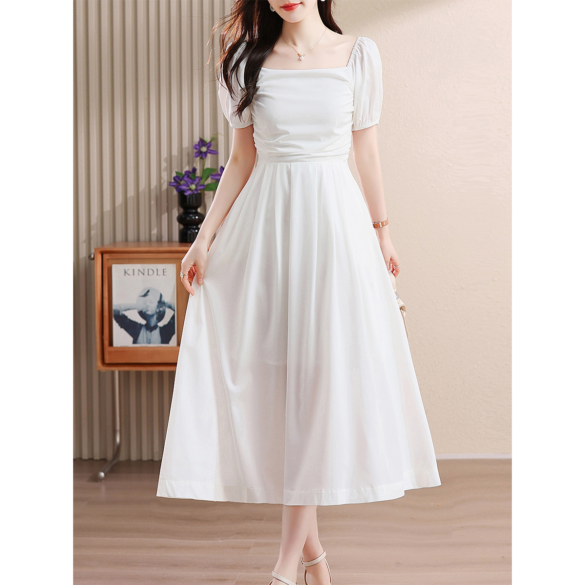 RY446# 实拍白色温柔系收腰连衣裙女夏季新款方领气质一字肩法式初恋长裙