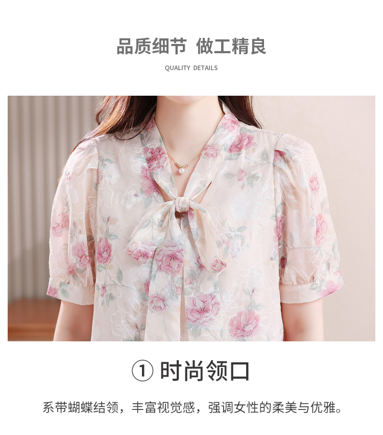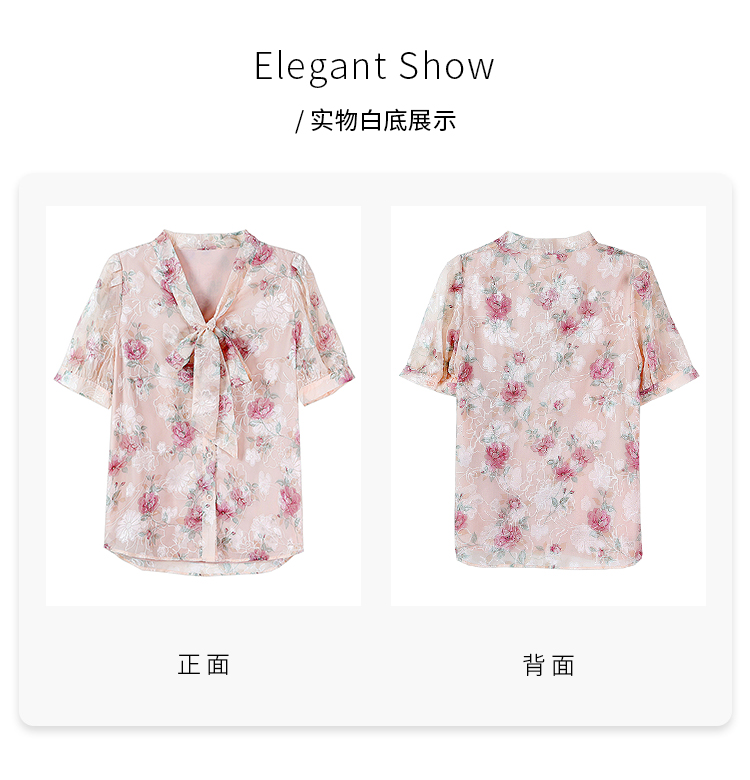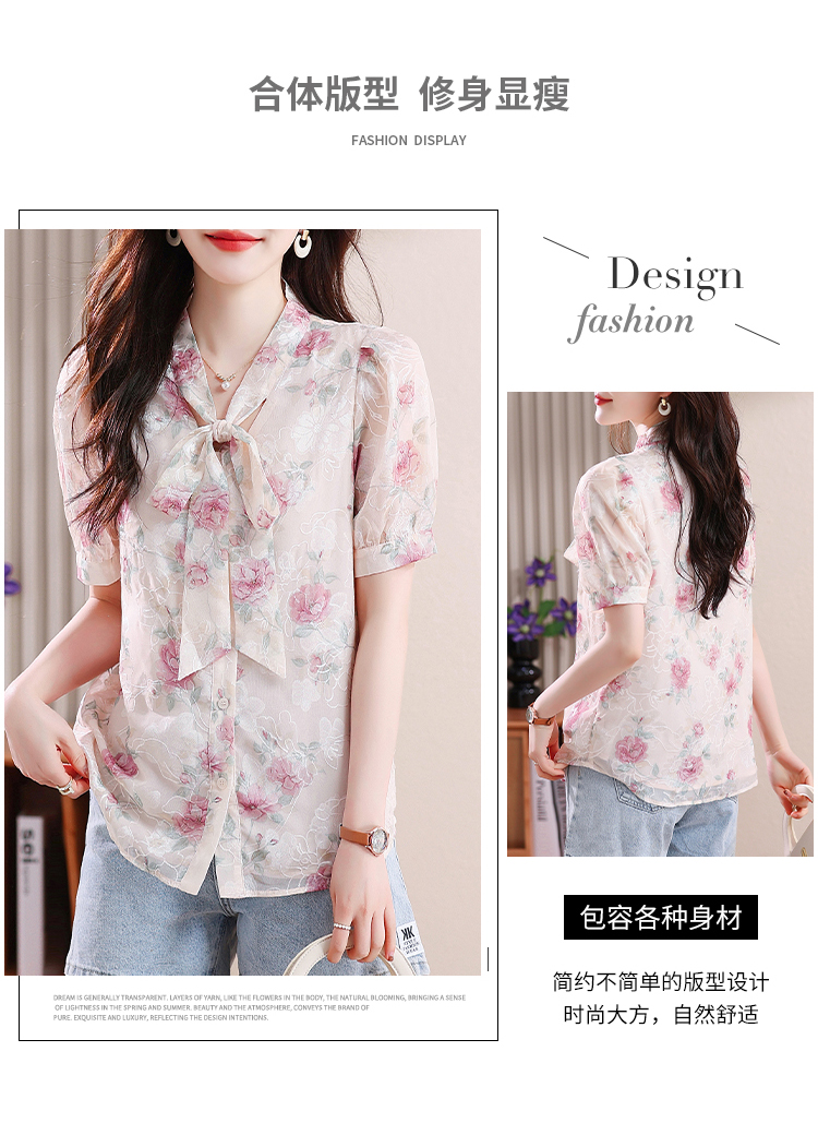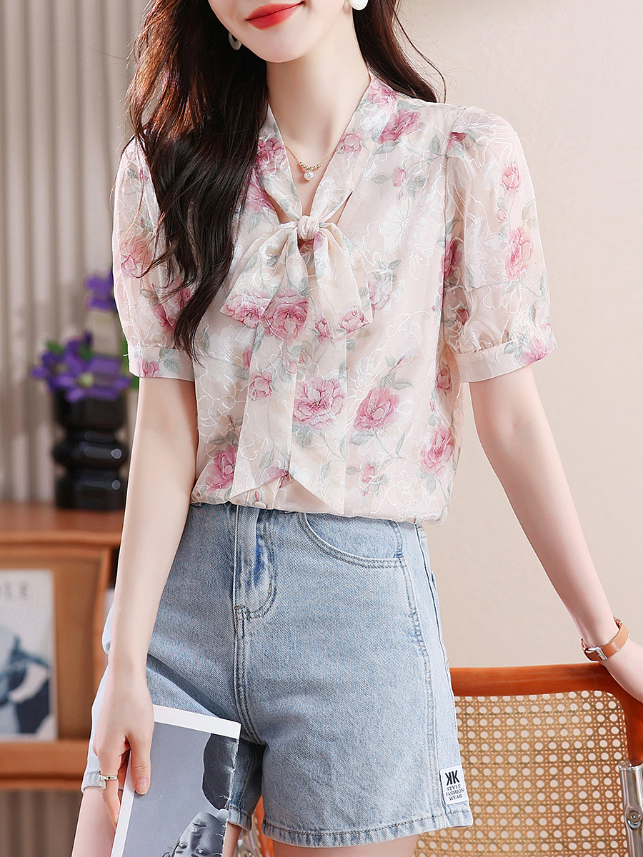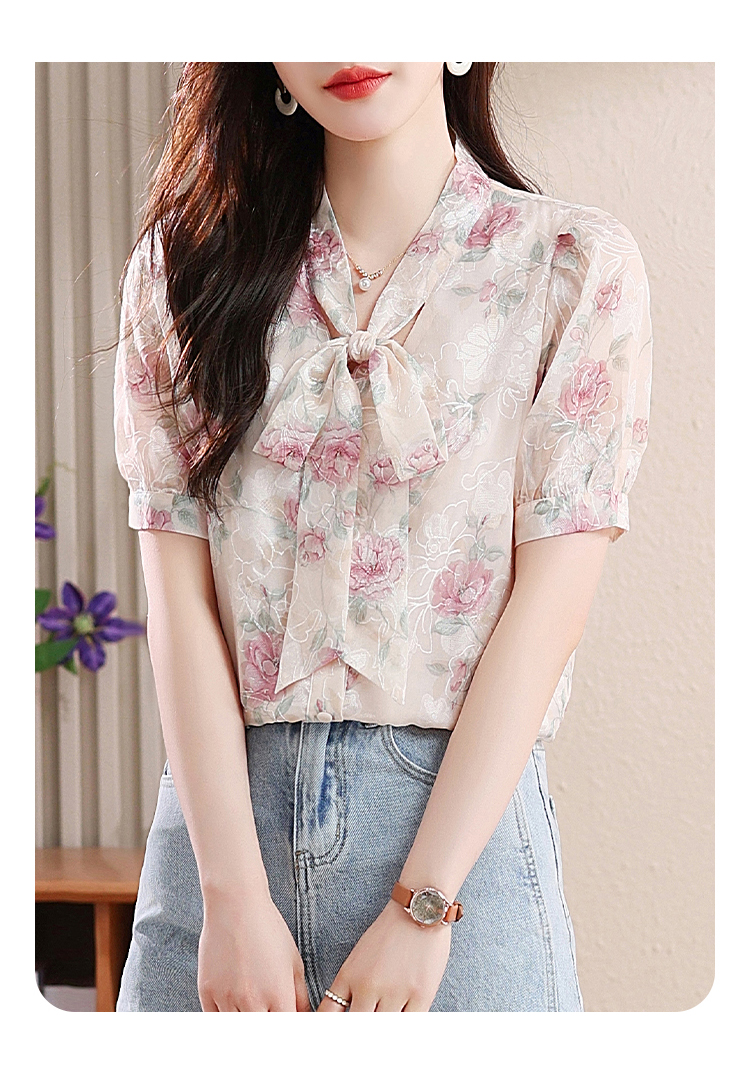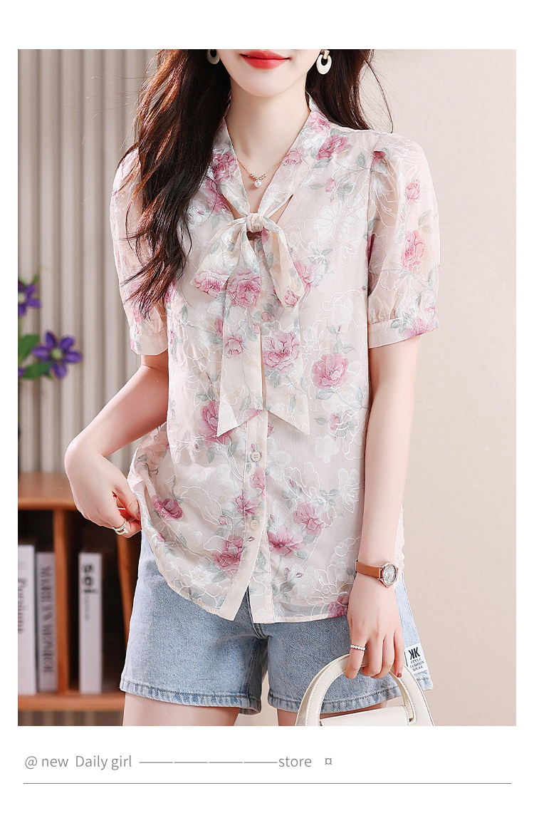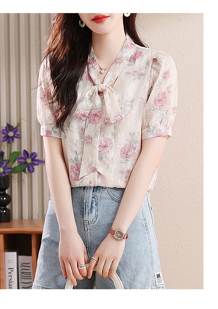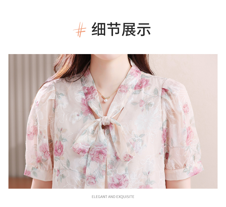 RY448# 实拍泡泡袖法式衬衫女2026年夏季新款蝴蝶结绣花短袖雪纺上衣