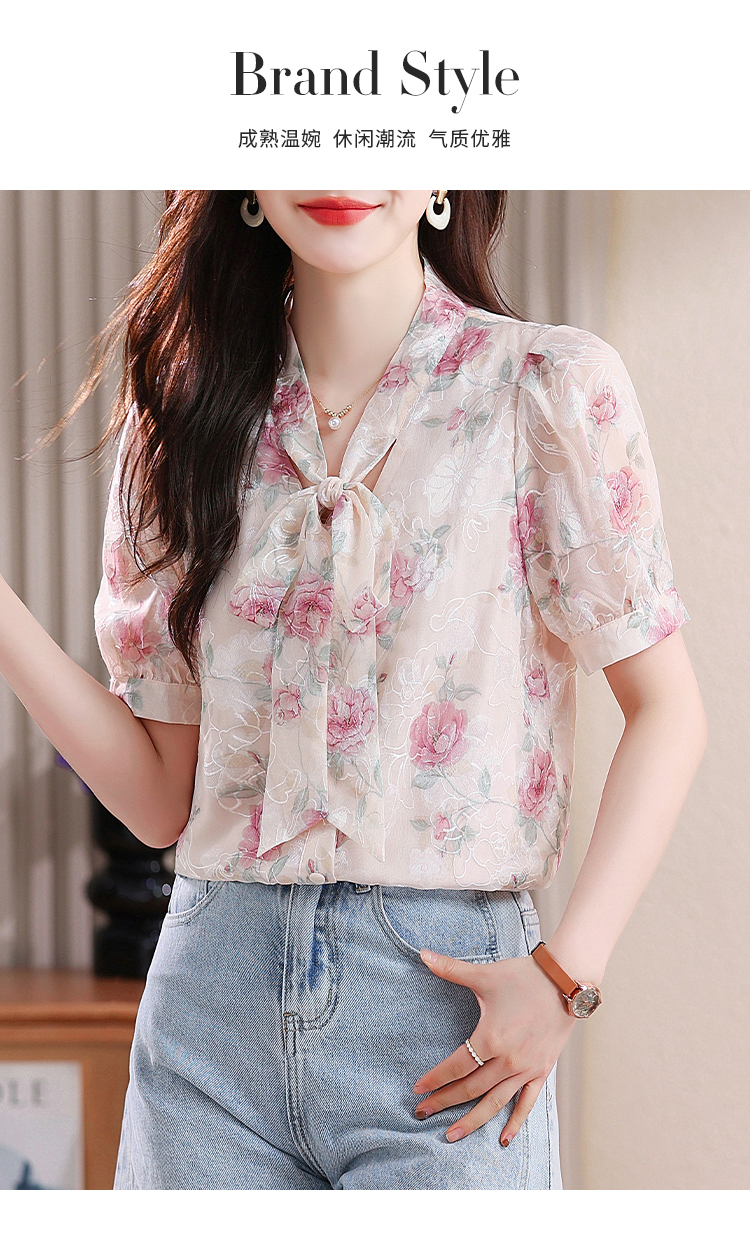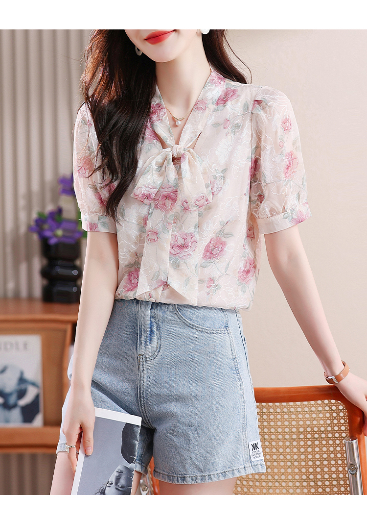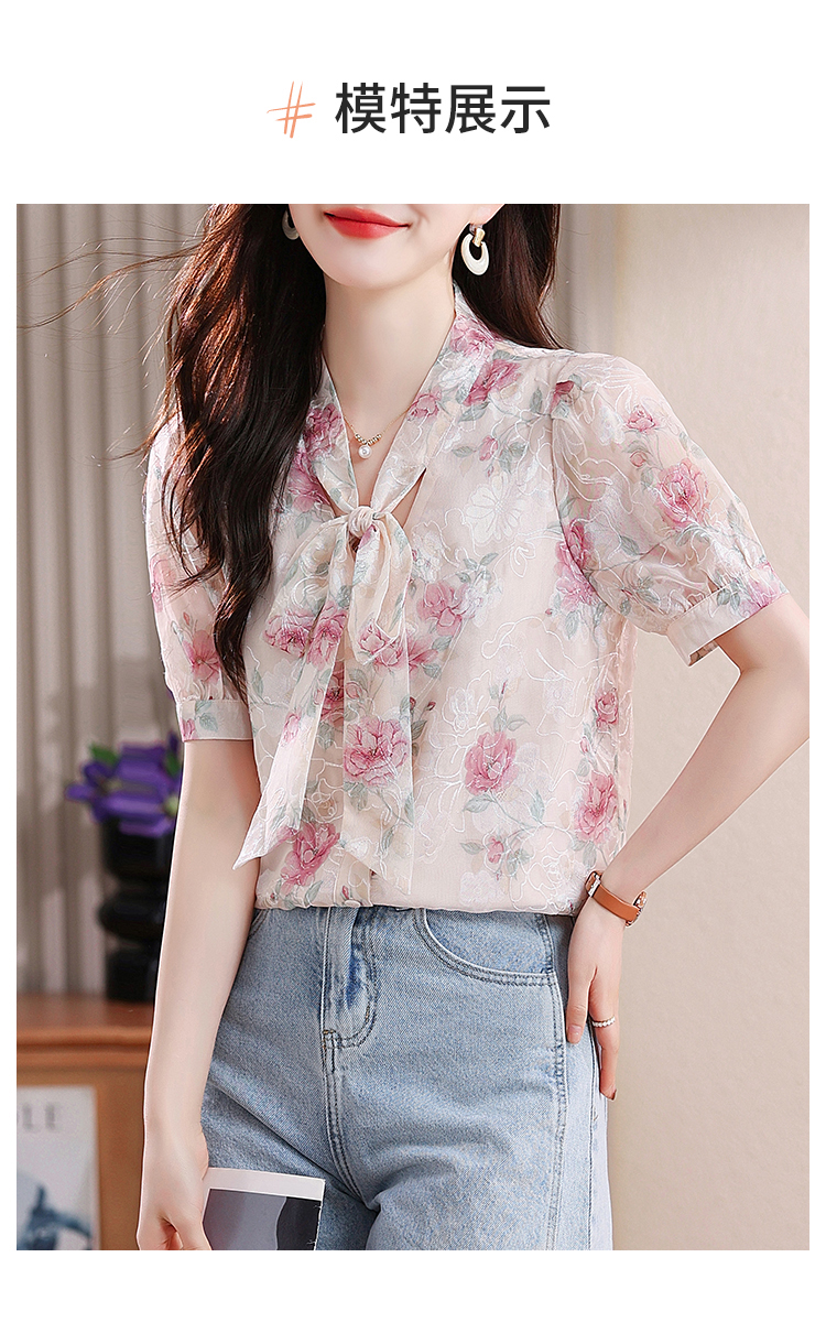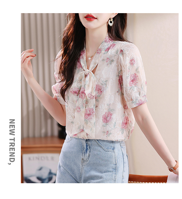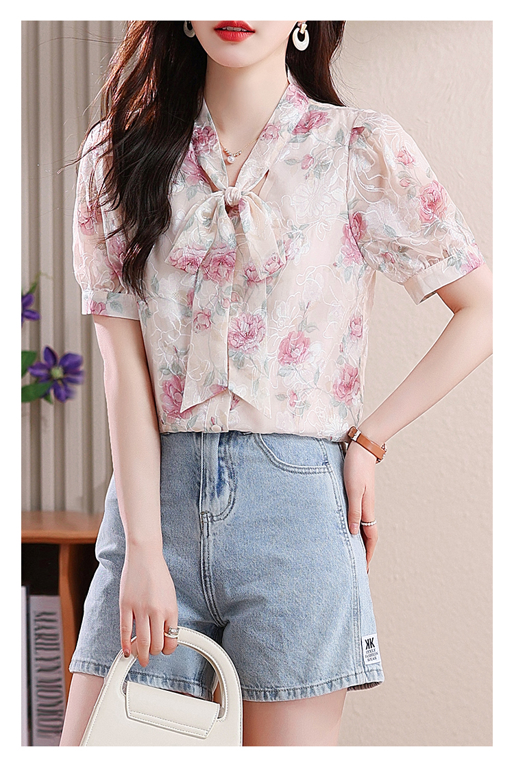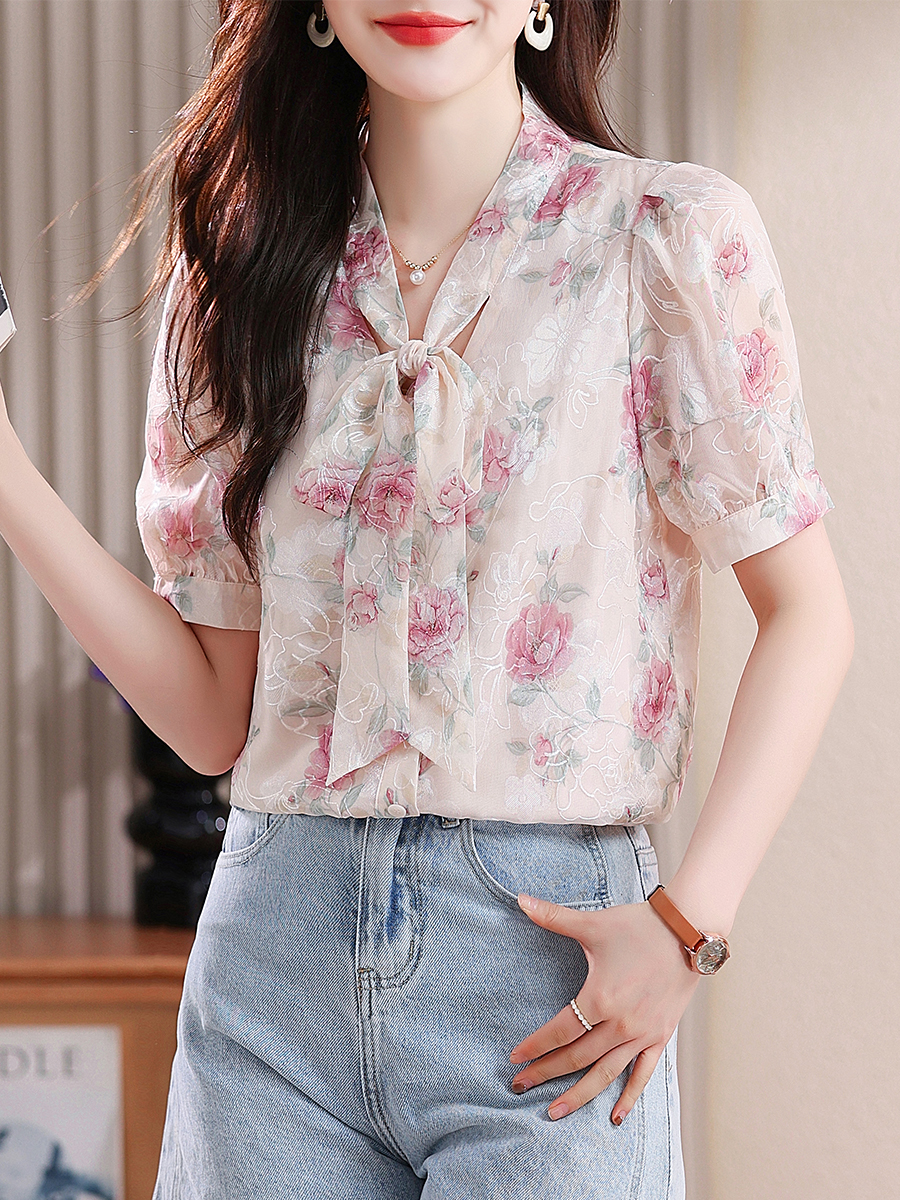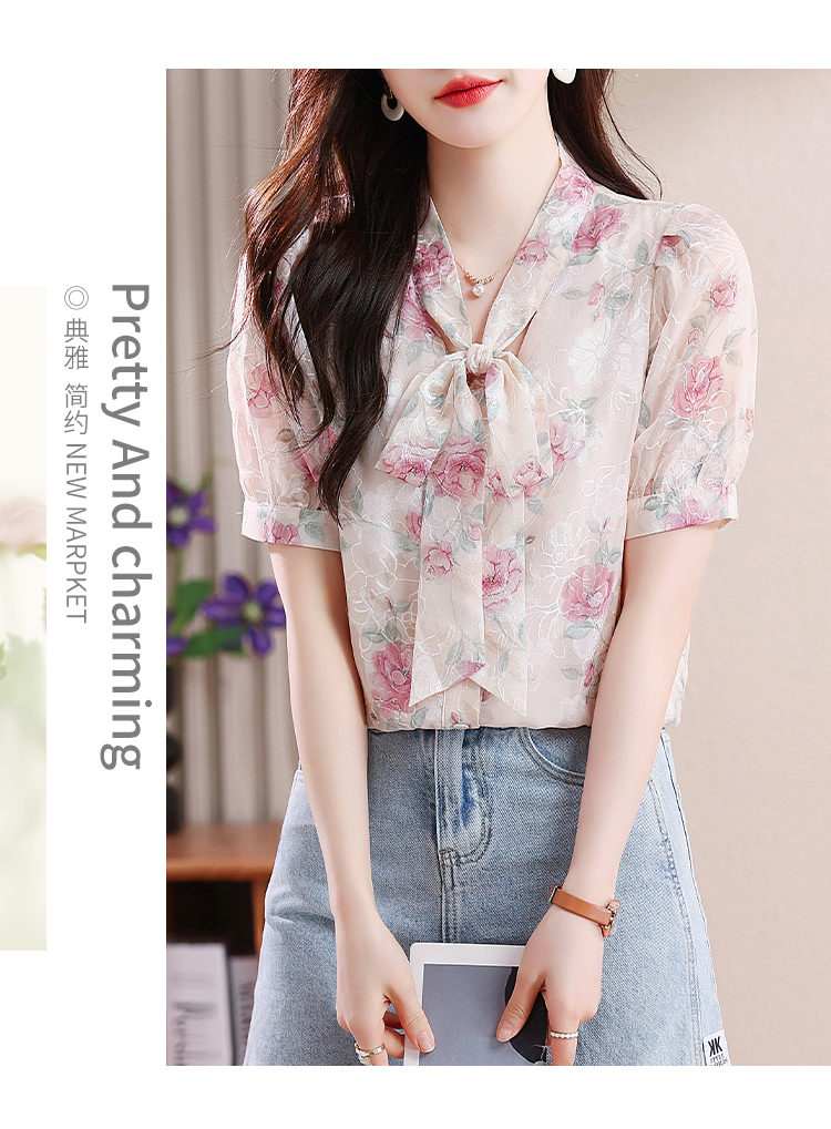 RY448# 实拍泡泡袖法式衬衫女2026年夏季新款蝴蝶结绣花短袖雪纺上衣