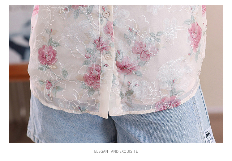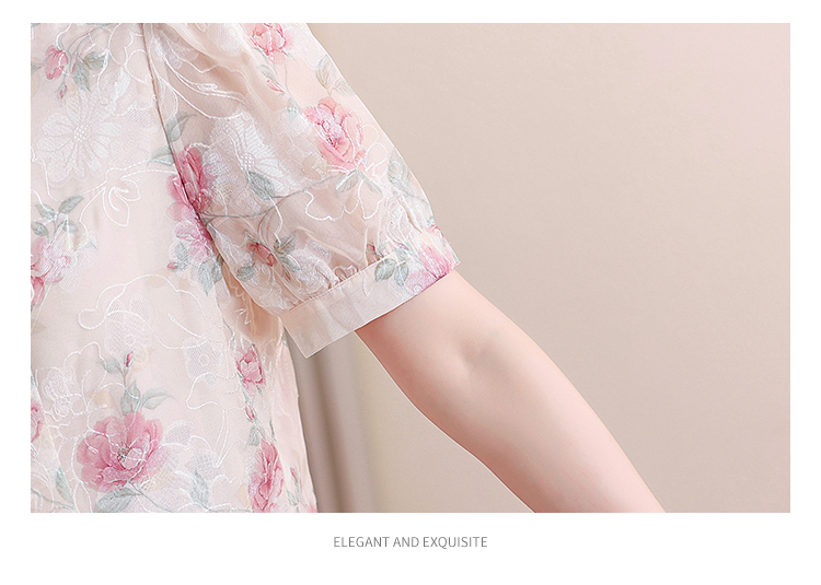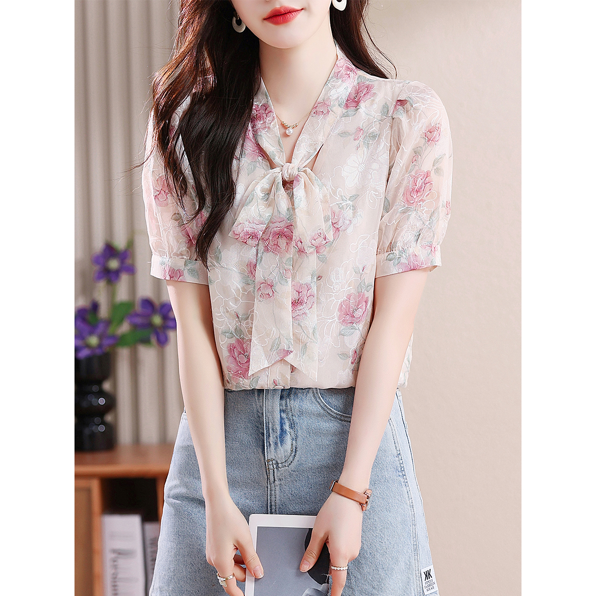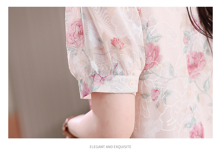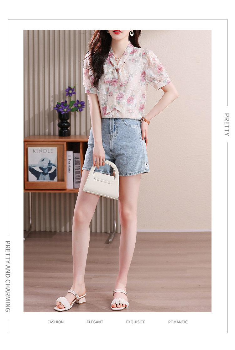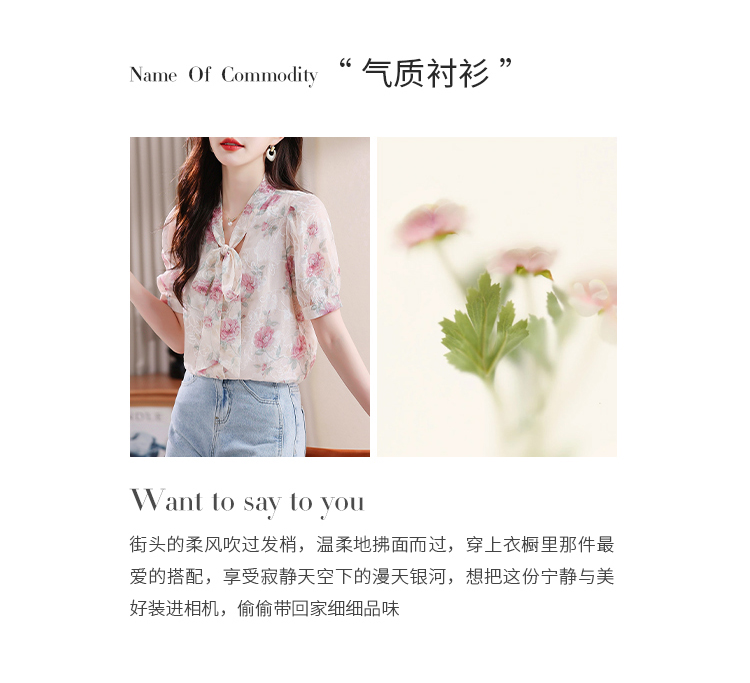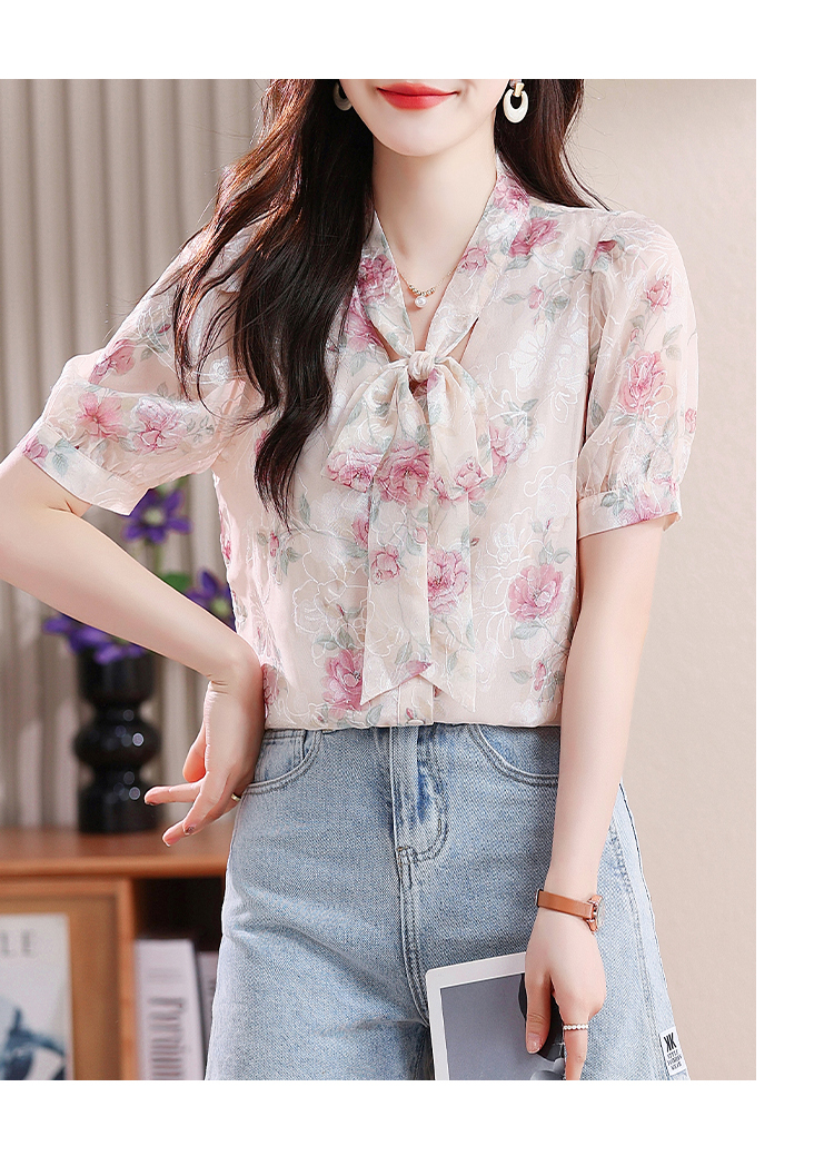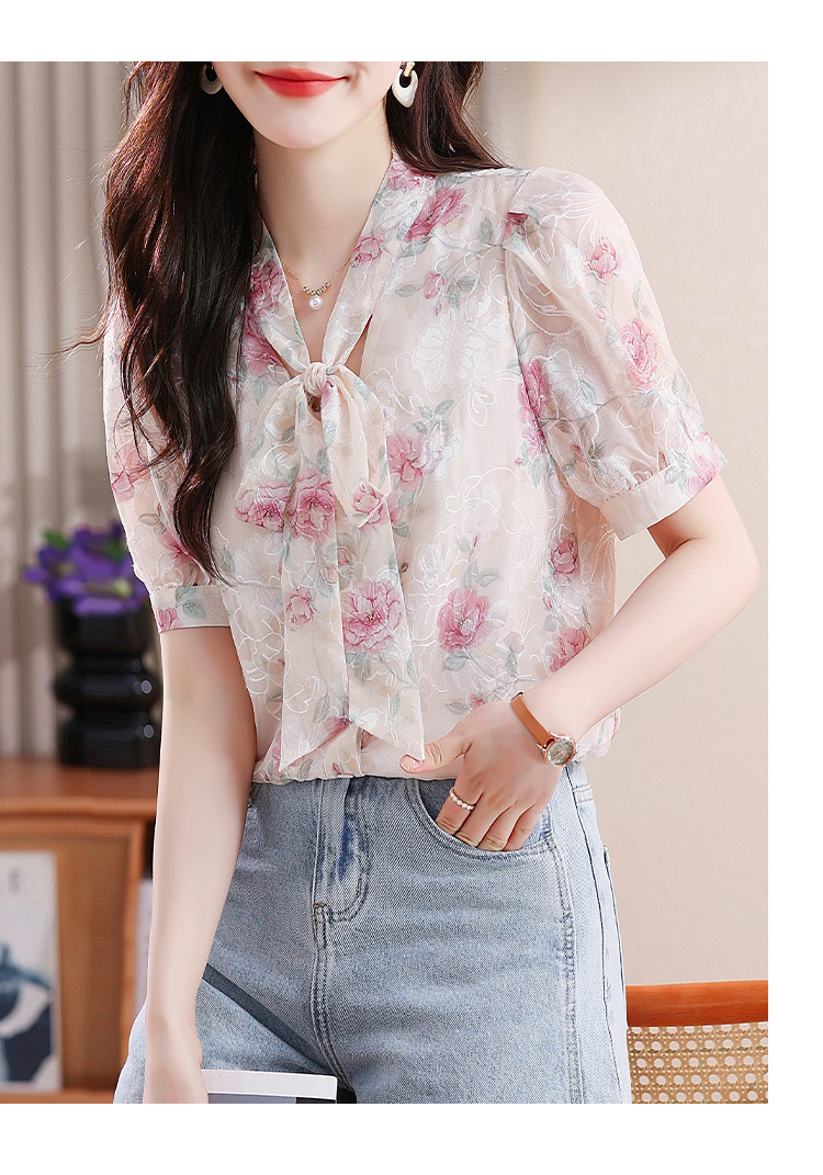 RY448# 实拍泡泡袖法式衬衫女2026年夏季新款蝴蝶结绣花短袖雪纺上衣