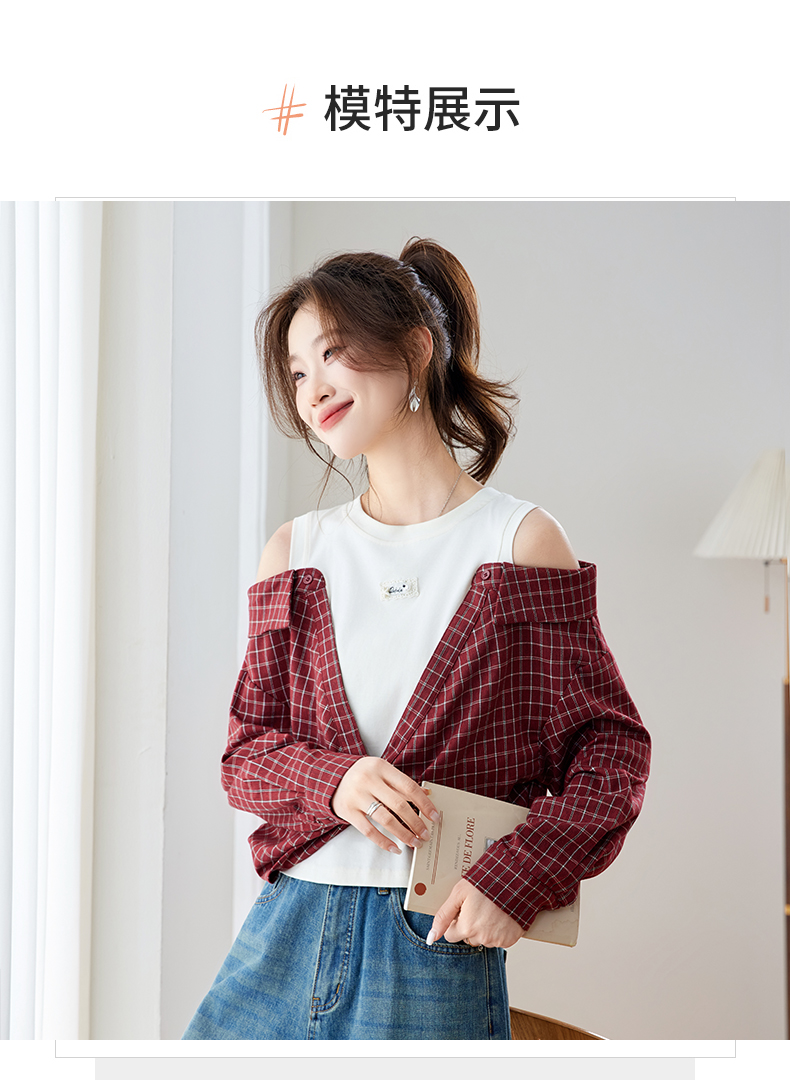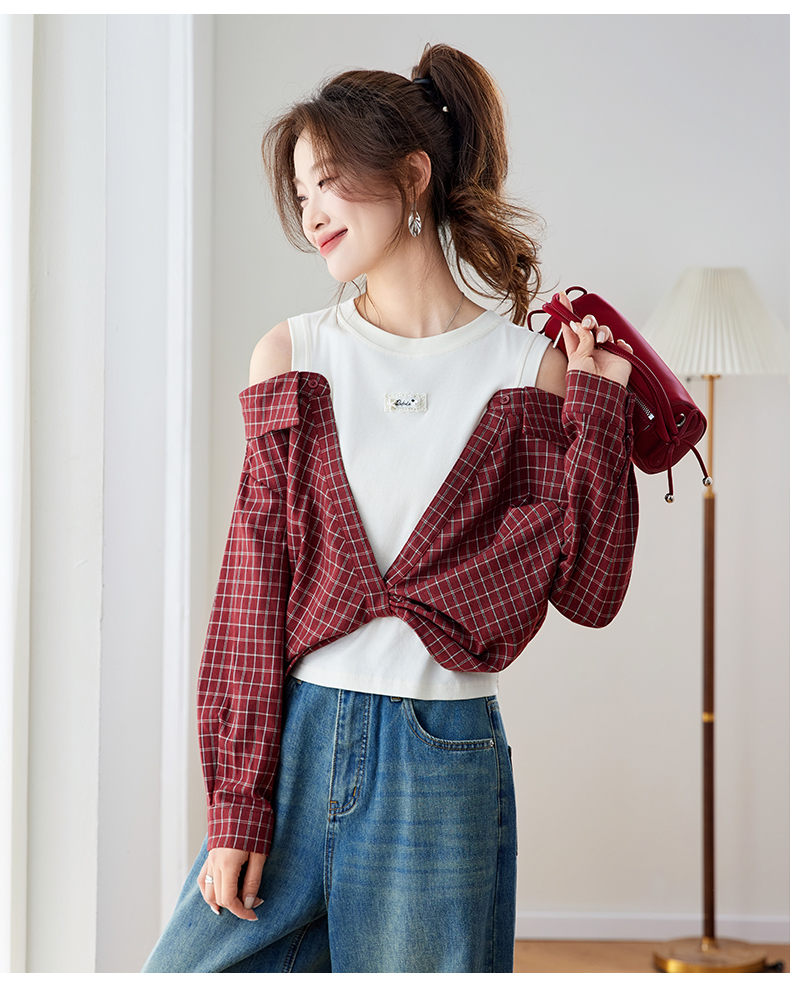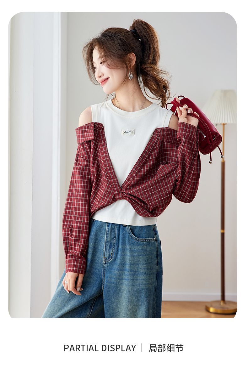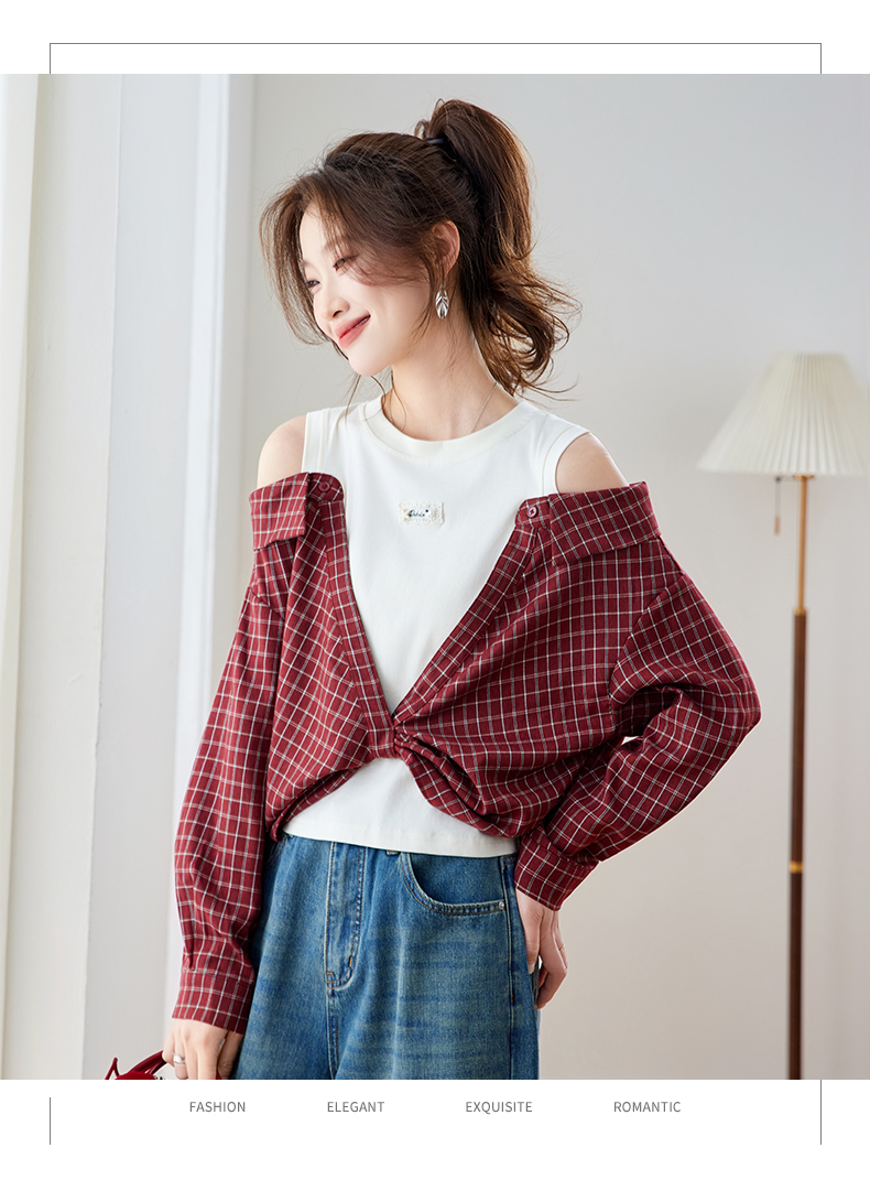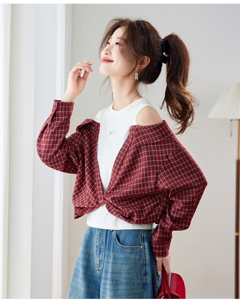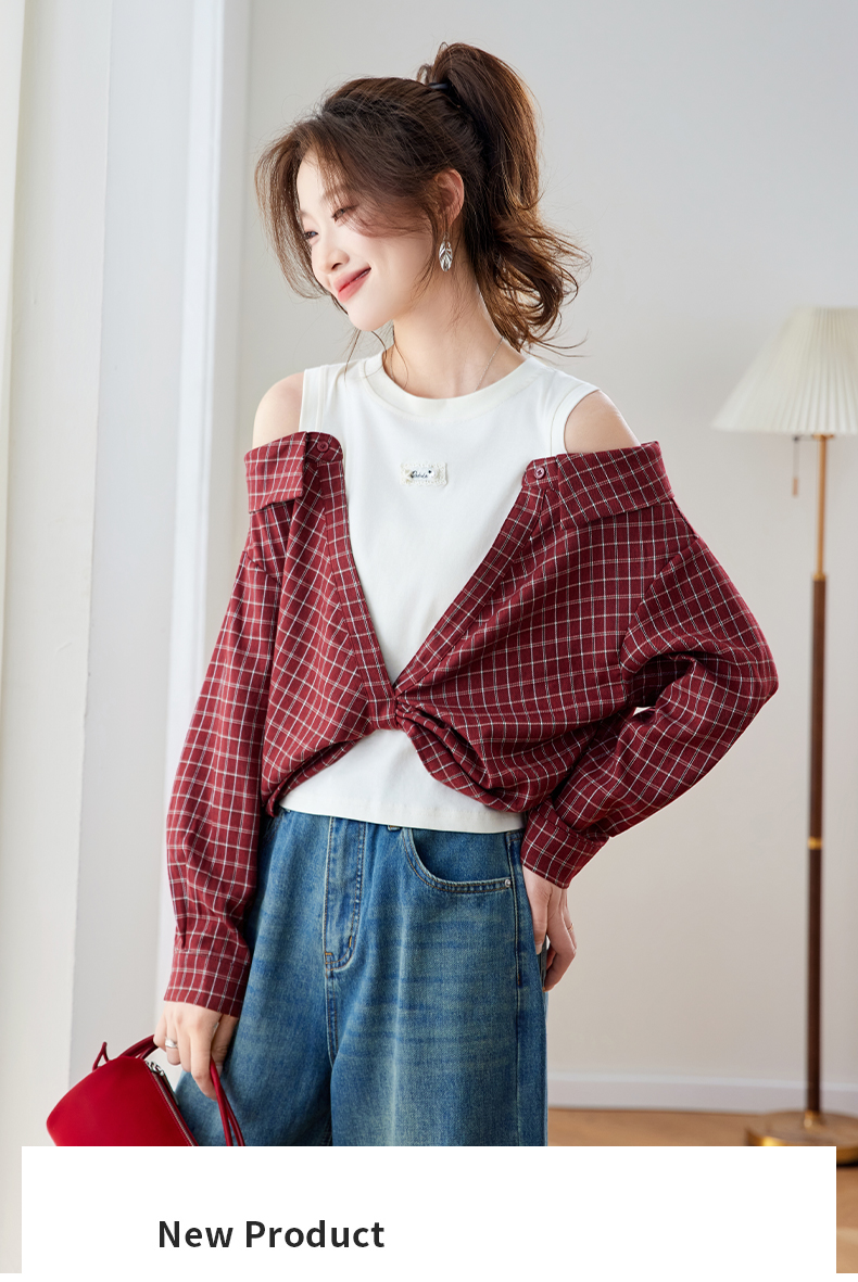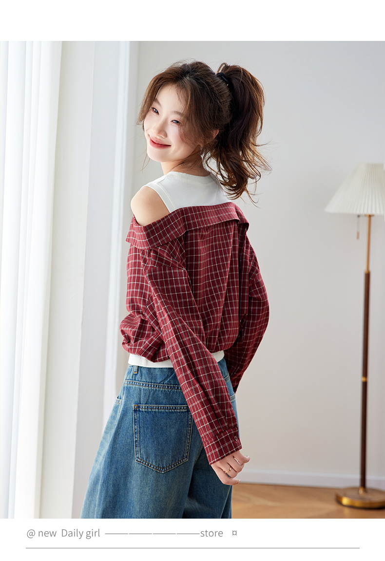 RY461# 温绒絮语春季新款假两件拼接红色露肩格子衬衫女宽松长袖上衣