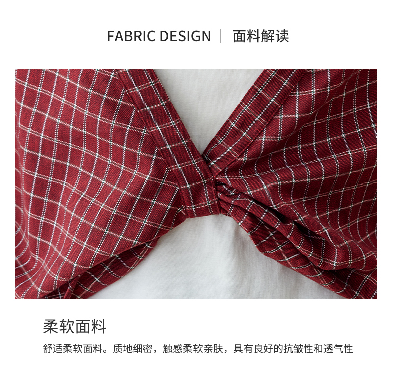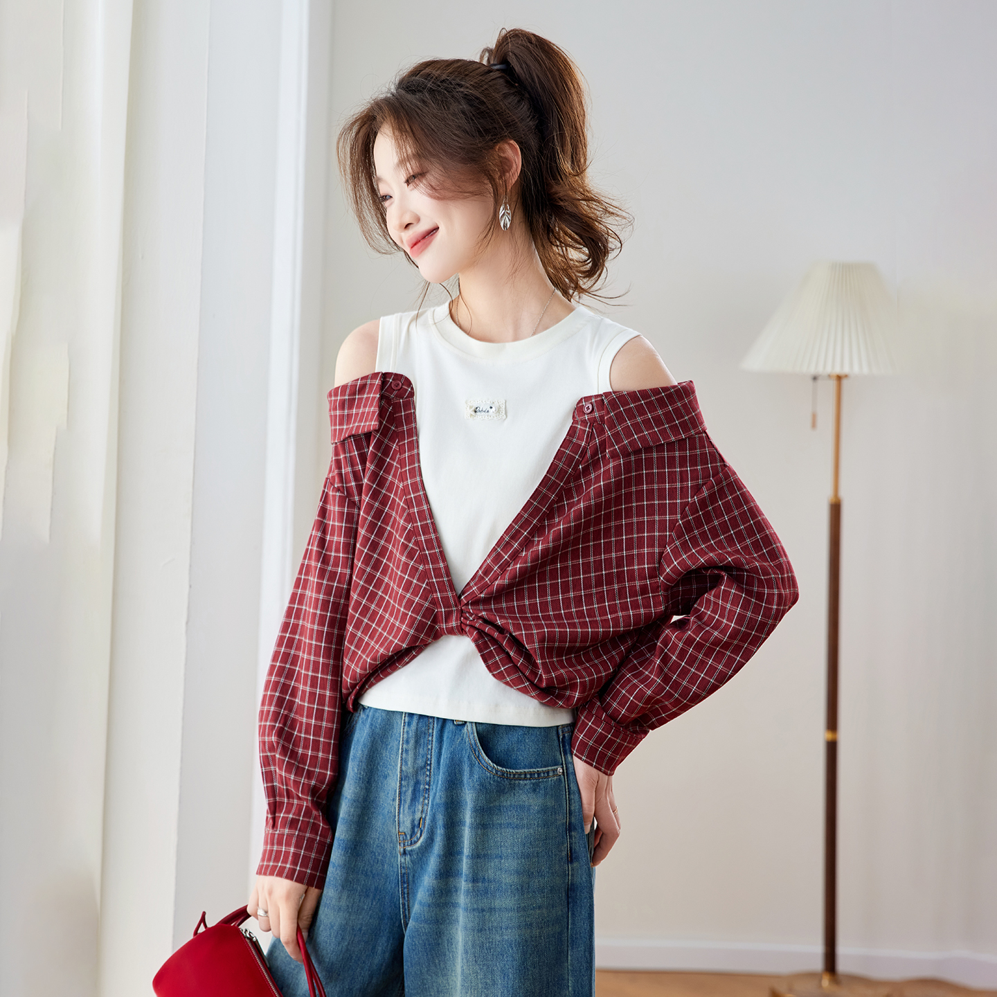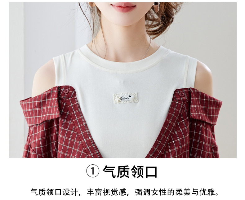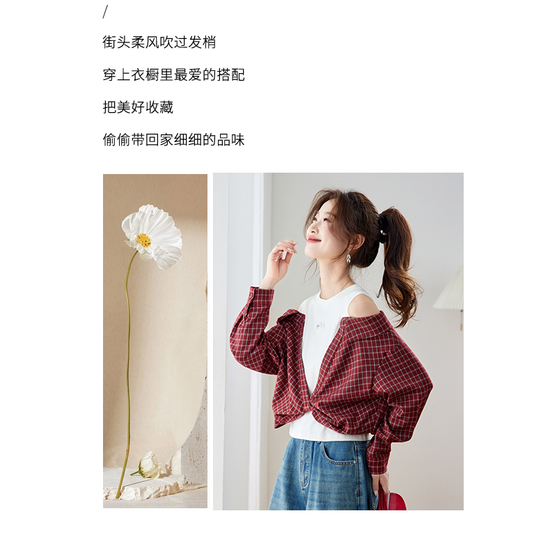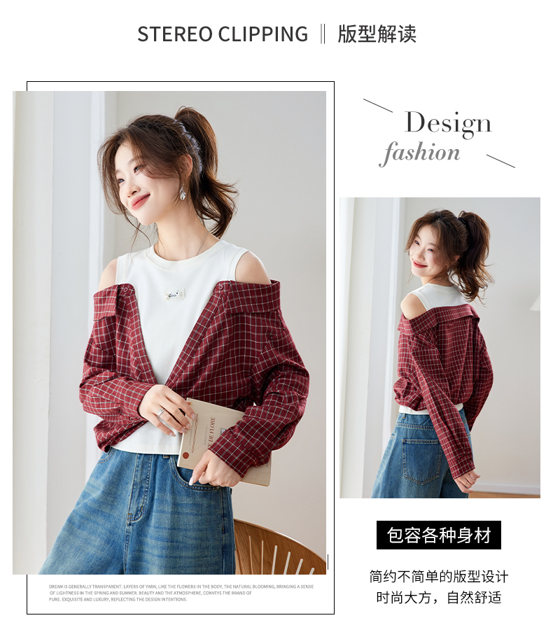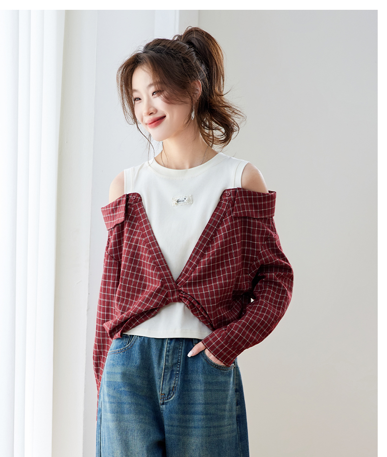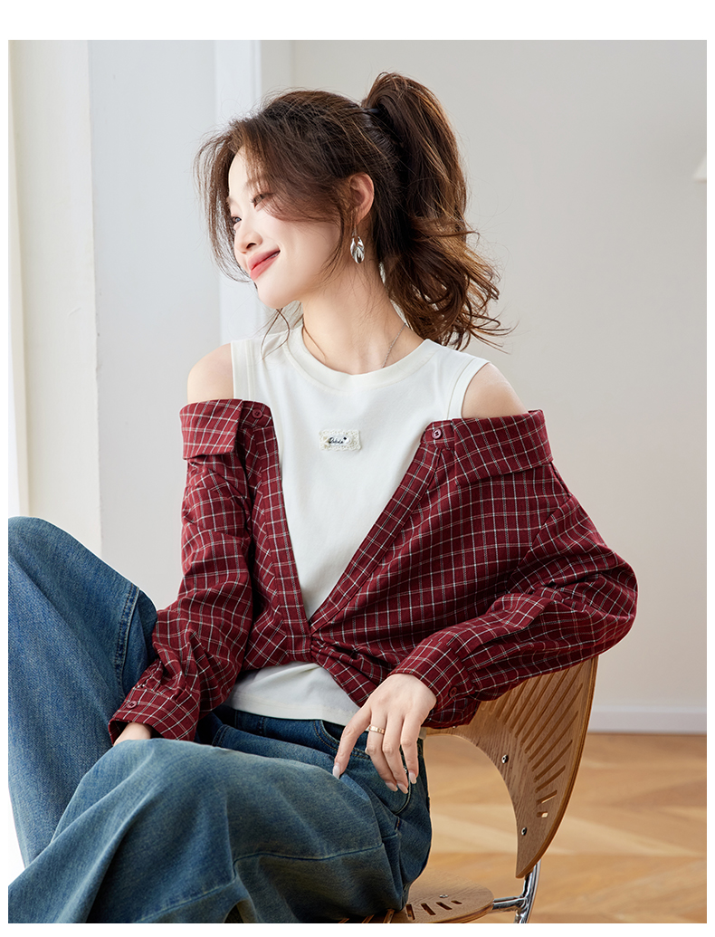 RY461# 温绒絮语春季新款假两件拼接红色露肩格子衬衫女宽松长袖上衣