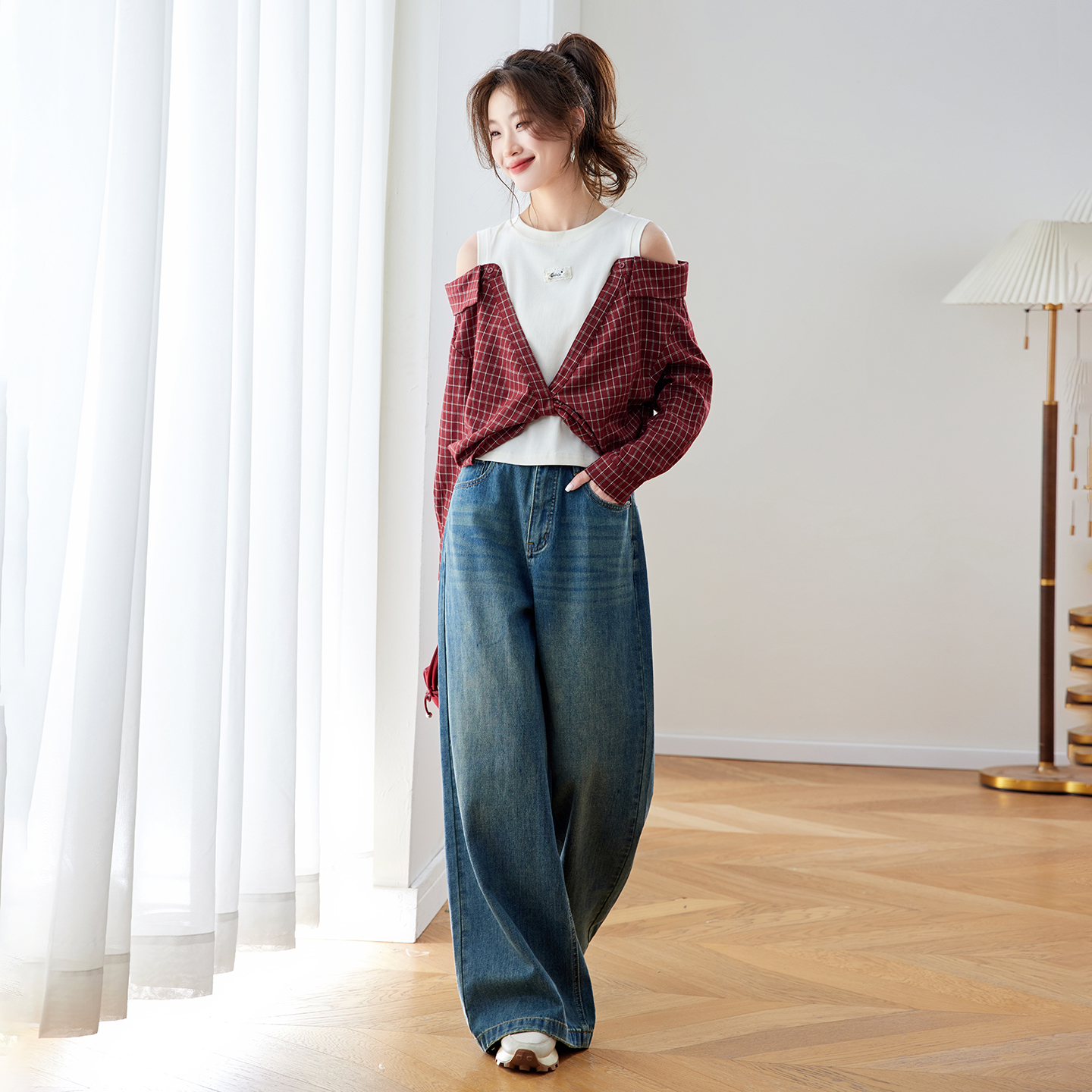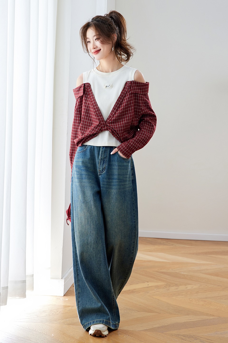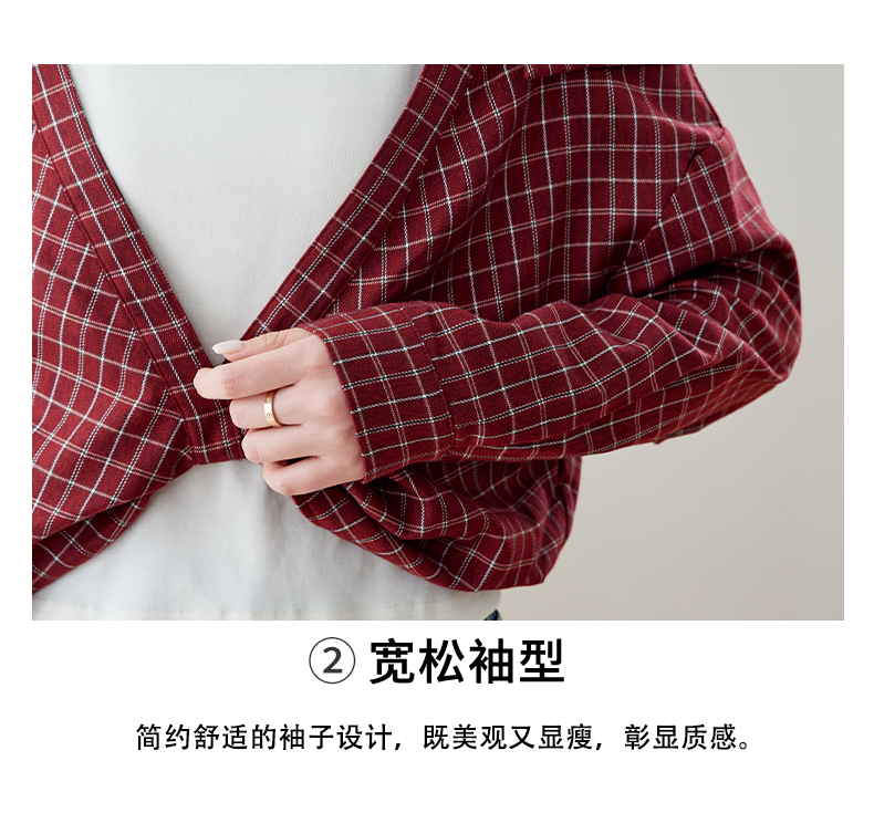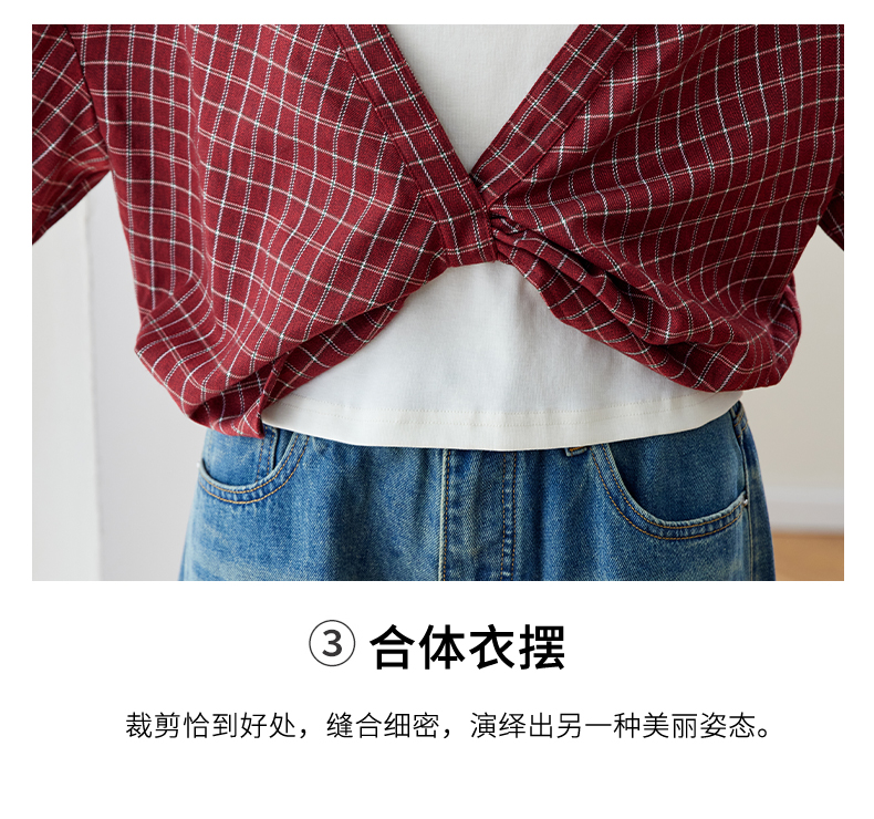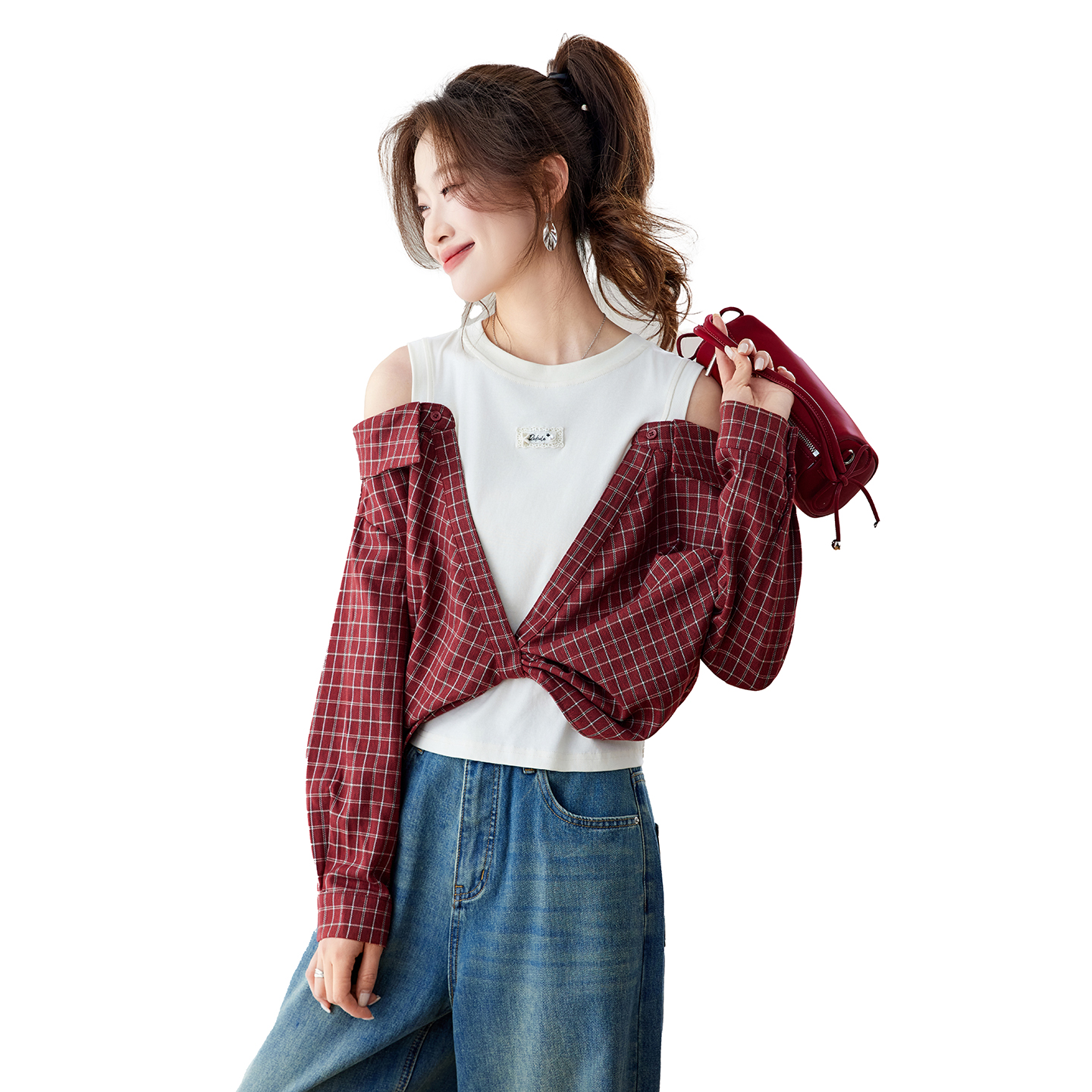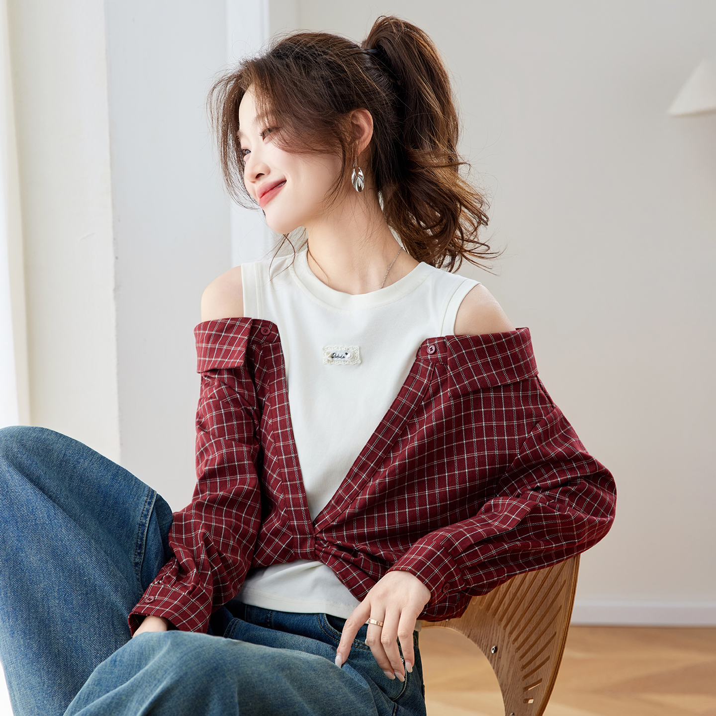 RY461# 温绒絮语春季新款假两件拼接红色露肩格子衬衫女宽松长袖上衣