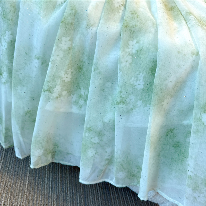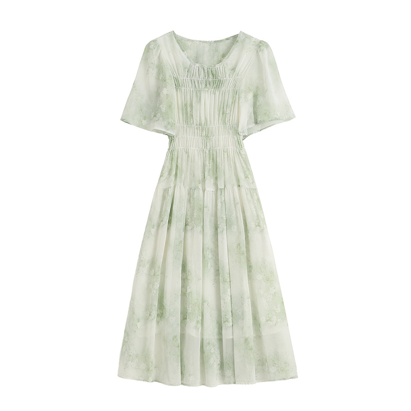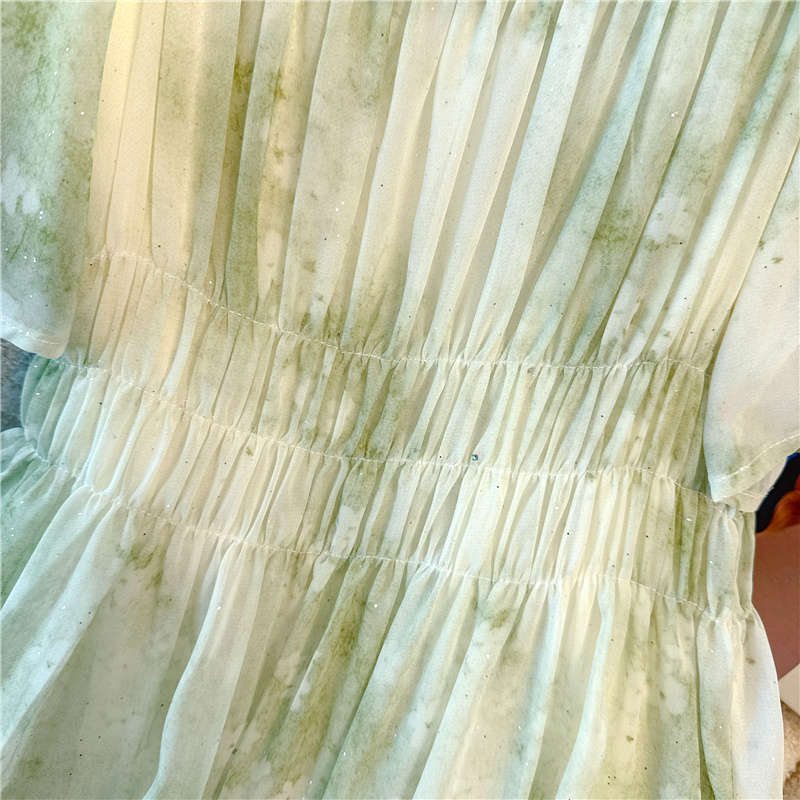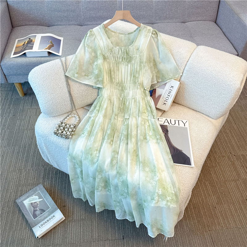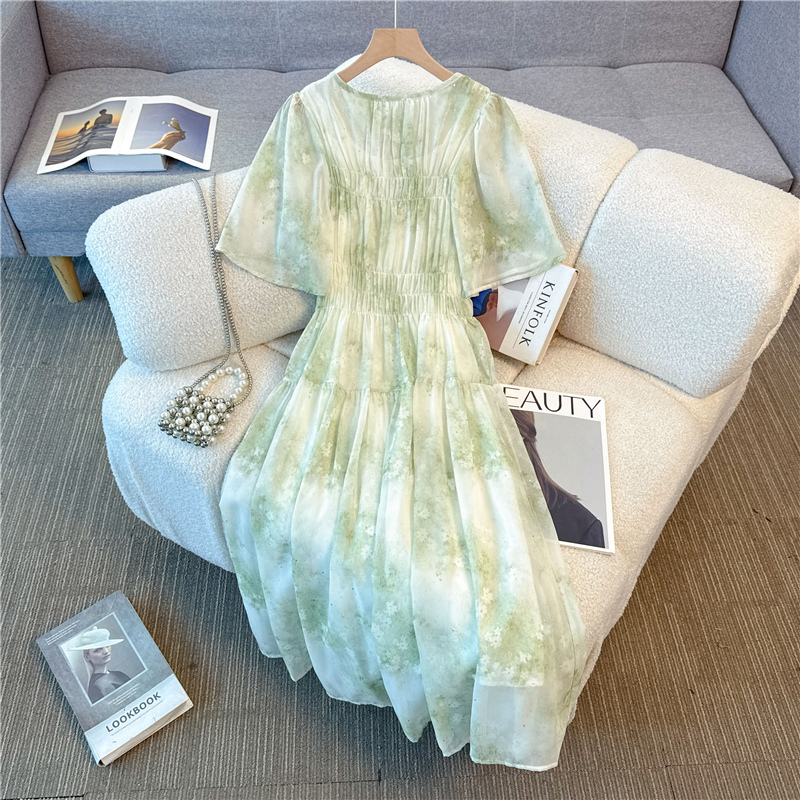 RY484# 实拍~小清新绿色烫金大码胖mm100-220斤显白高腰显瘦中长款连衣裙