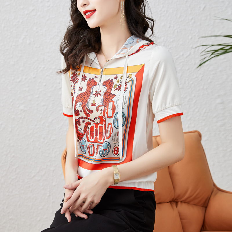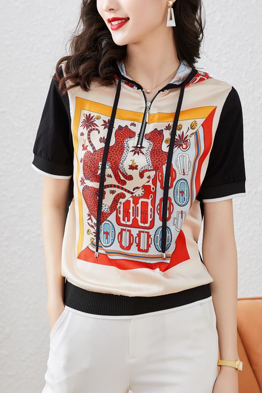 RY760# 高端仿真丝印花女夏2026新款连帽拼接卫衣防嗮半袖外搭上衣