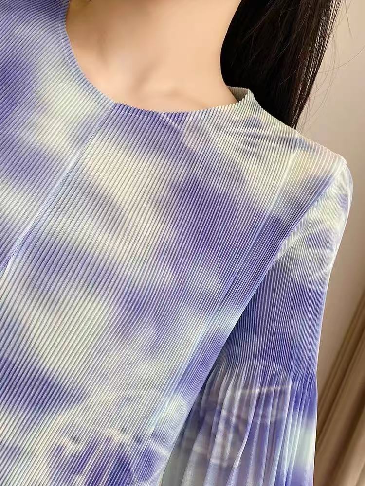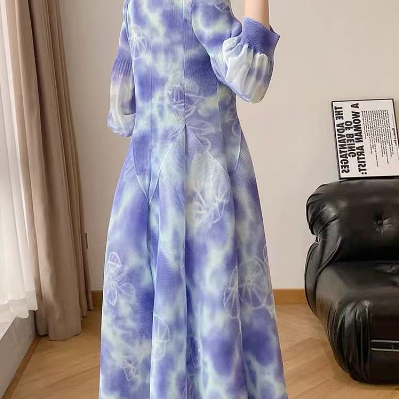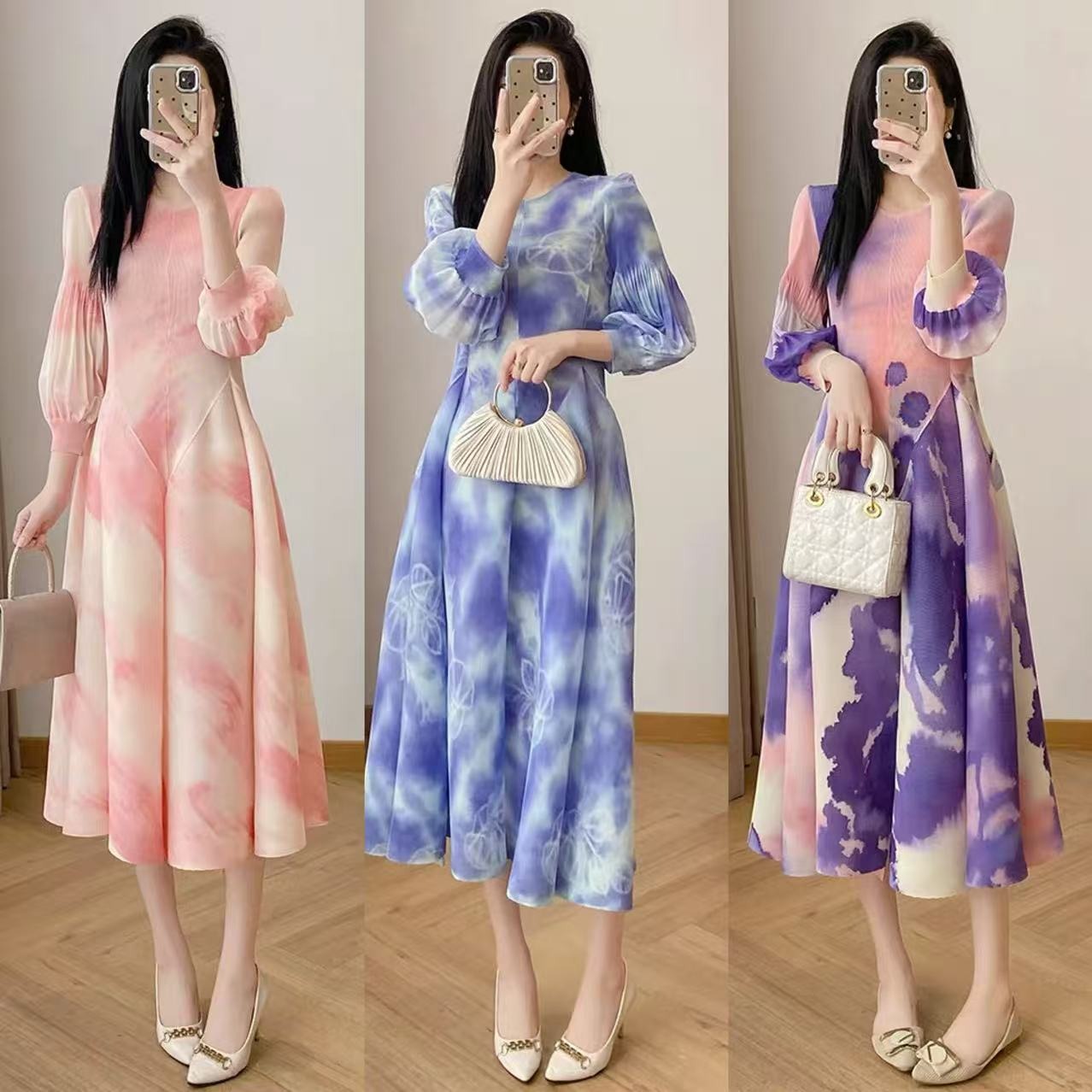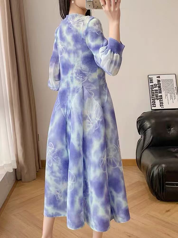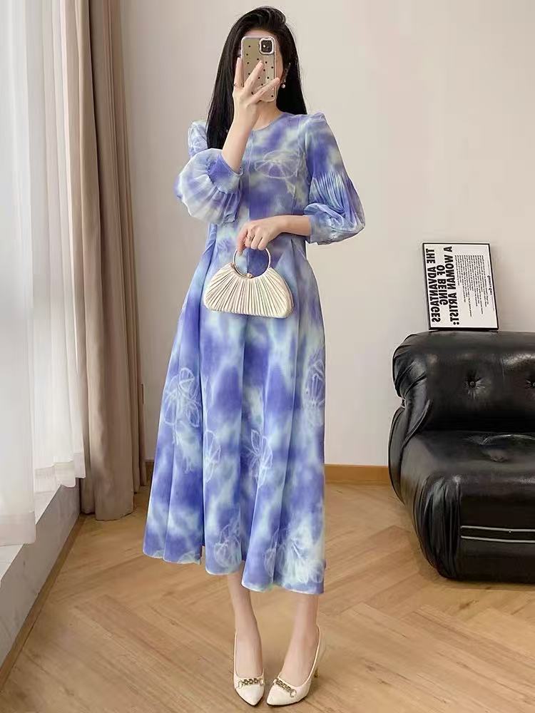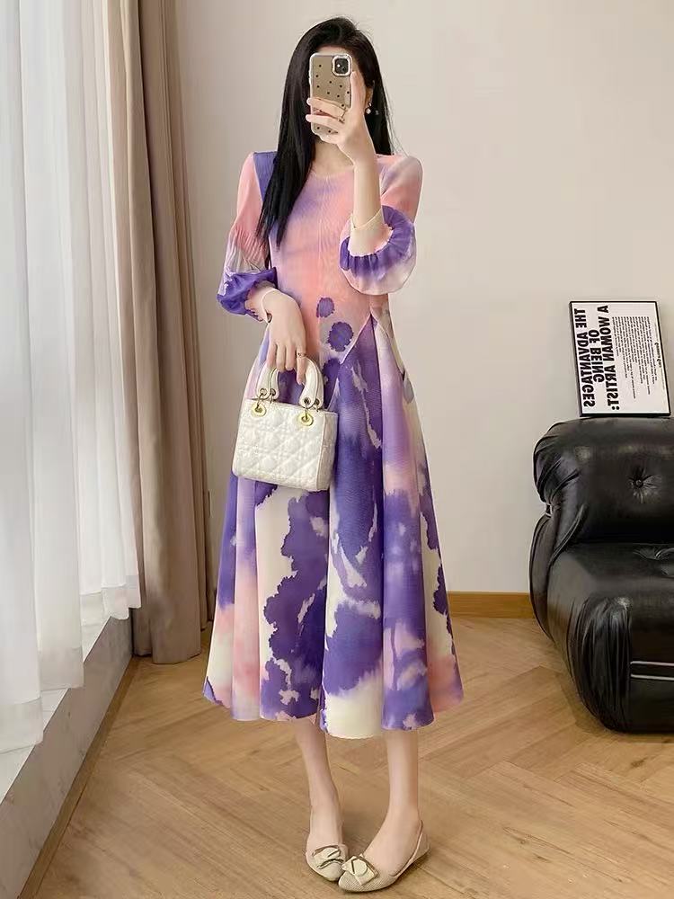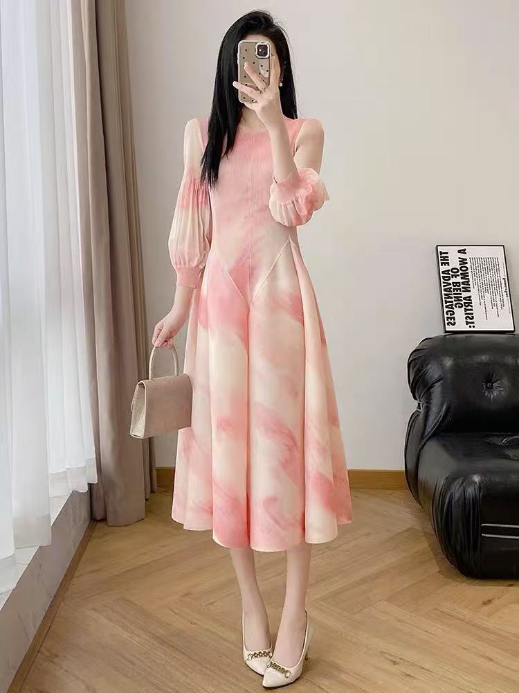 RY799# 宫廷风褶皱连衣裙2026早春新款收腰渐变色显瘦花苞法式茶歇A字裙
