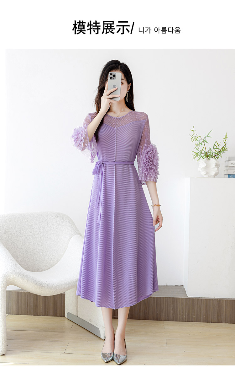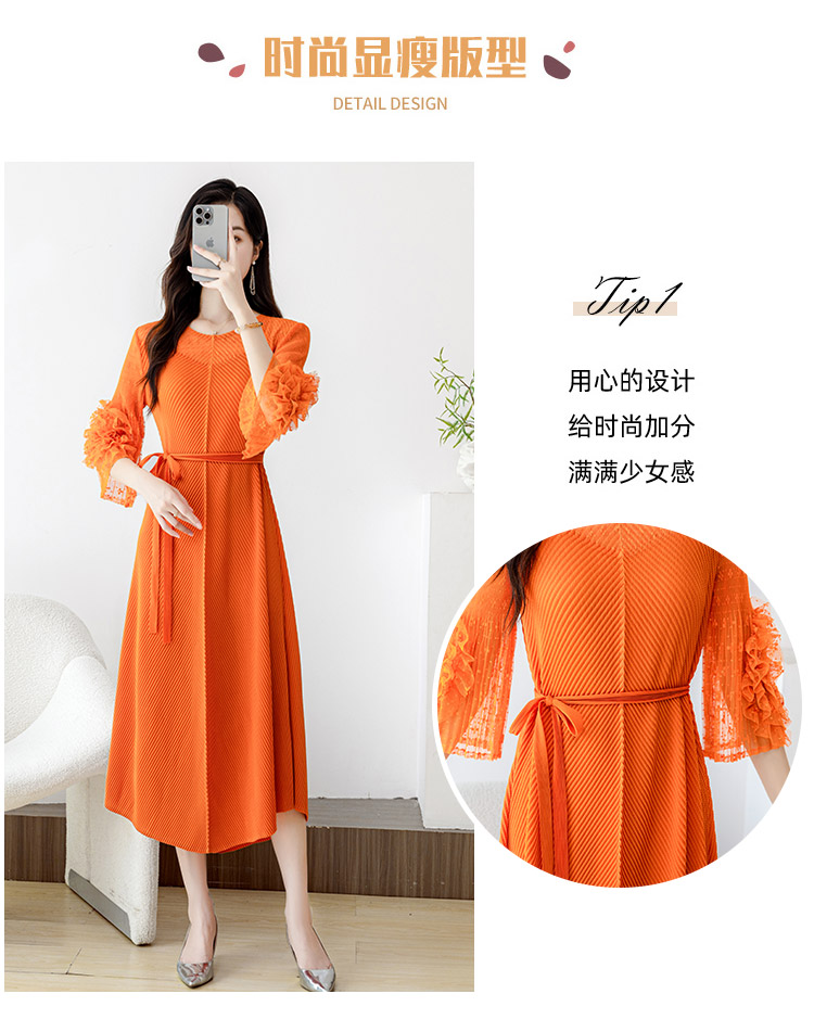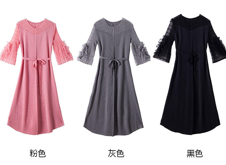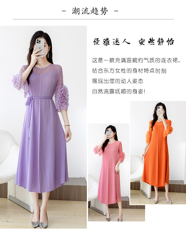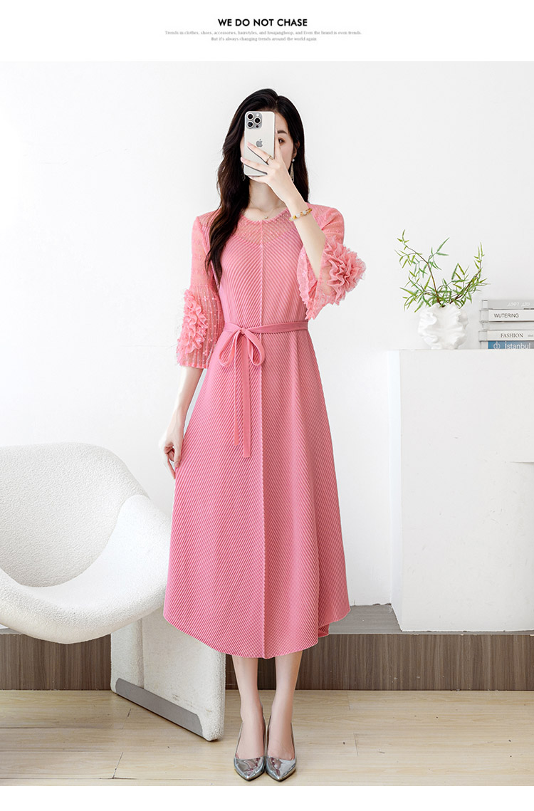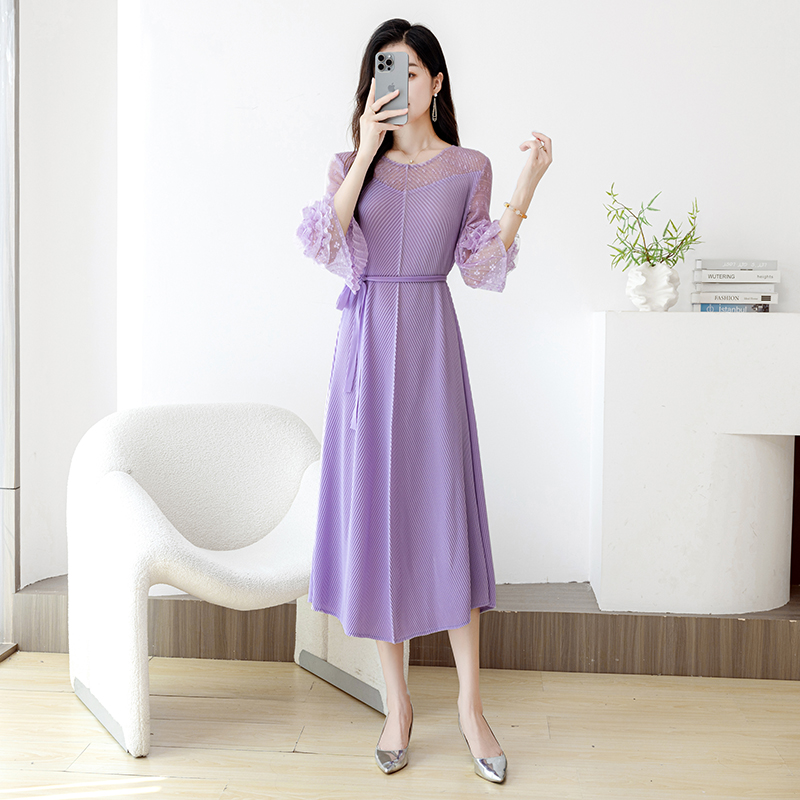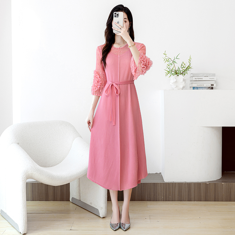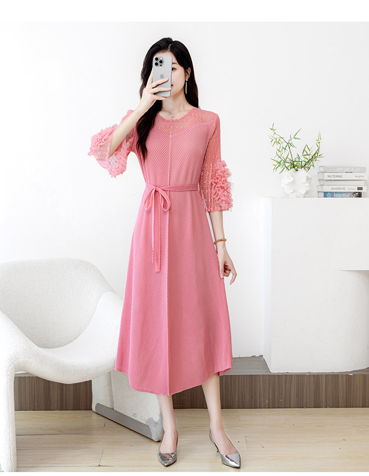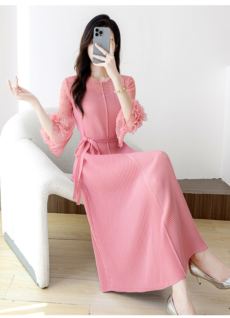 RY804# 三宅褶皱2025早秋新款时尚气质龙鳞褶系带显瘦蕾丝圆领中长连衣裙