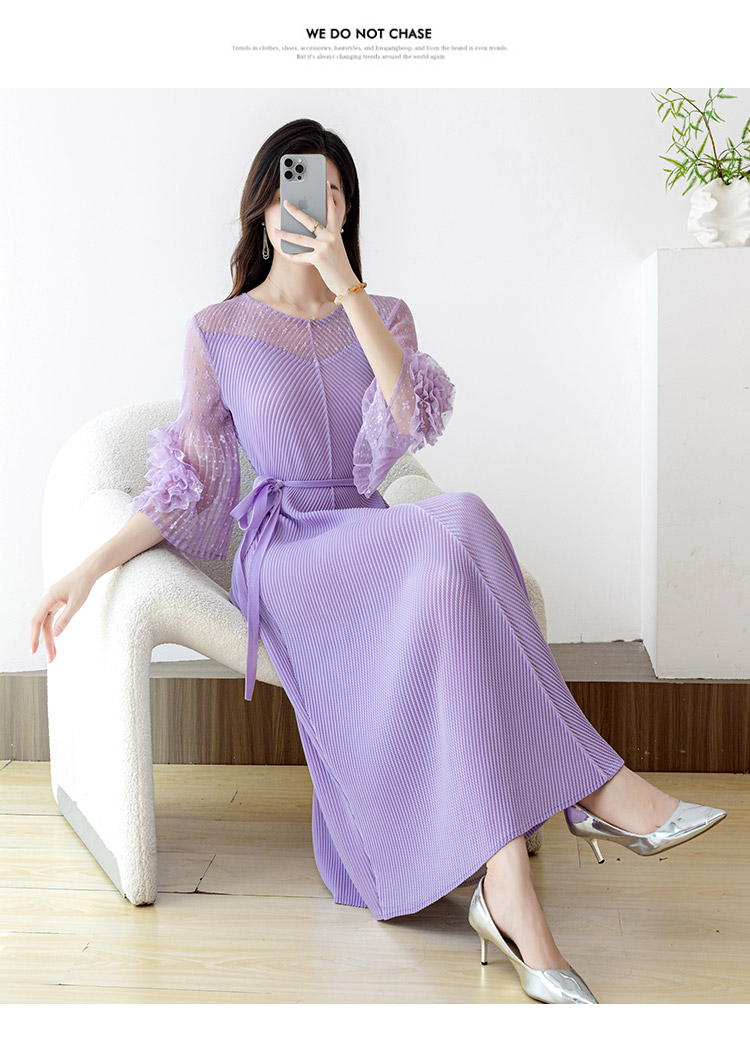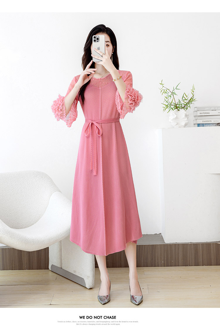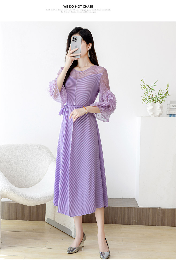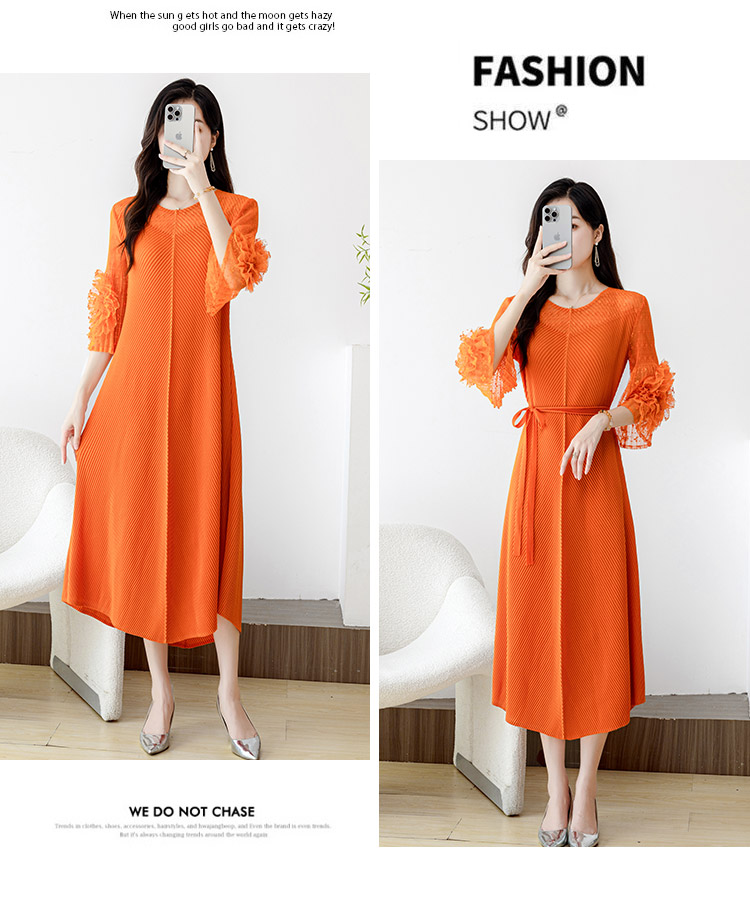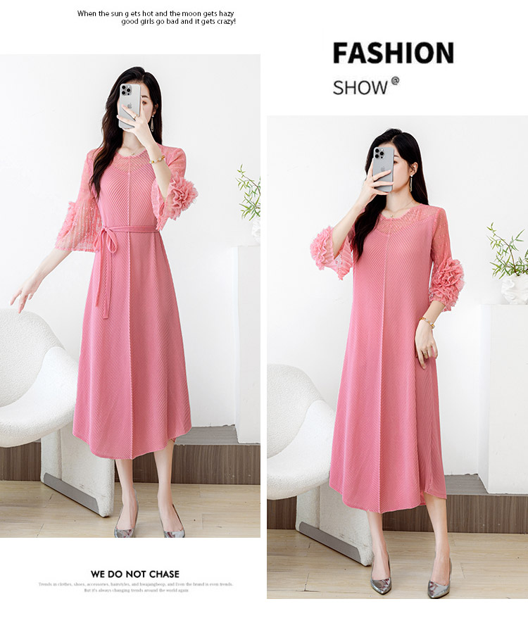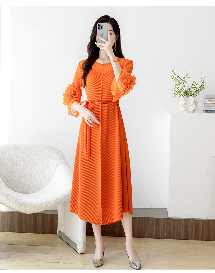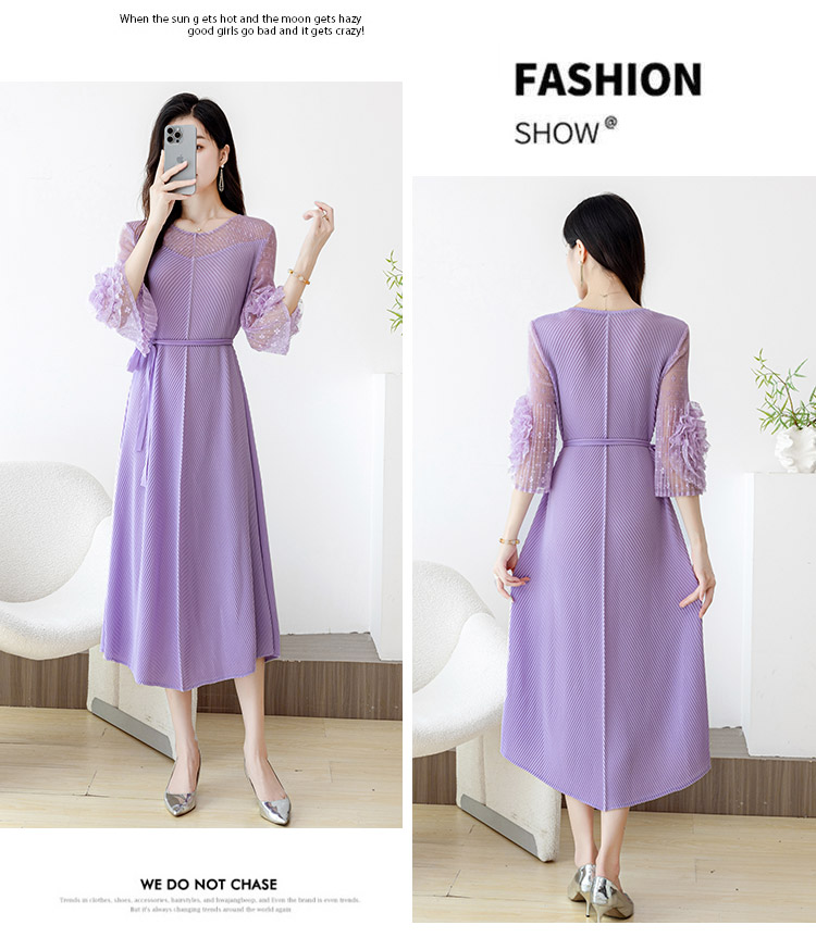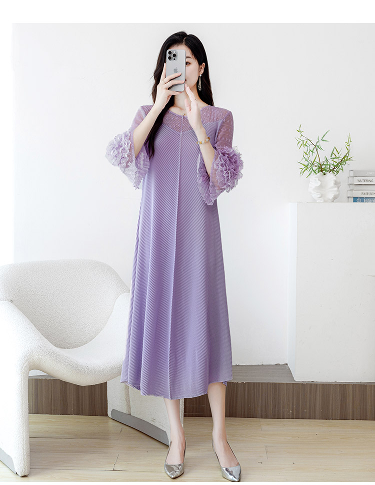 RY804# 三宅褶皱2025早秋新款时尚气质龙鳞褶系带显瘦蕾丝圆领中长连衣裙