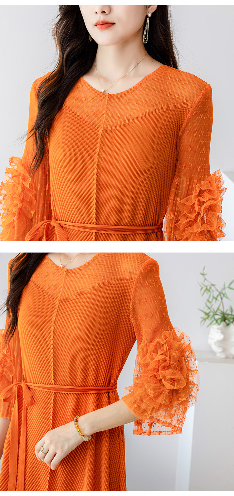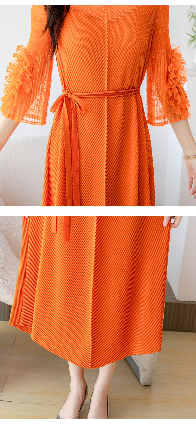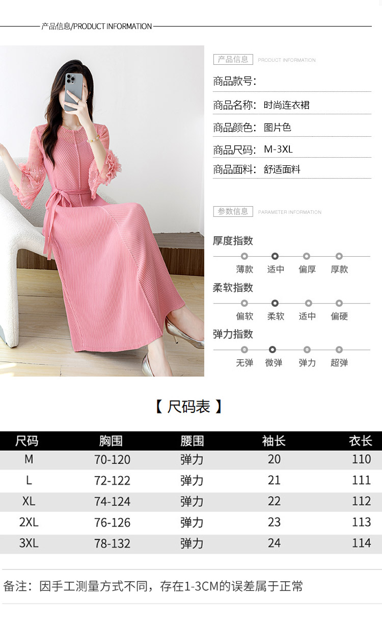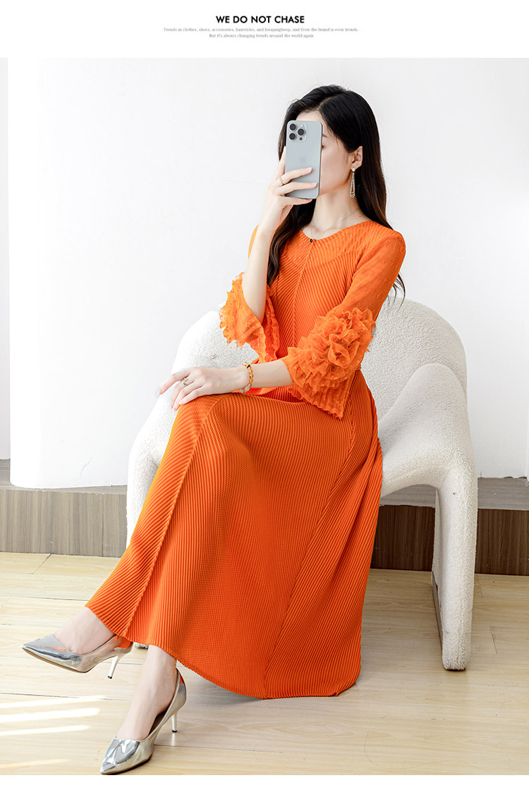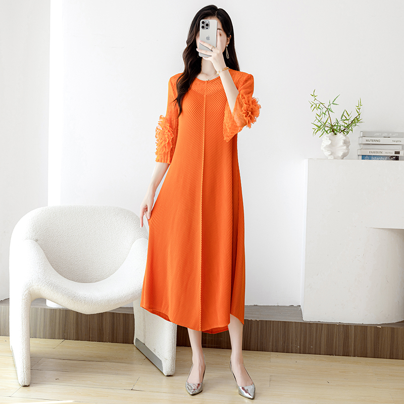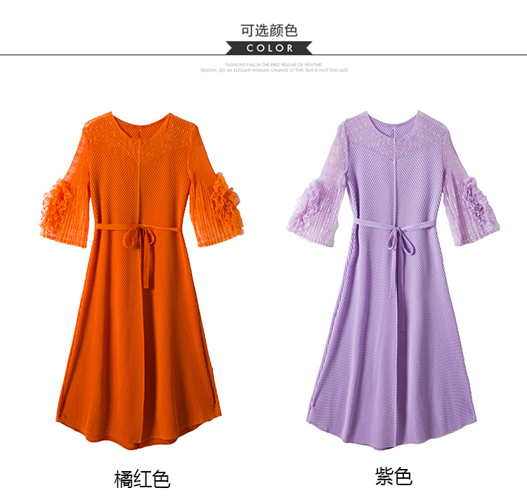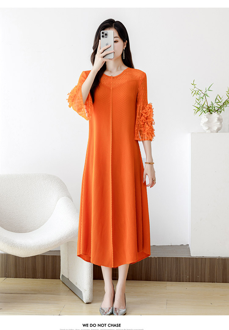RY804# 三宅褶皱2025早秋新款时尚气质龙鳞褶系带显瘦蕾丝圆领中长连衣裙