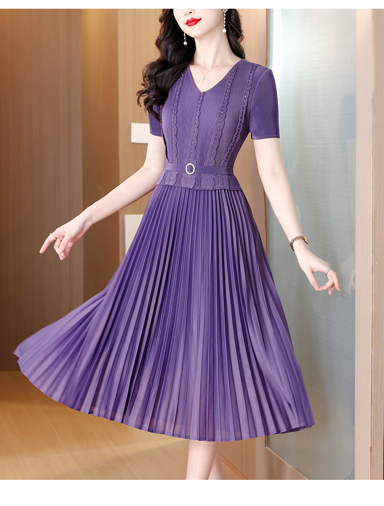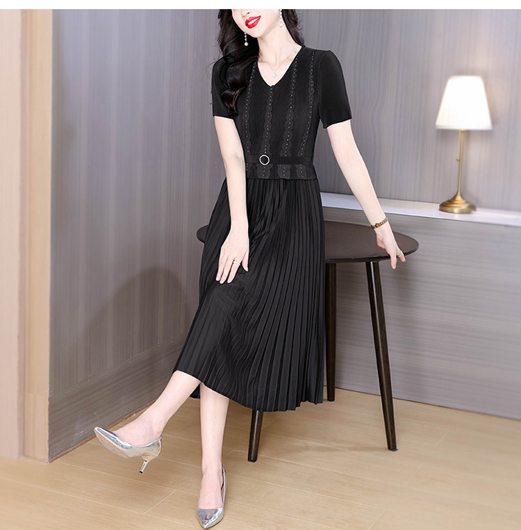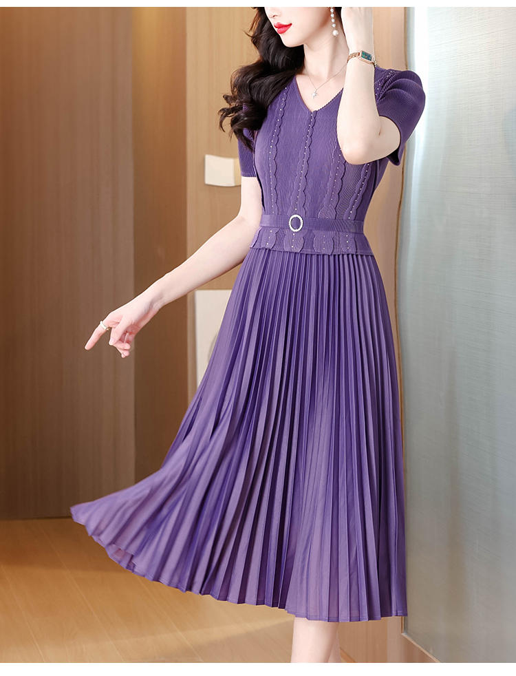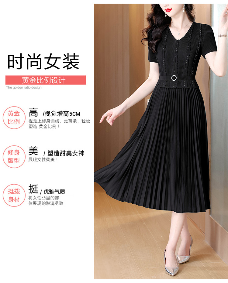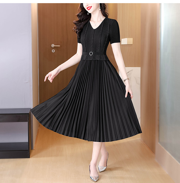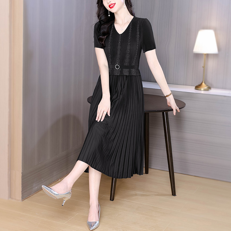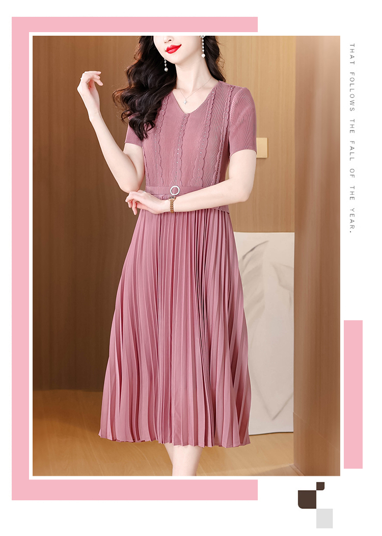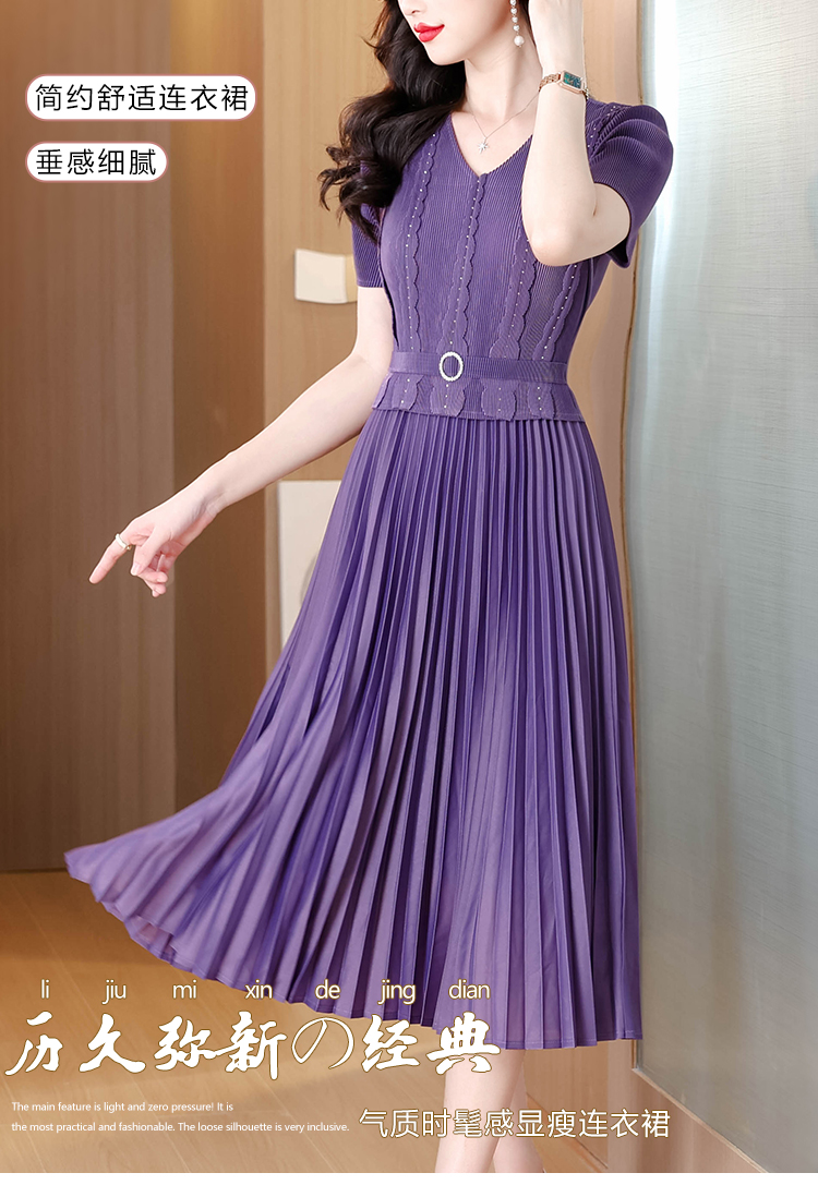 RY806# 三宅2025夏新款烫钻连衣裙女短袖时尚洋气减龄收腰显瘦V领百褶裙