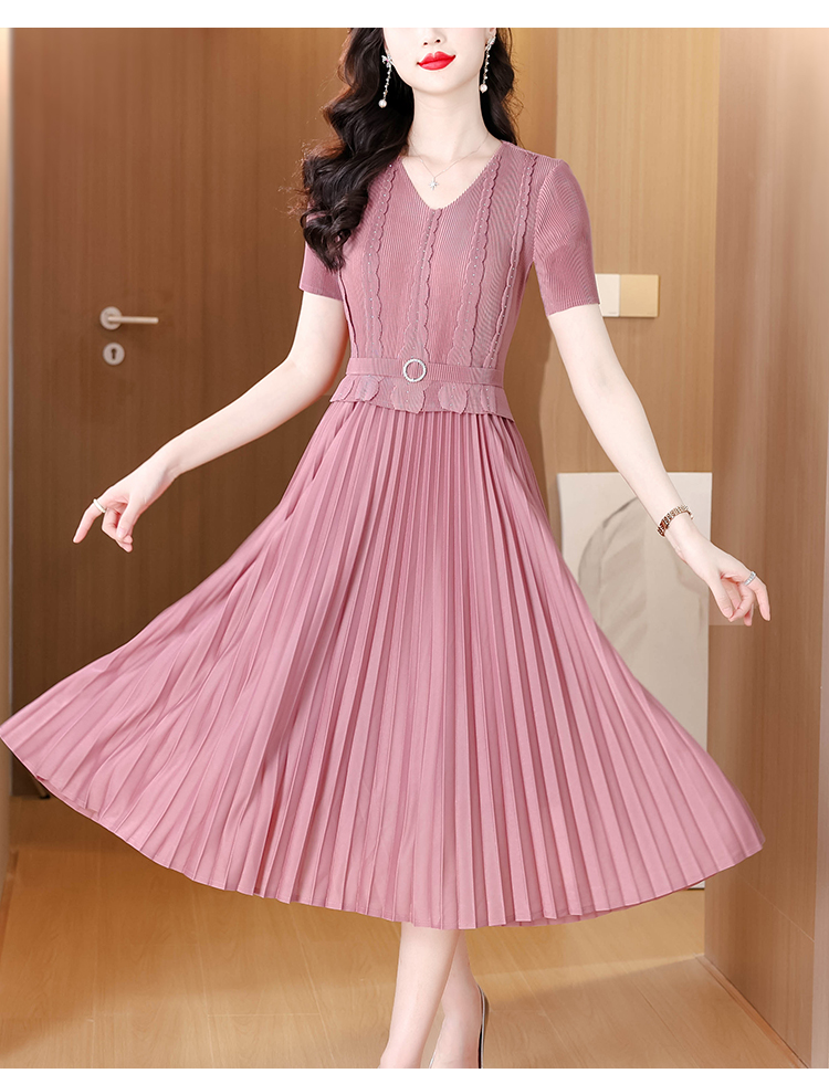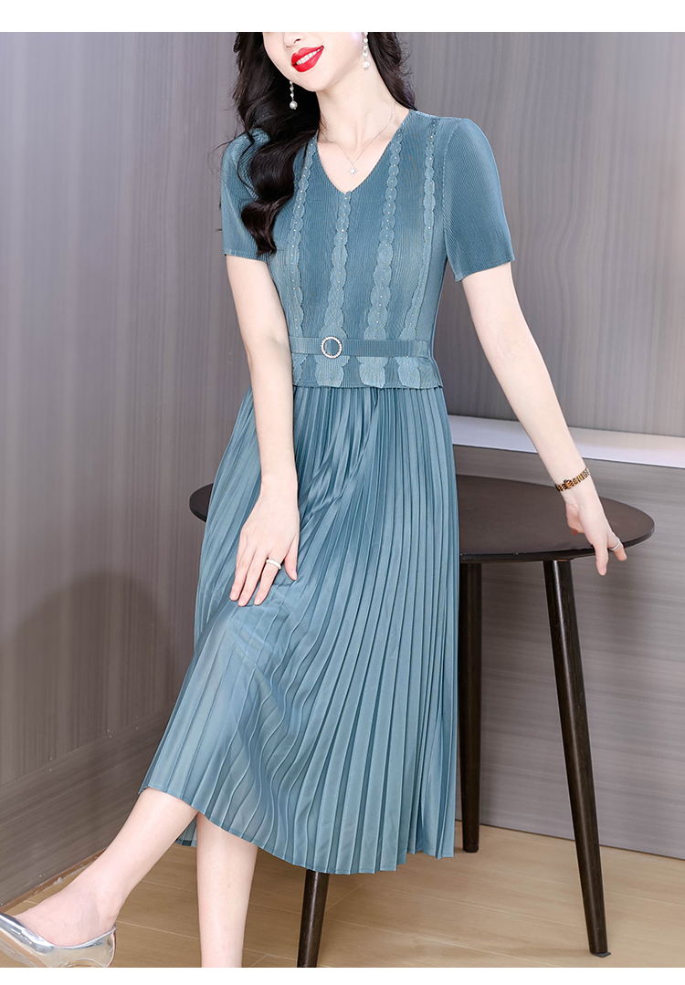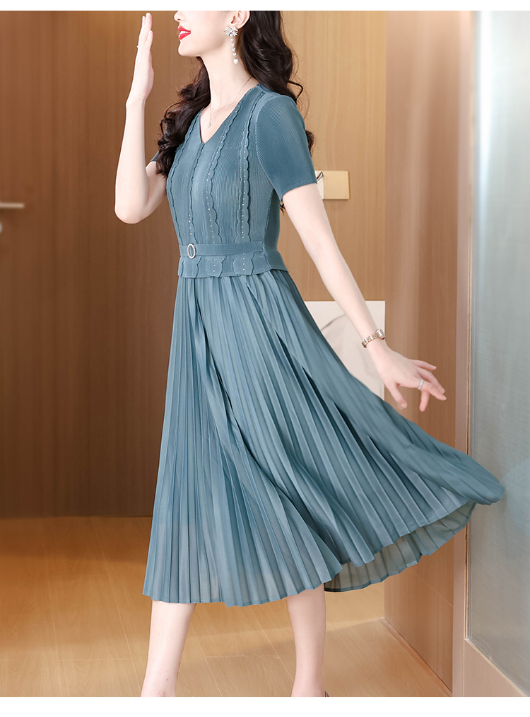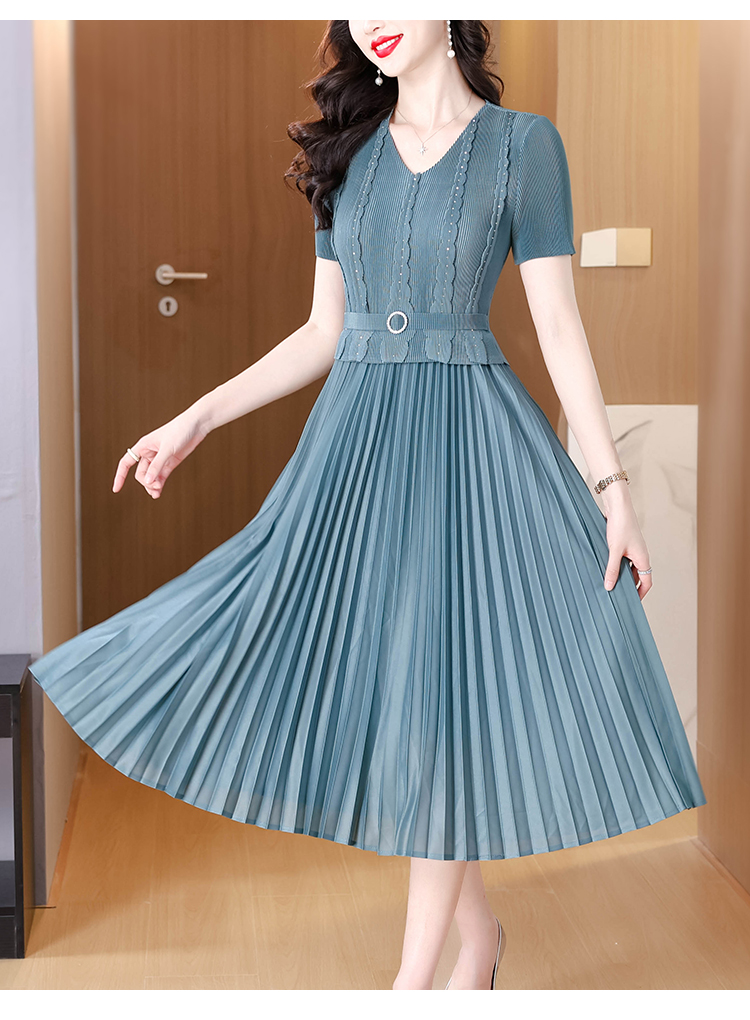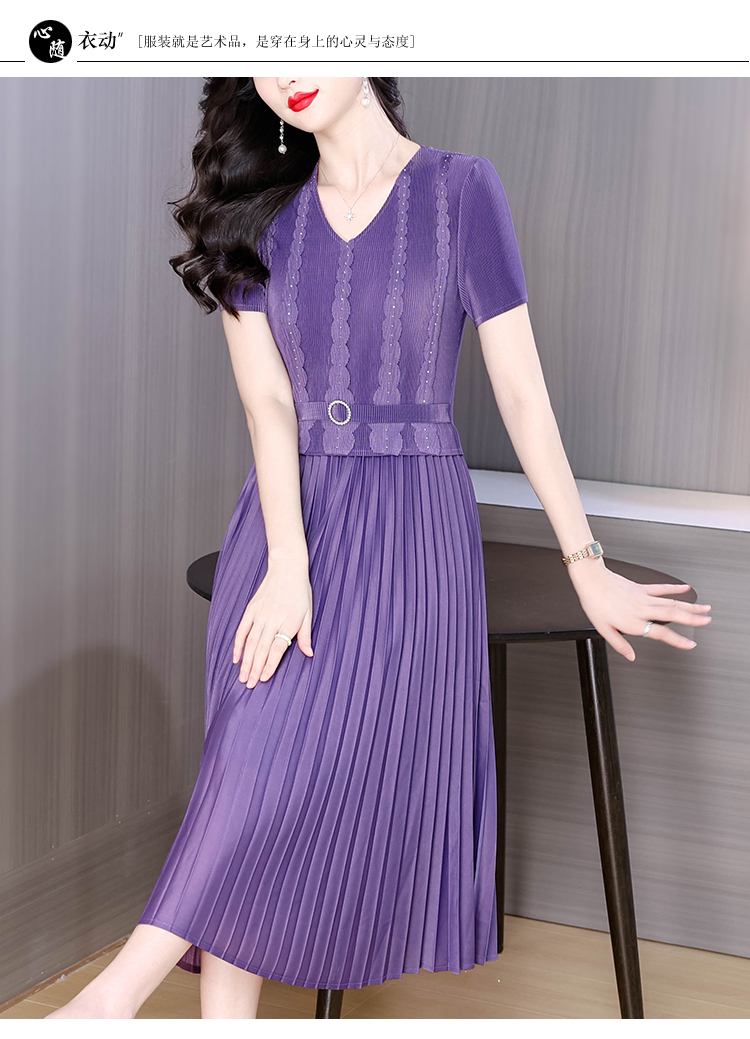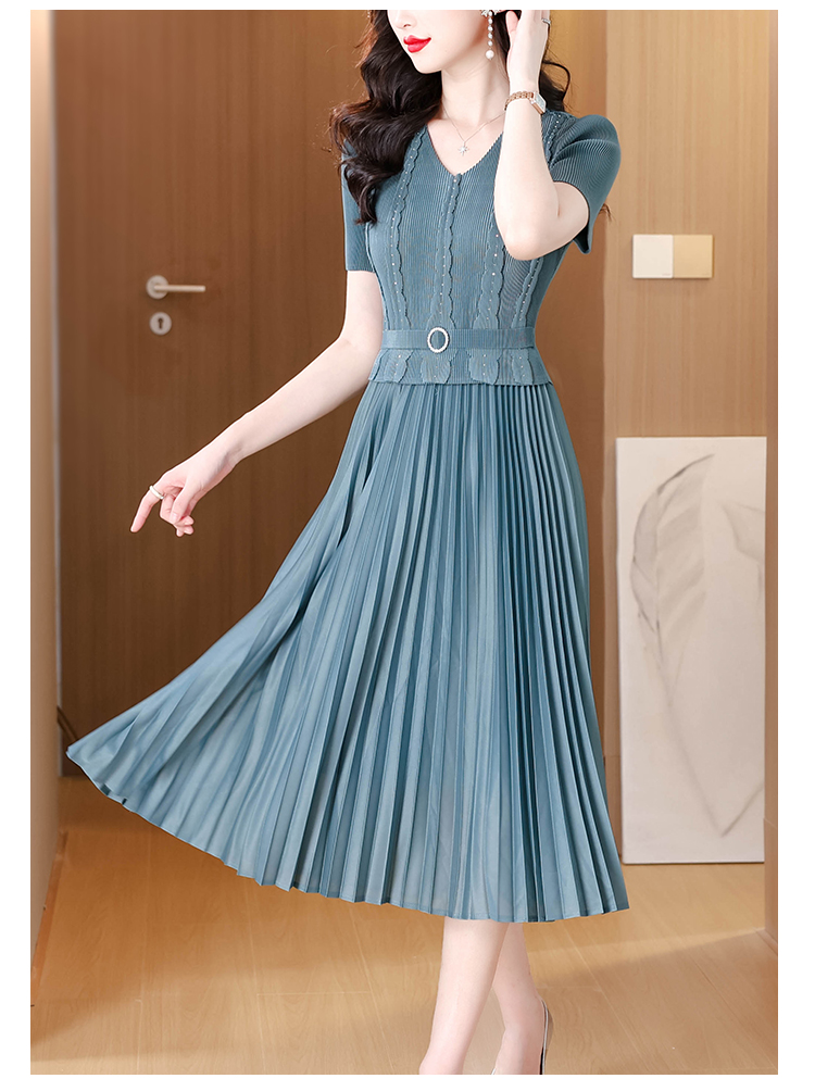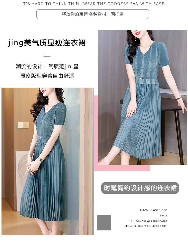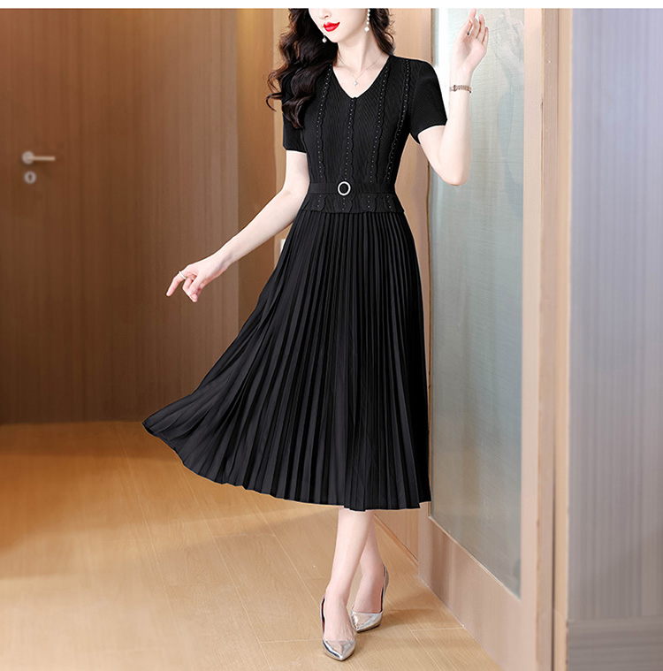 RY806# 三宅2025夏新款烫钻连衣裙女短袖时尚洋气减龄收腰显瘦V领百褶裙