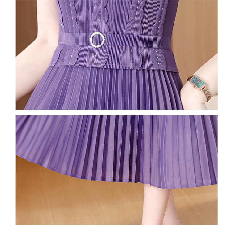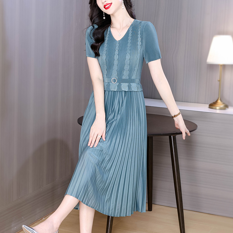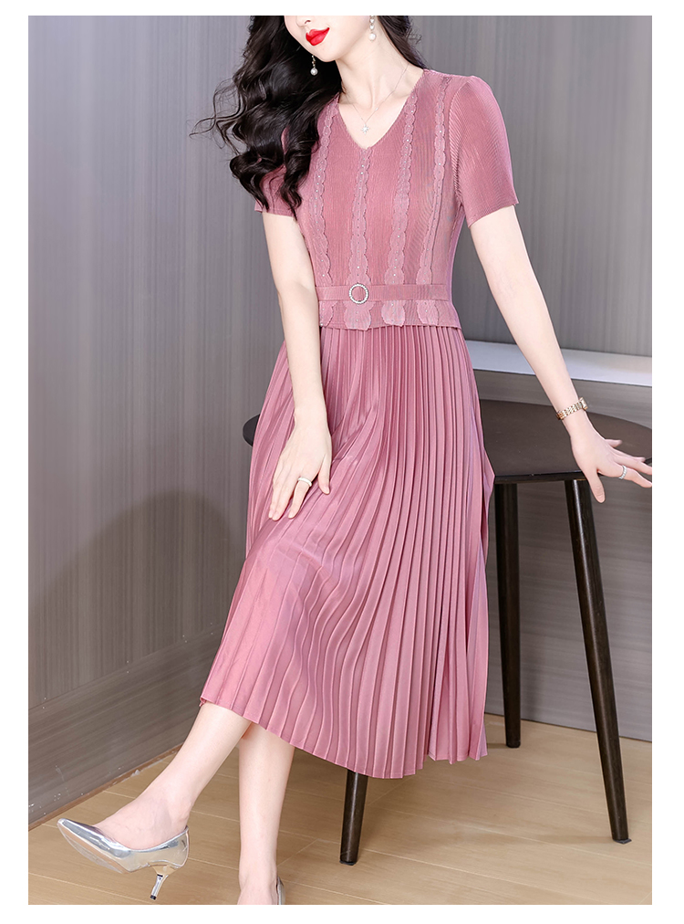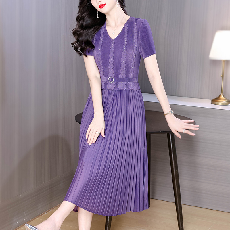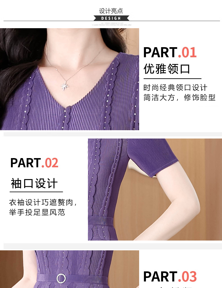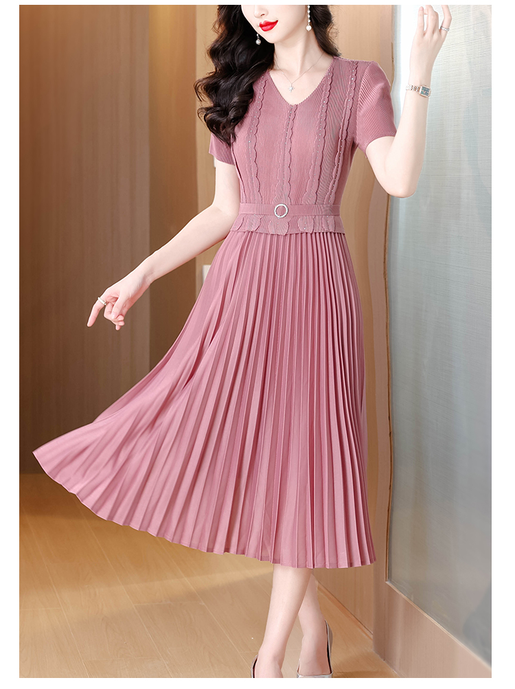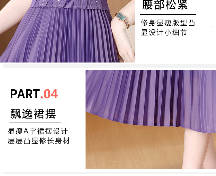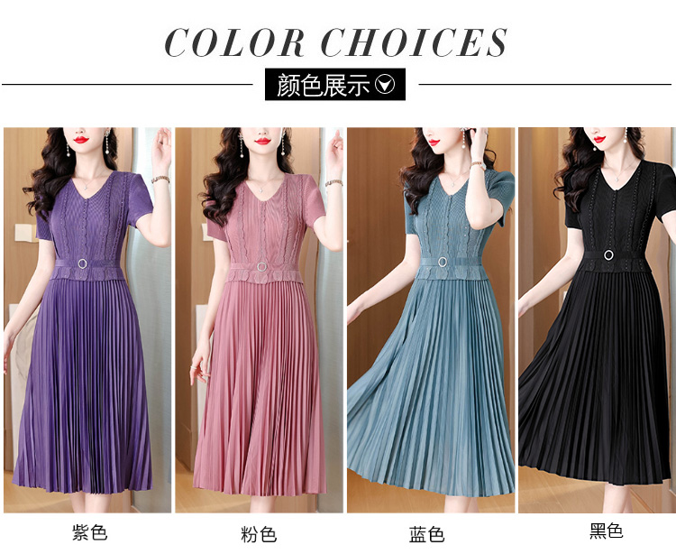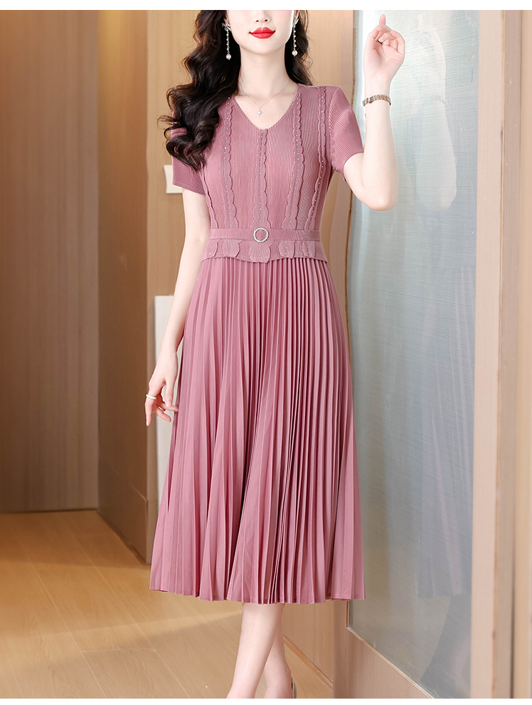 RY806# 三宅2025夏新款烫钻连衣裙女短袖时尚洋气减龄收腰显瘦V领百褶裙