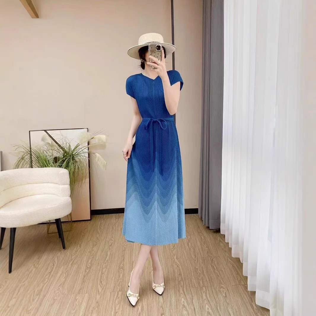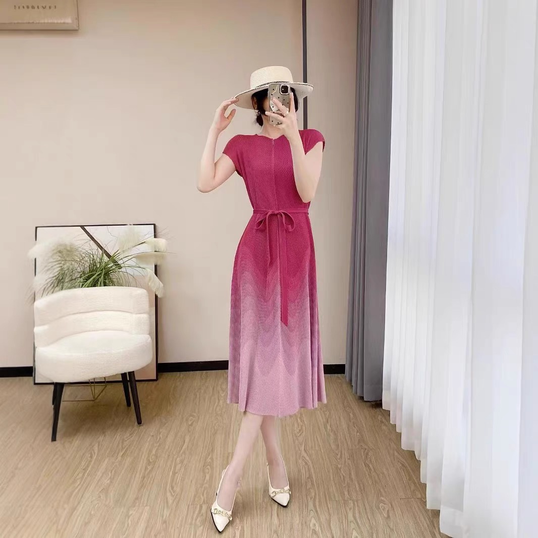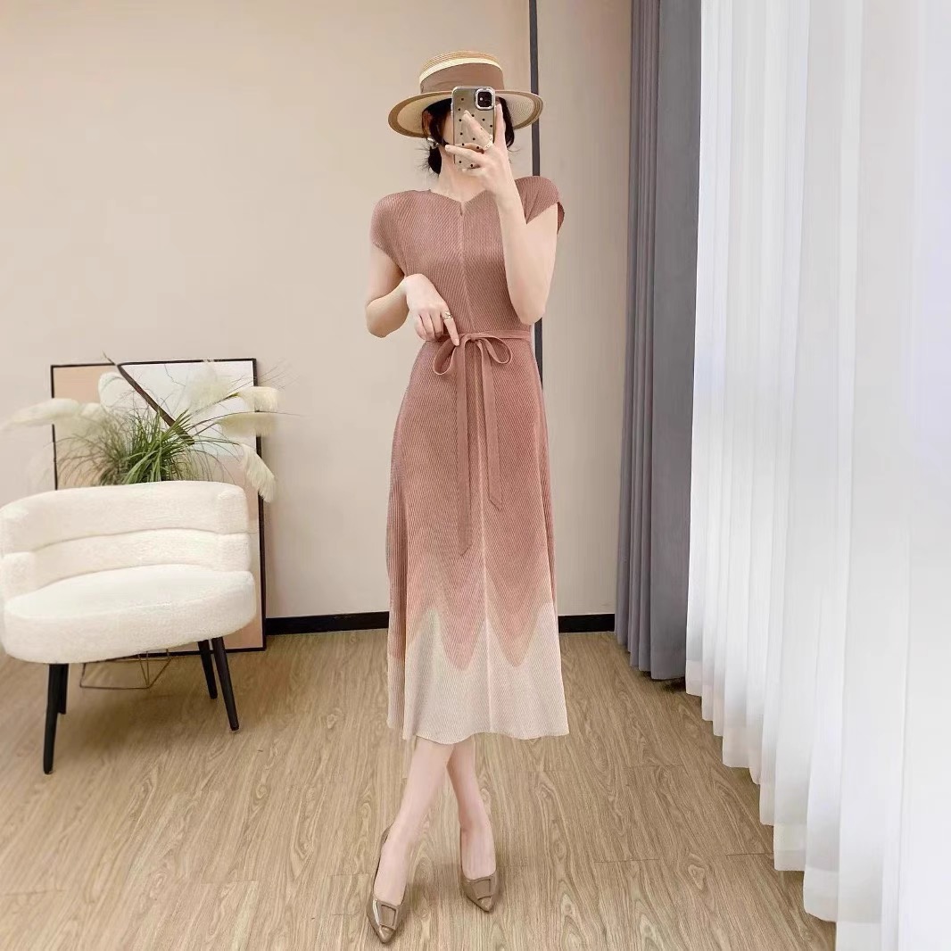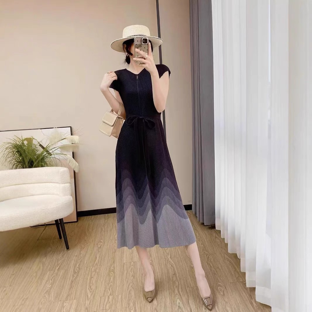 RY810# 三宅褶皱连衣裙女长款显瘦大摆a字裙渐变色夏款高端龙鳞纹百褶裙