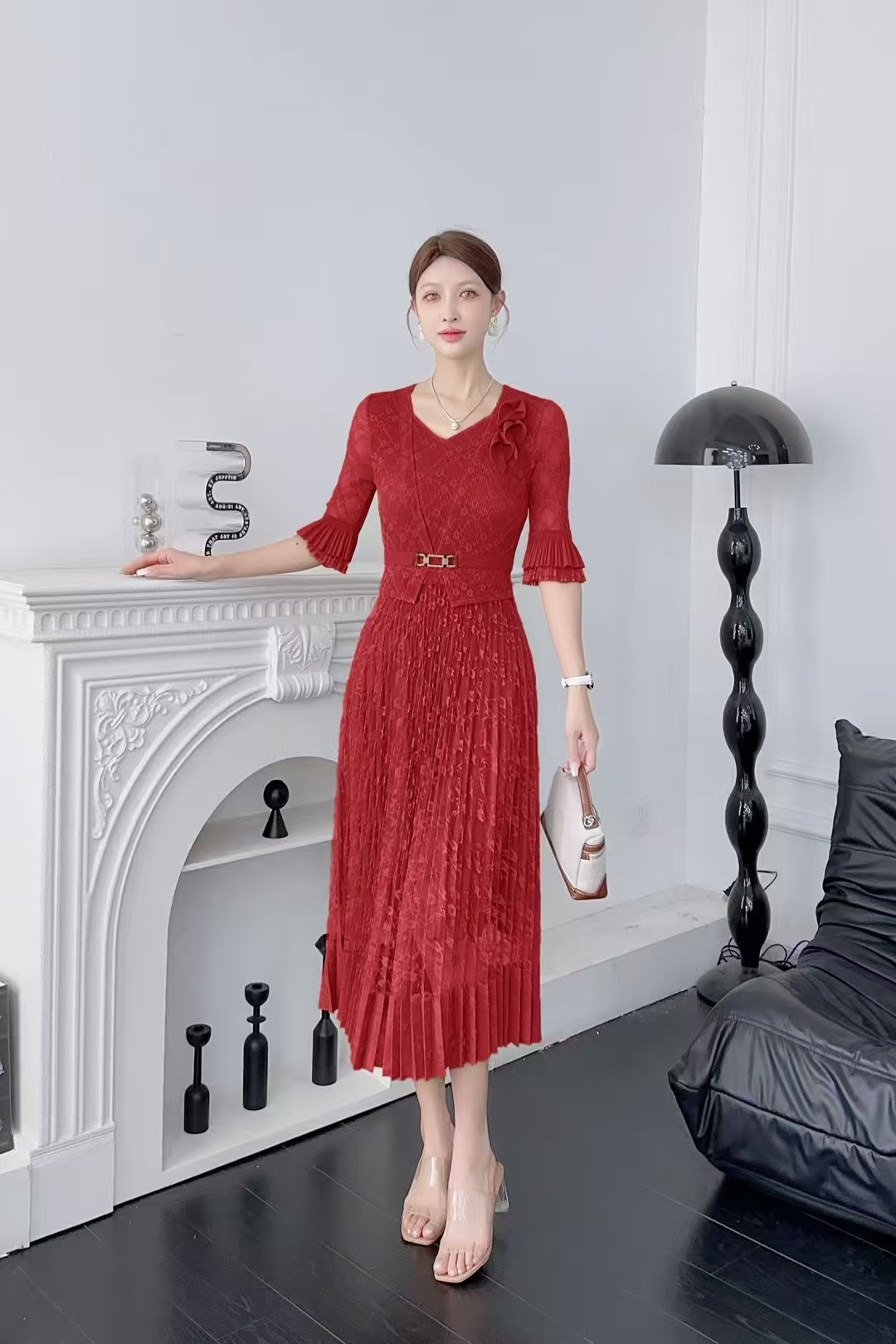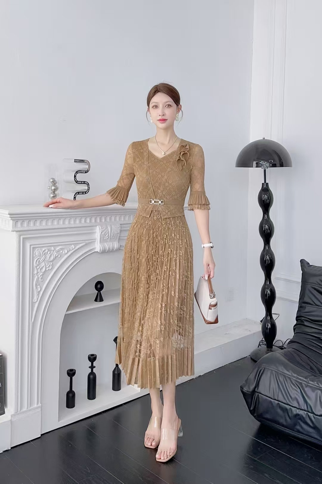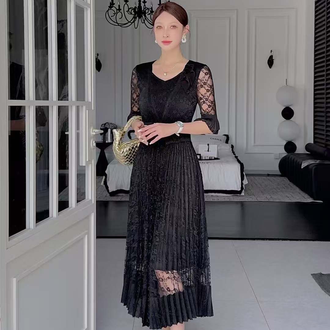 RY811# 三宅褶皱连衣裙2025夏季新款V领蕾丝高端时尚气质名媛收腰显瘦裙
