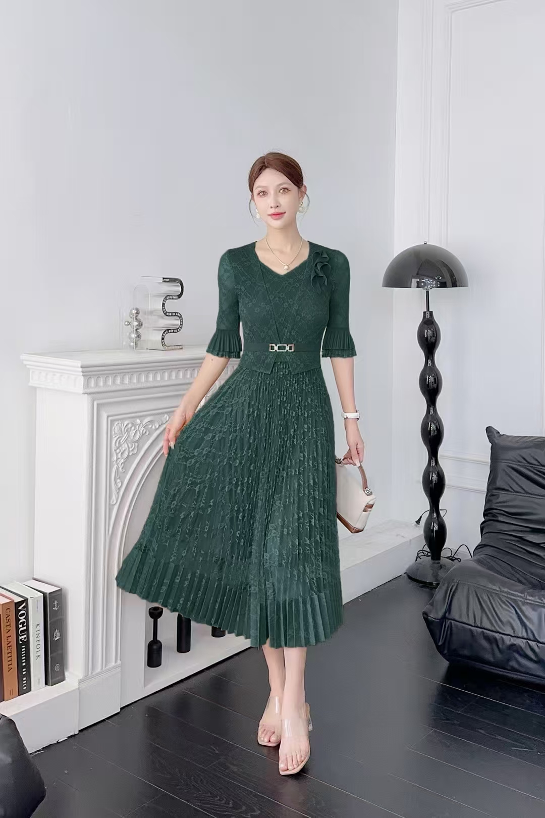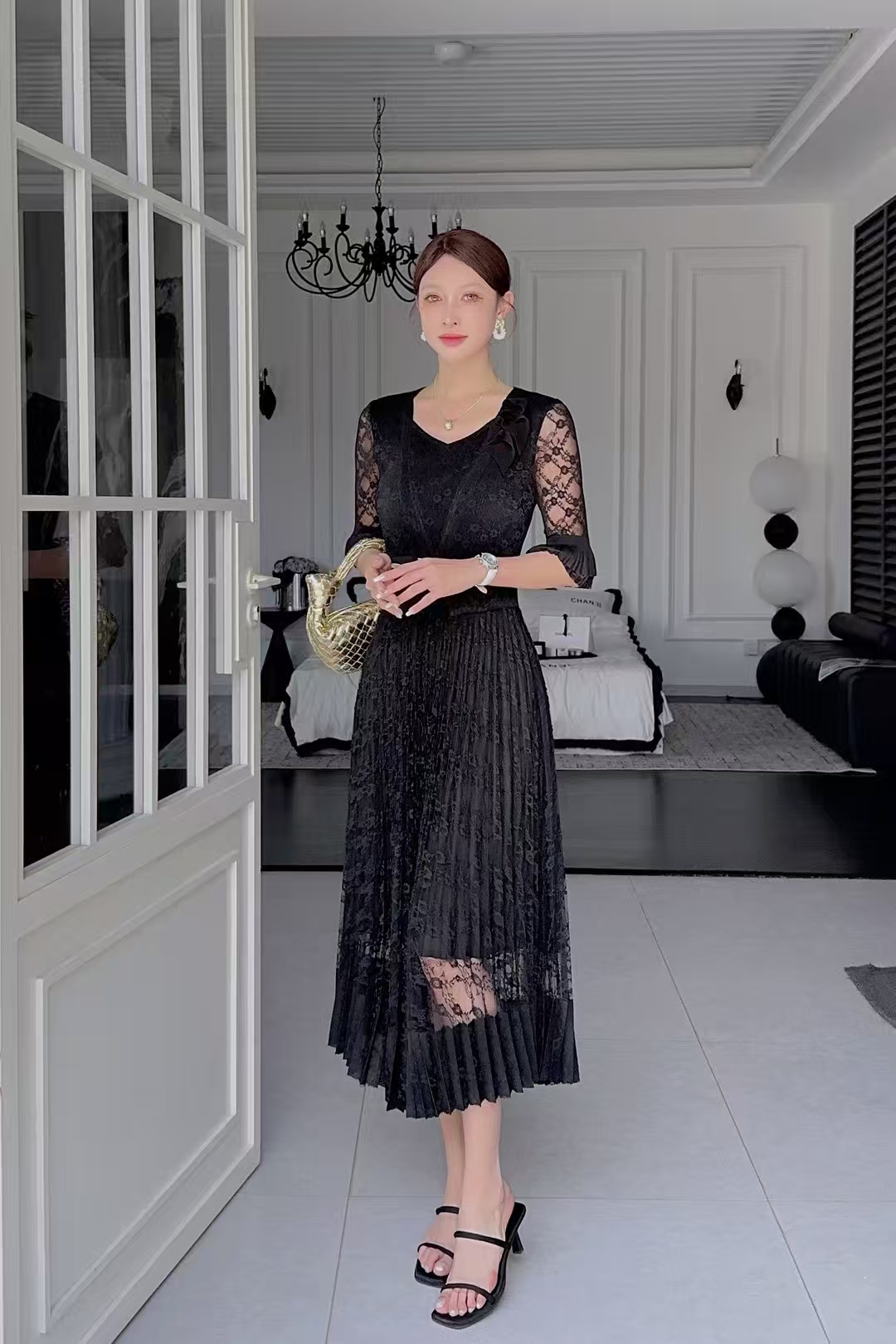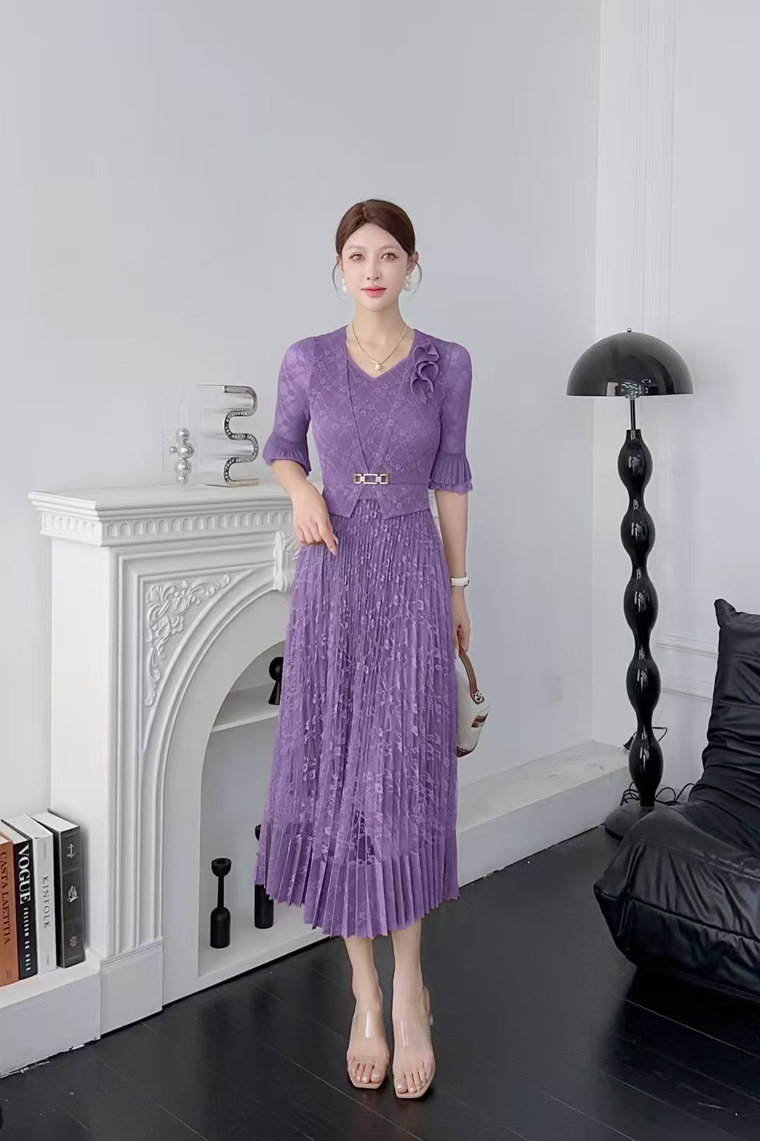 RY811# 三宅褶皱连衣裙2025夏季新款V领蕾丝高端时尚气质名媛收腰显瘦裙
