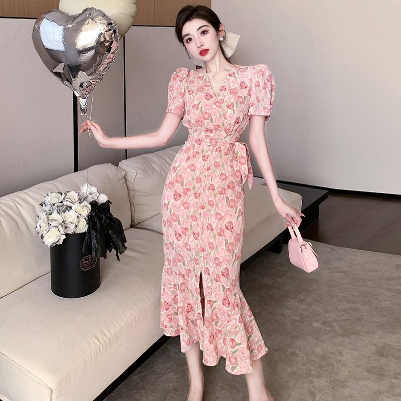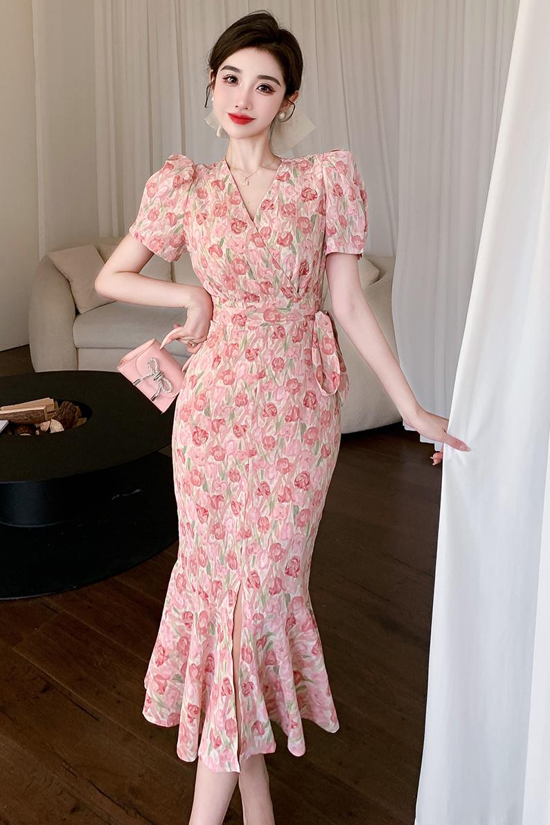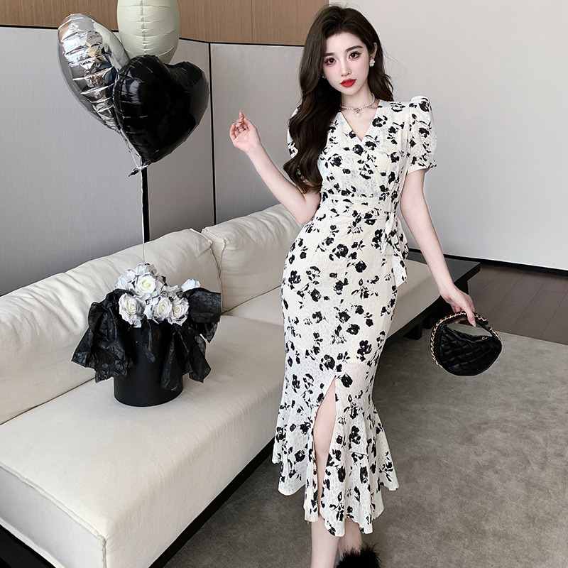 RY848# 实拍夏季时尚碎花温柔收腰提花气质鱼尾中长款开叉连衣裙