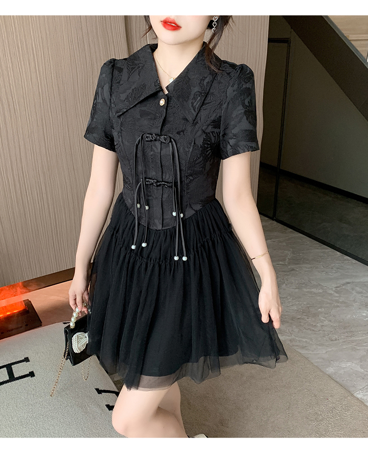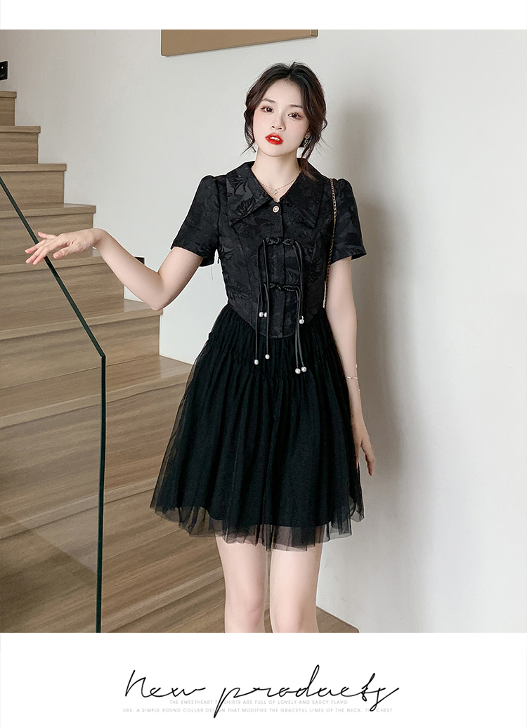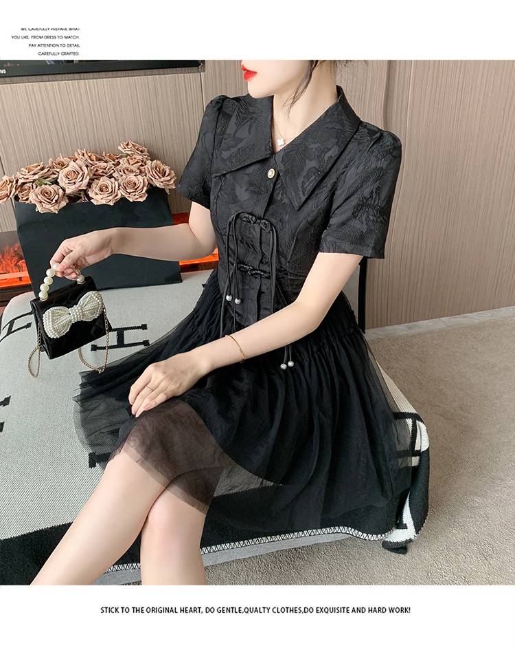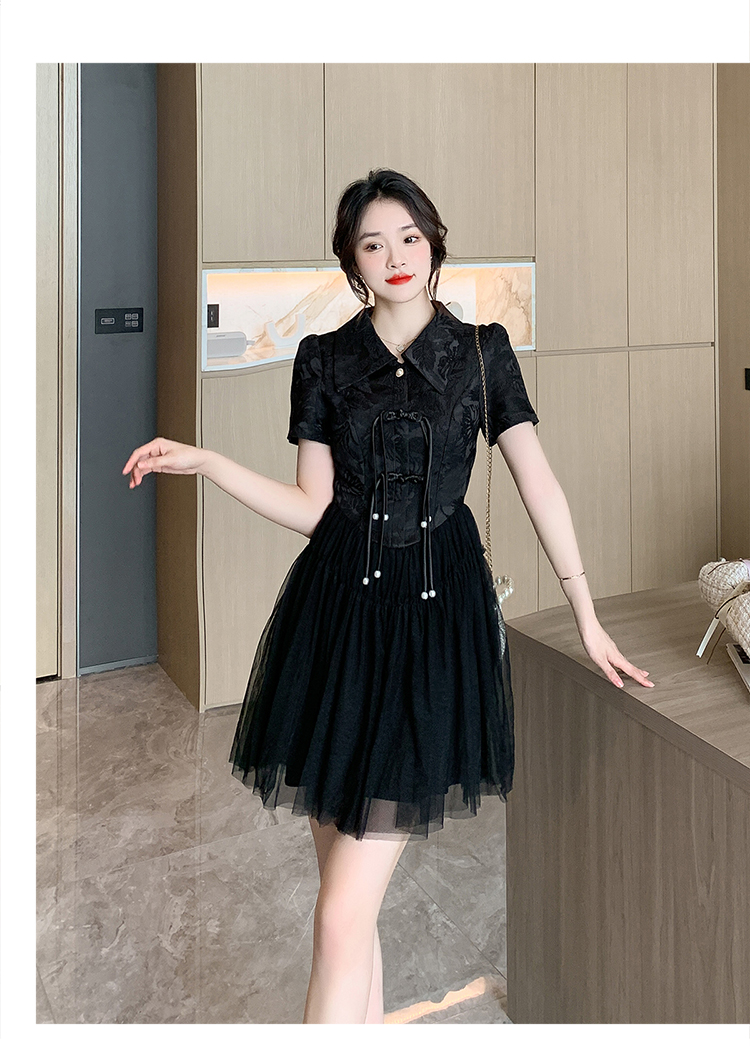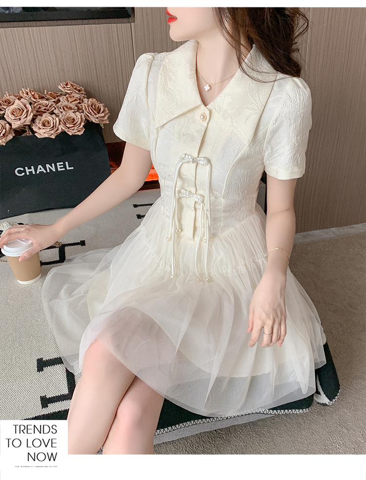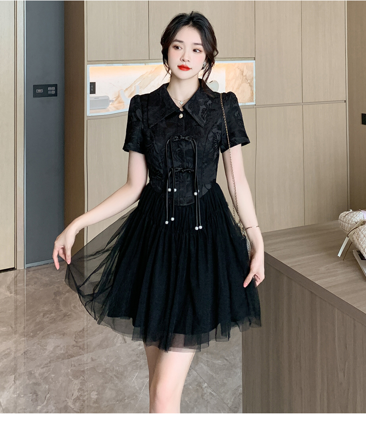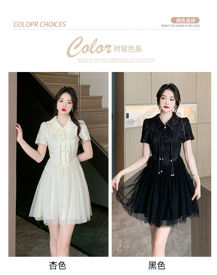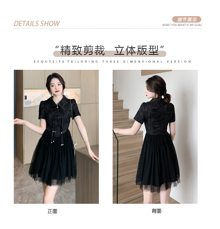 RY851# 实拍夏季新款提花拼接珍珠新中式改良旗袍时尚网纱蓬蓬连衣裙