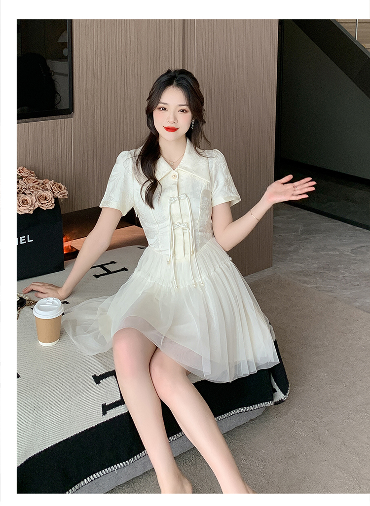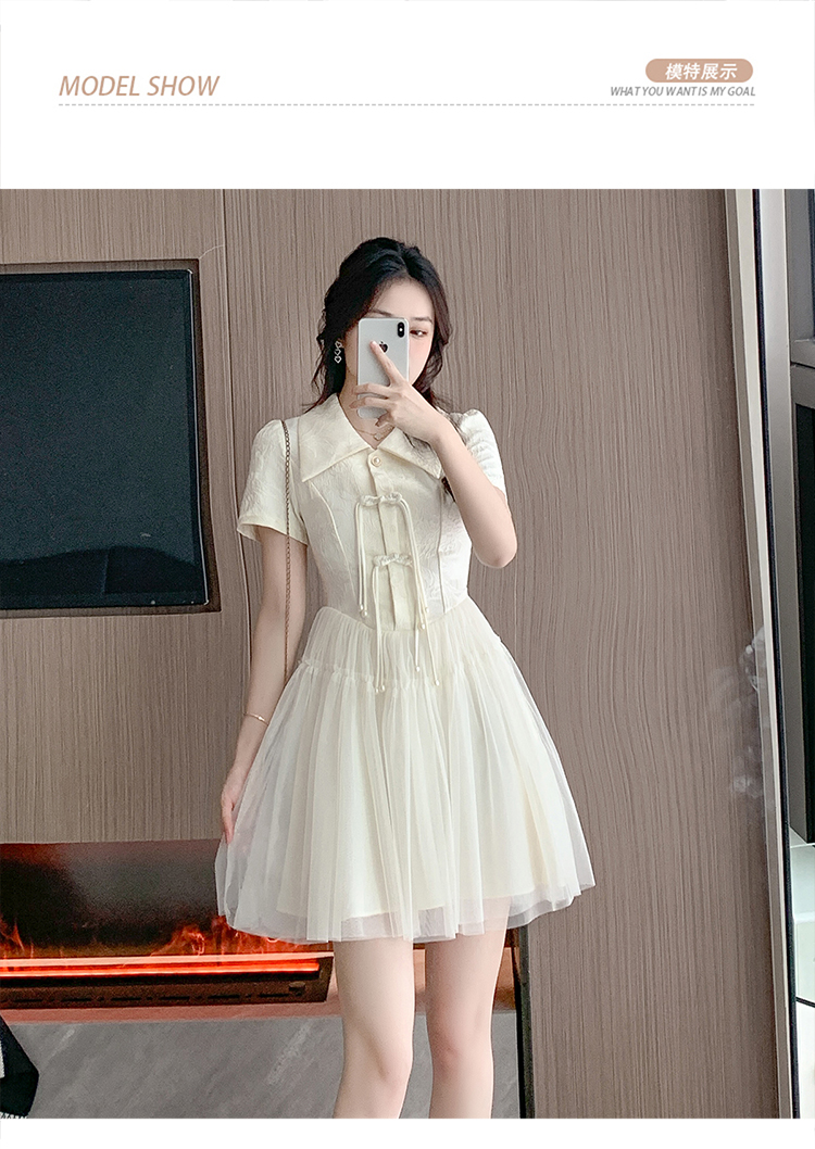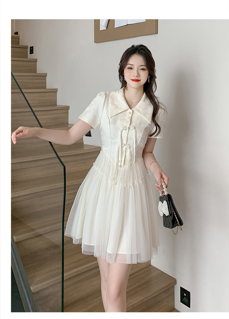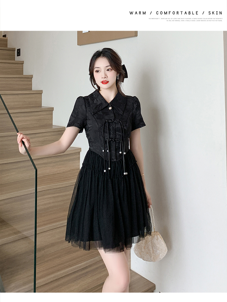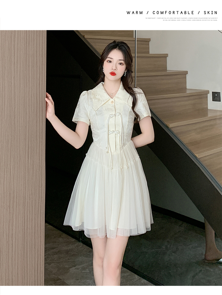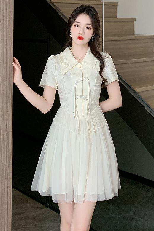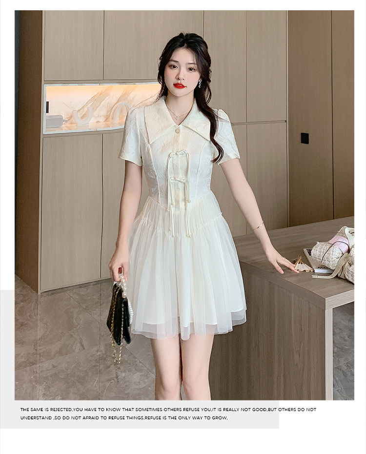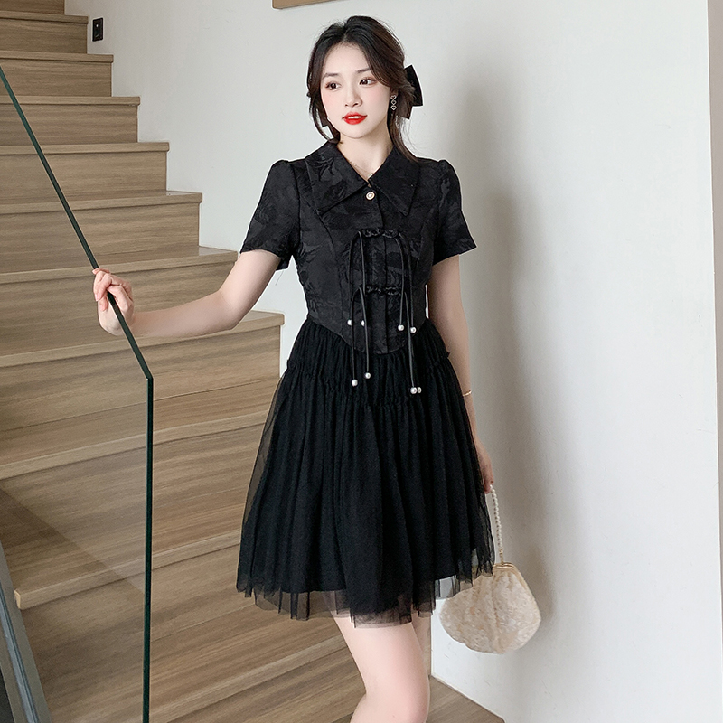 RY851# 实拍夏季新款提花拼接珍珠新中式改良旗袍时尚网纱蓬蓬连衣裙
