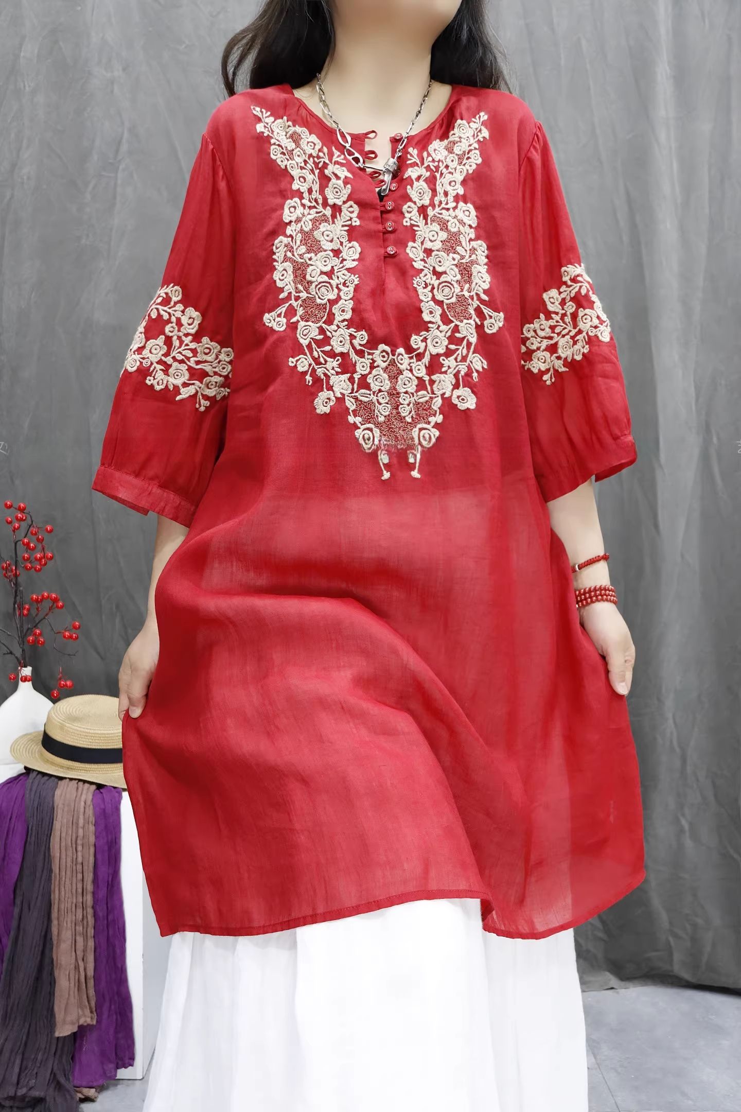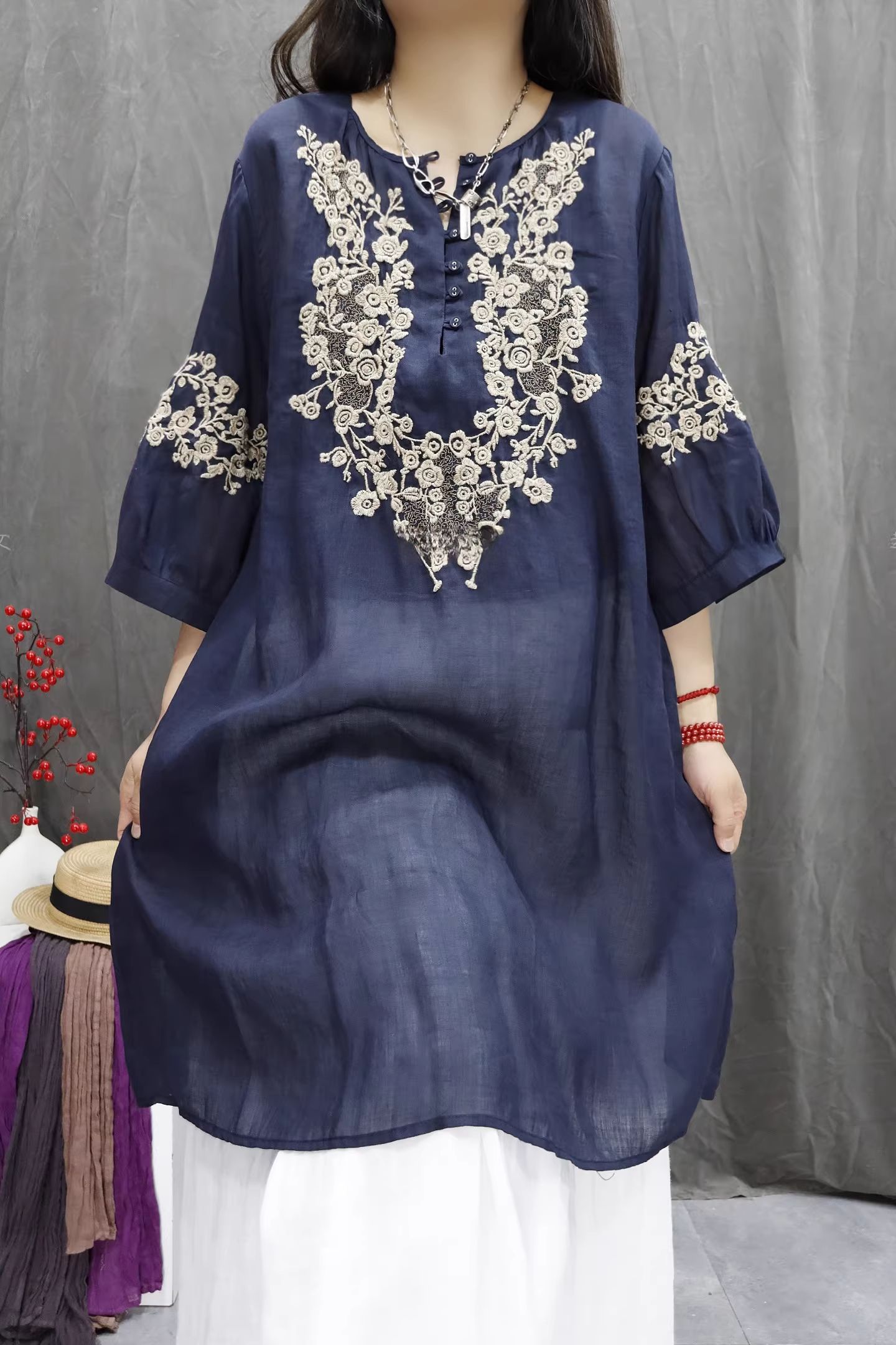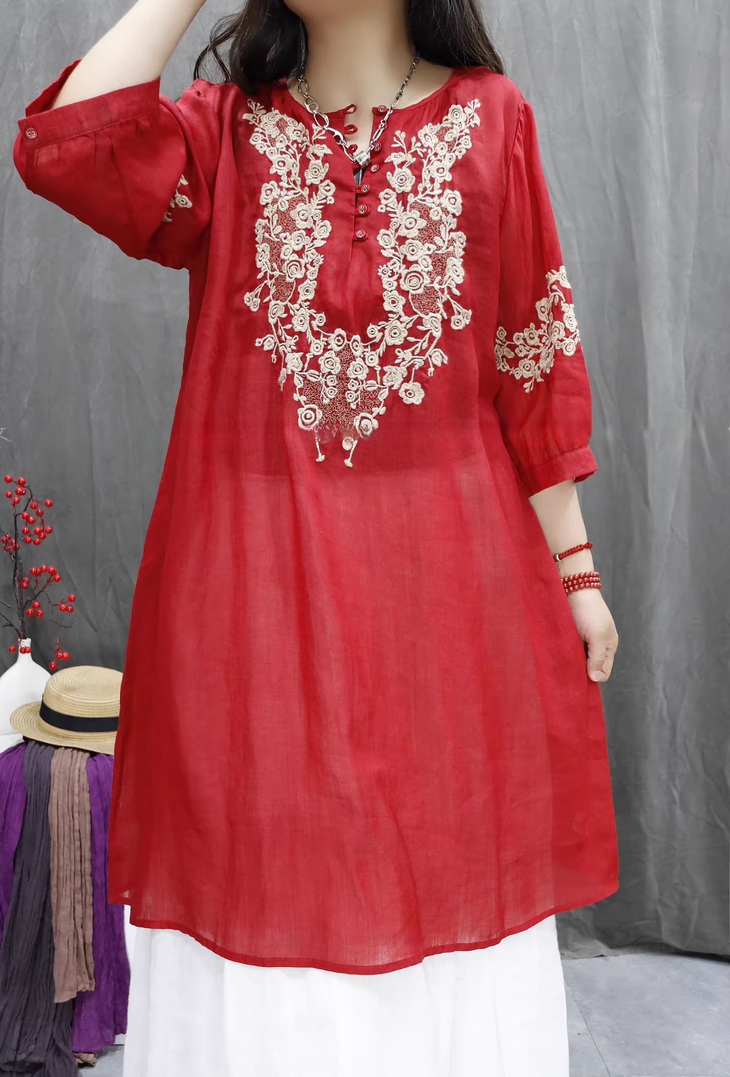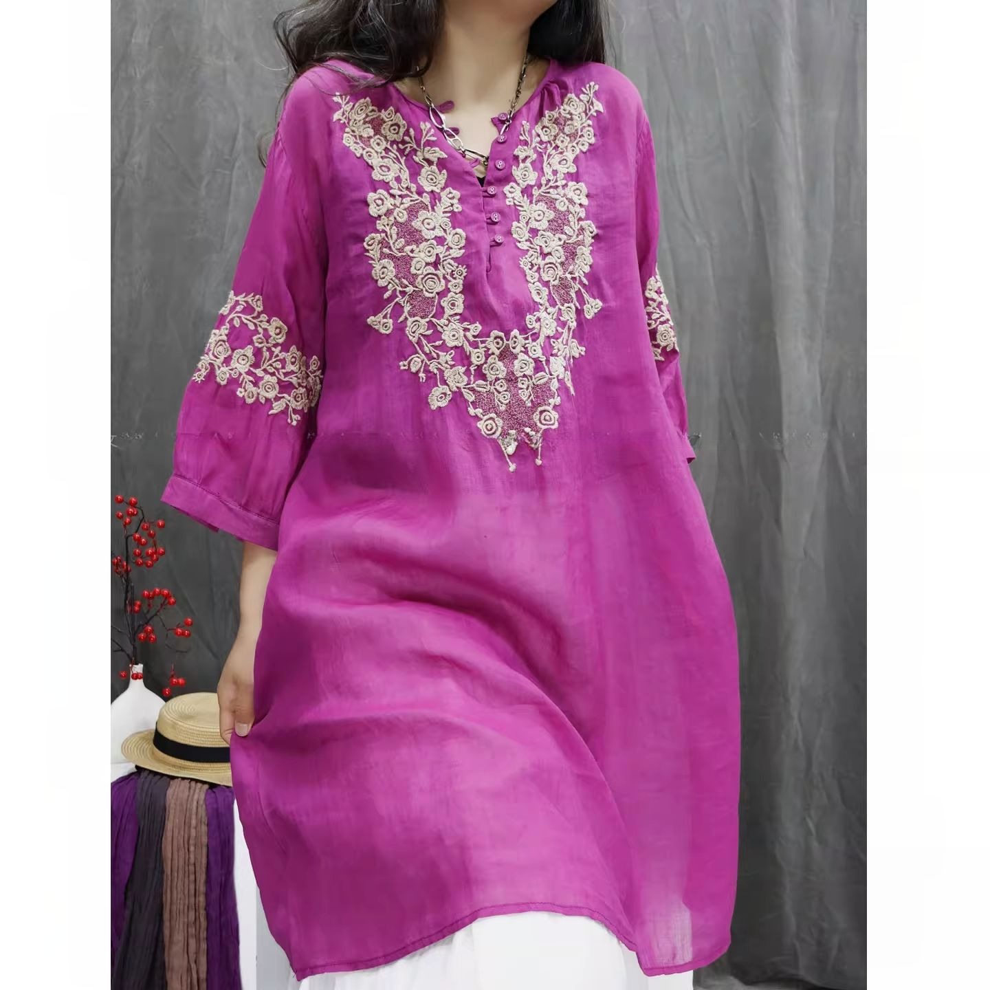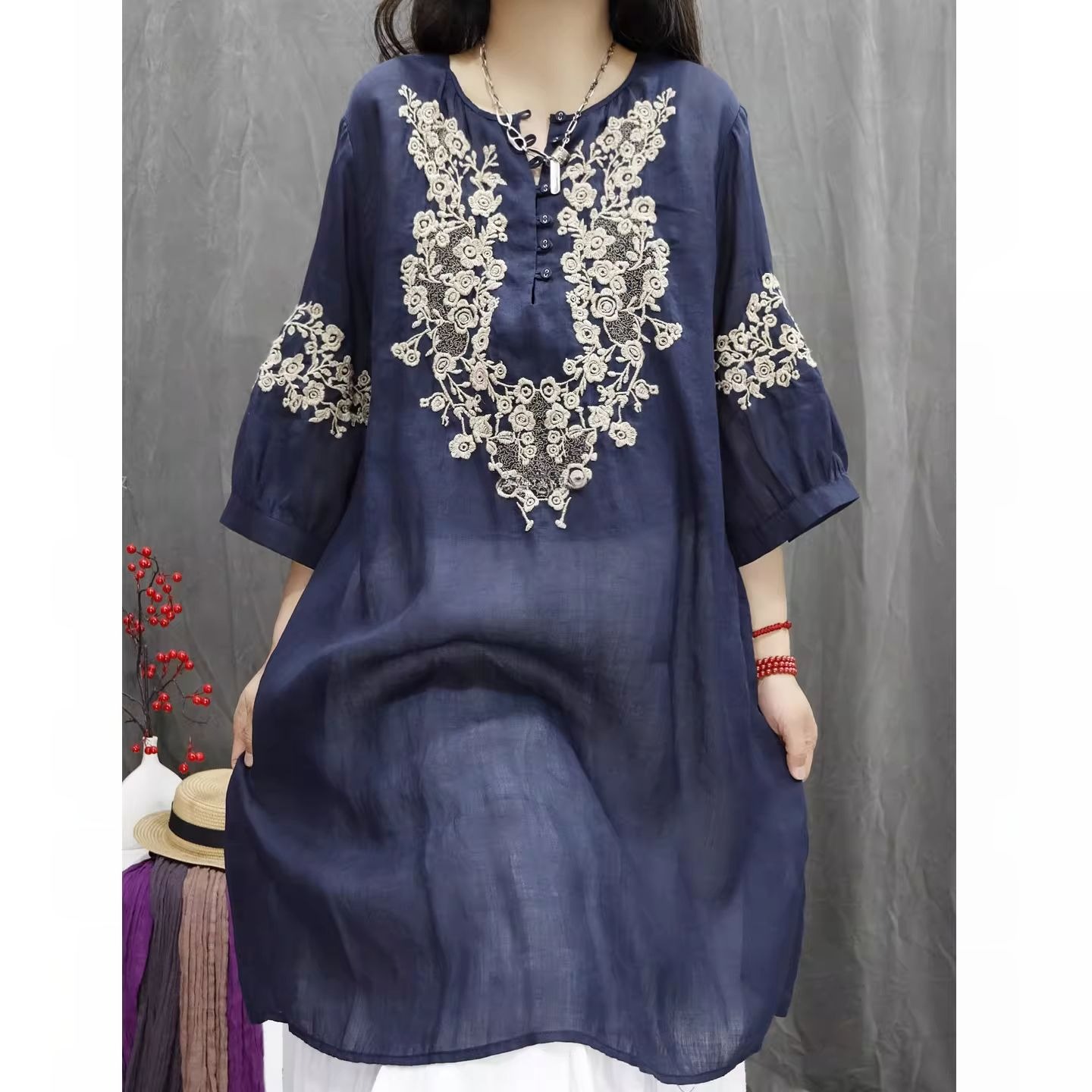 RY864# 2026春夏复古棉麻重工刺绣文艺百搭上衣宽松洋气中长款休闲衬衫裙