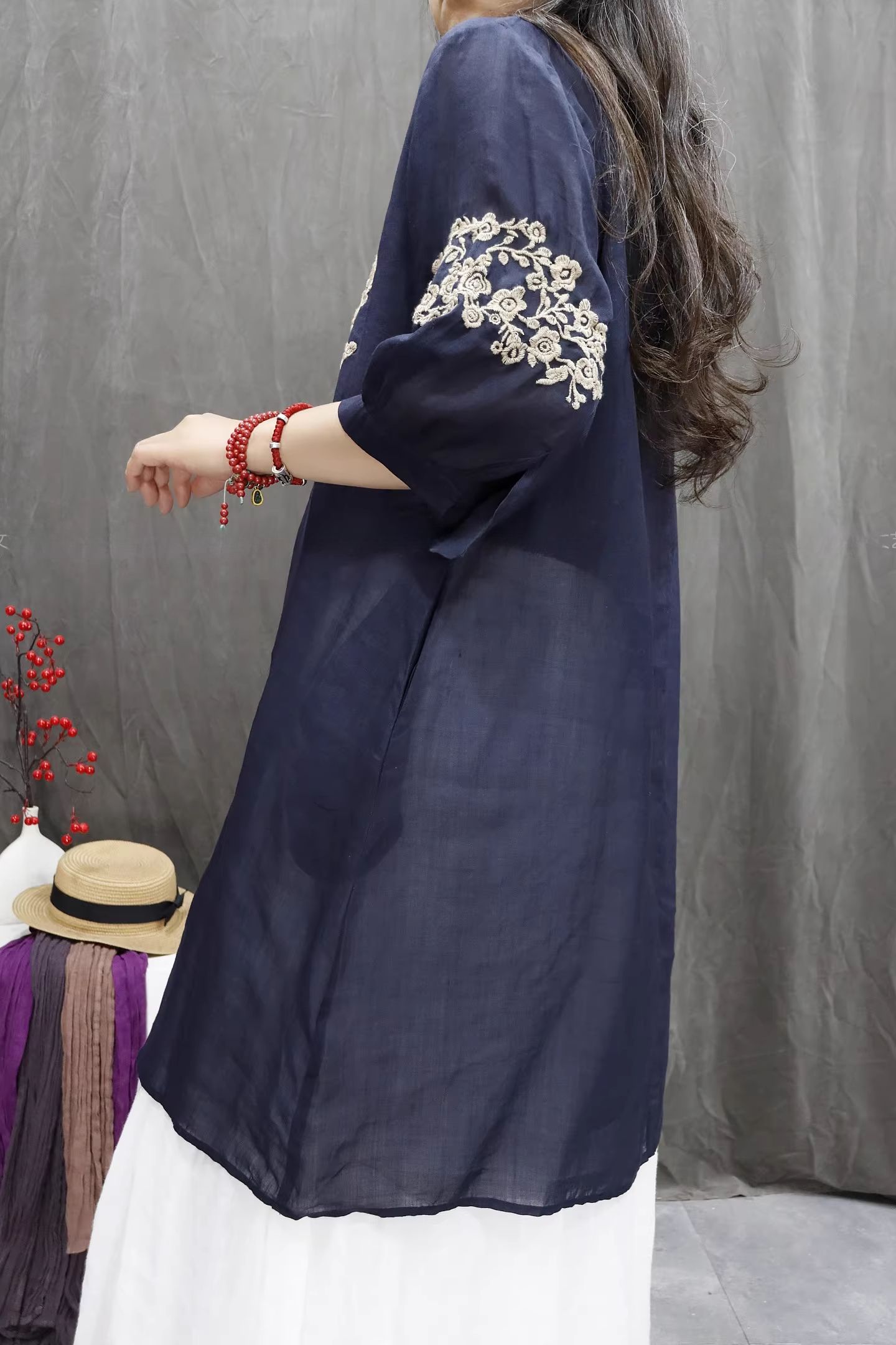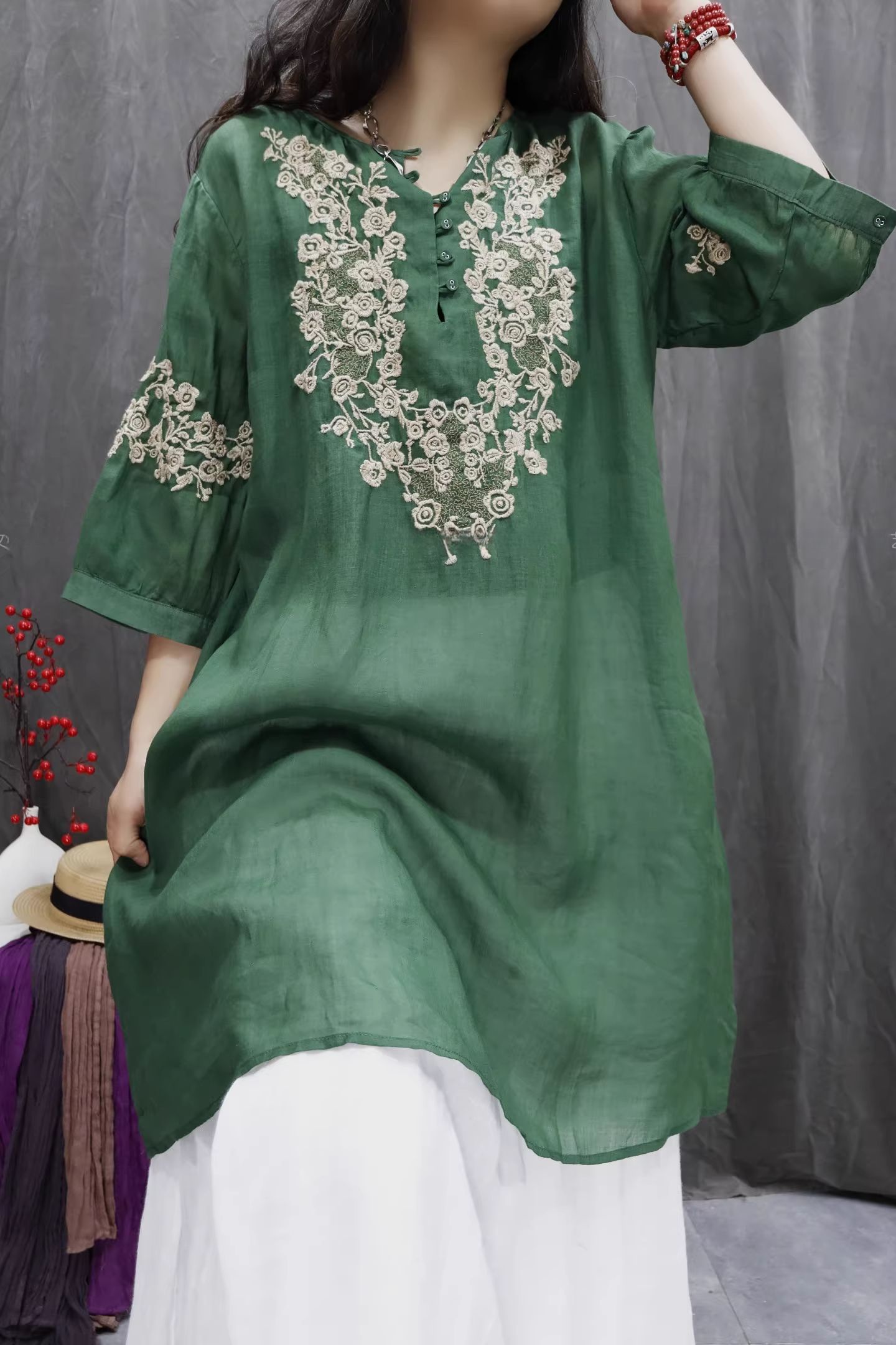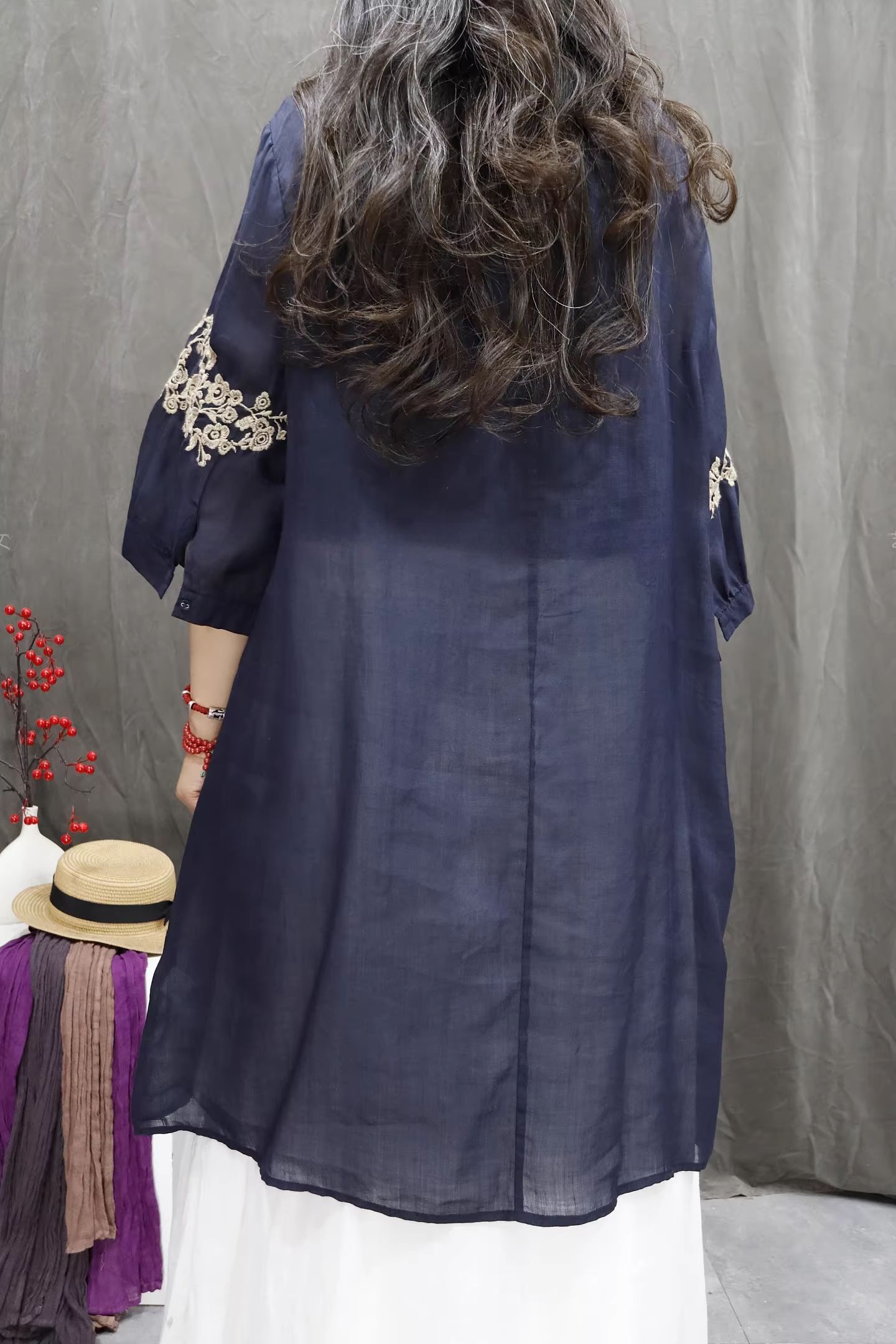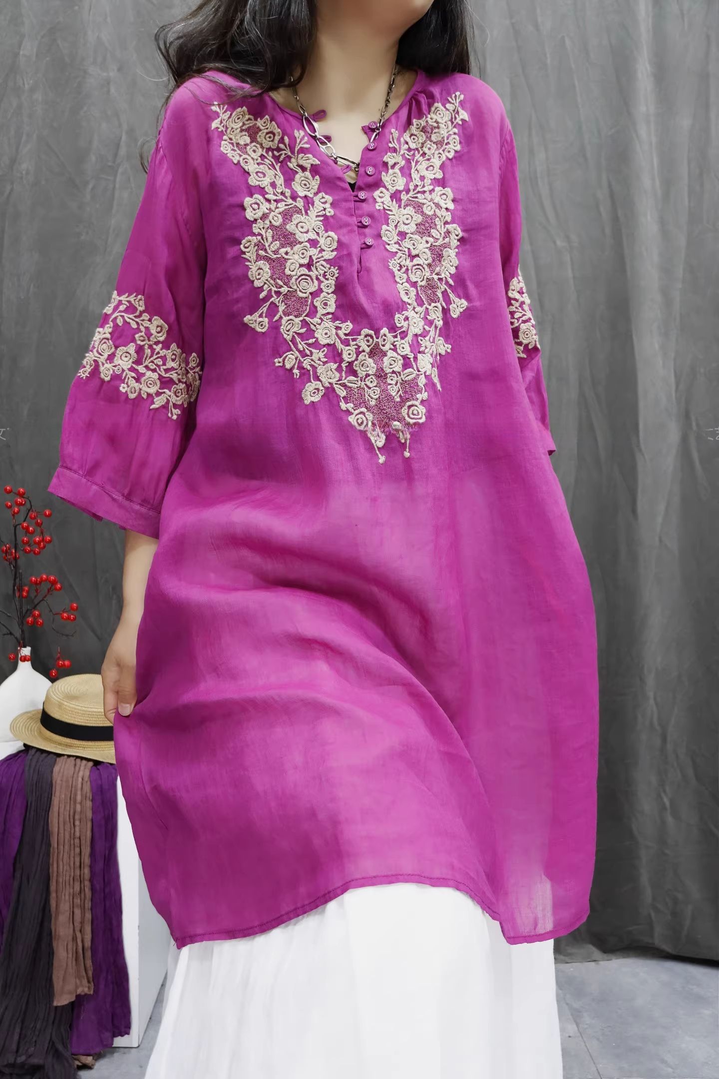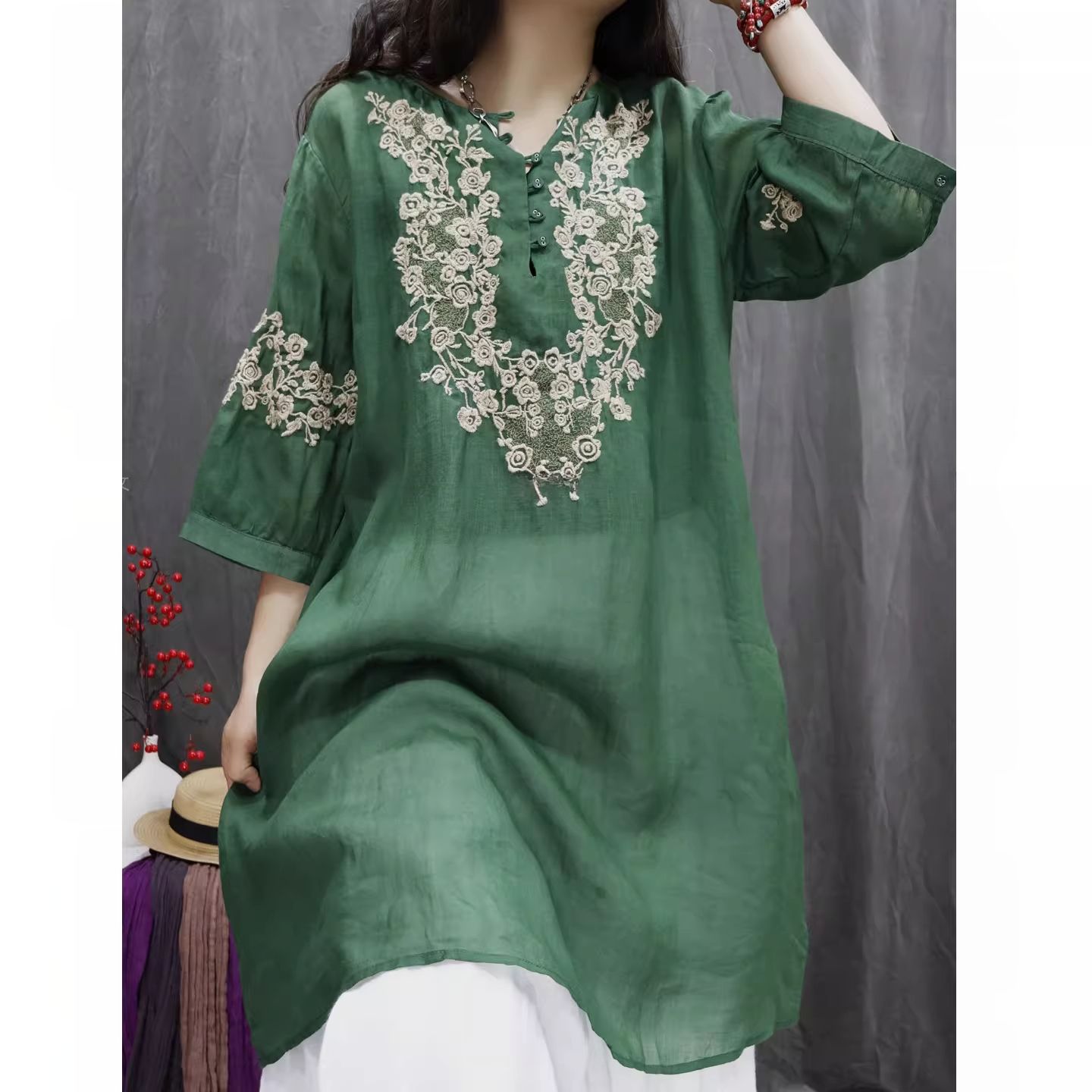 RY864# 2026春夏复古棉麻重工刺绣文艺百搭上衣宽松洋气中长款休闲衬衫裙
