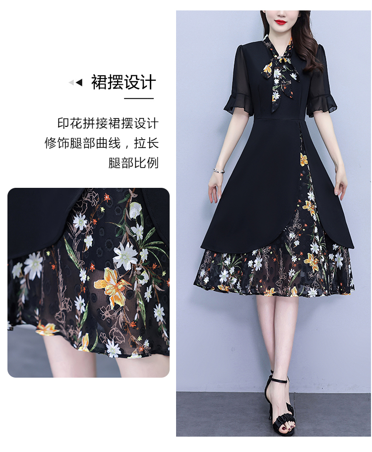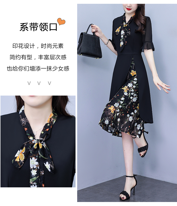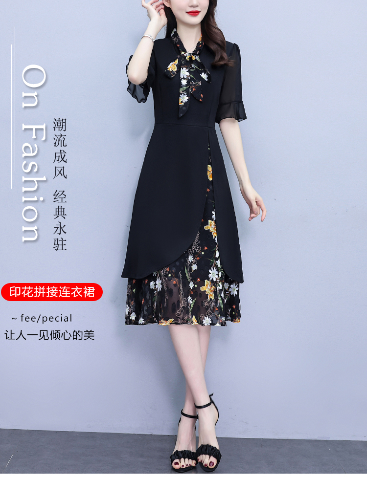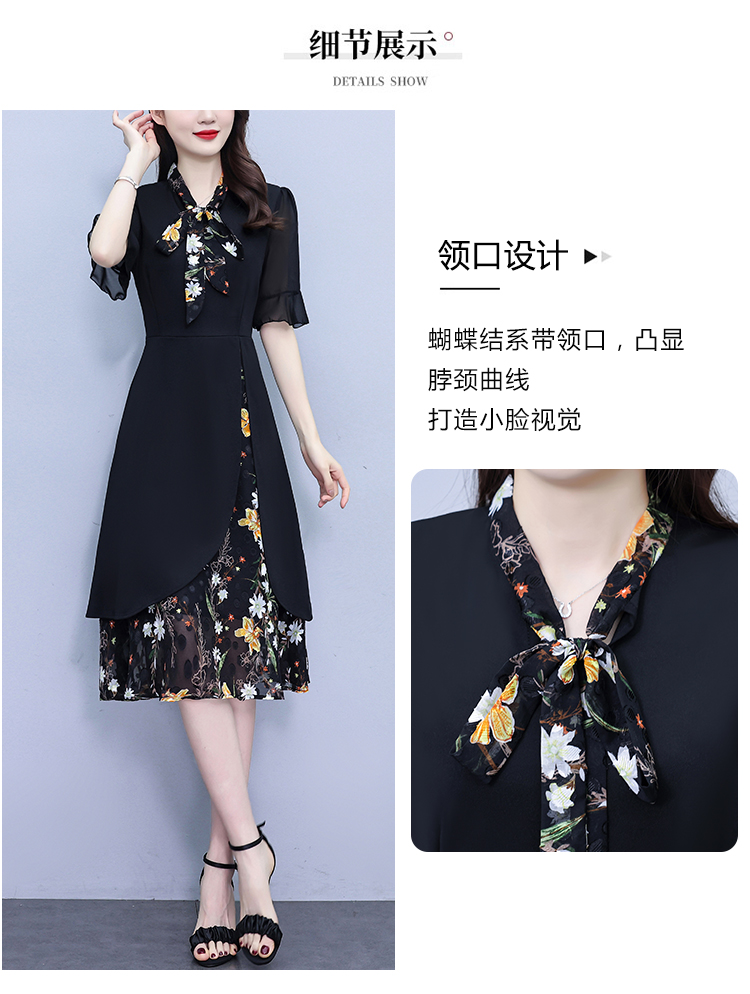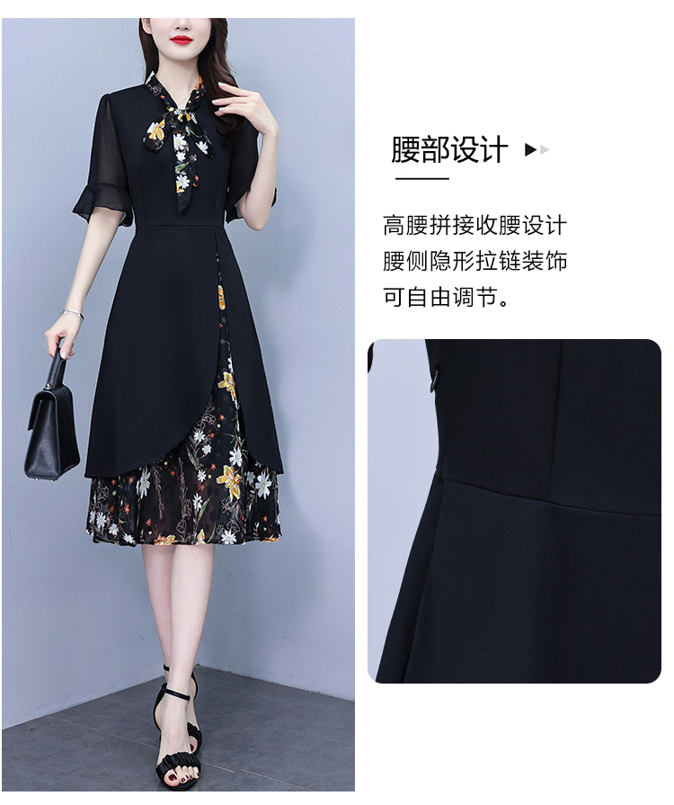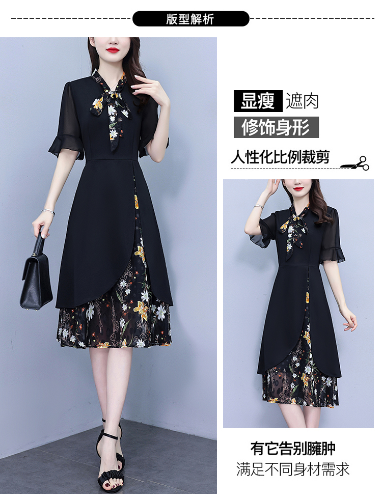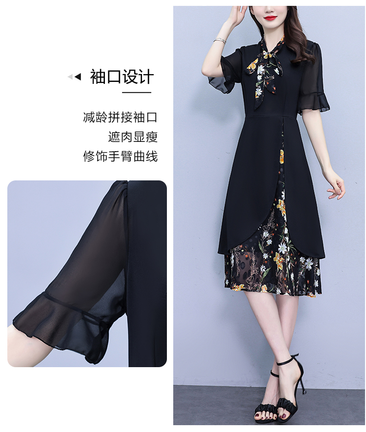RY889# 中年妈妈大码女装2026新款短袖V领收腰显瘦遮肚子拼接雪纺连衣裙