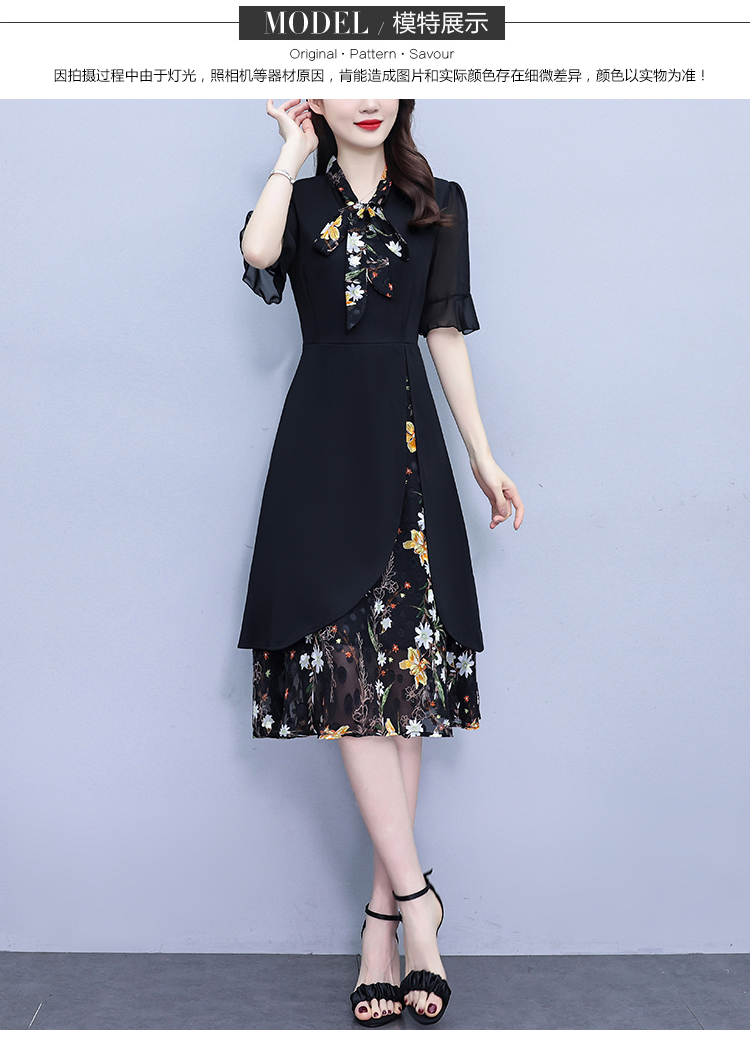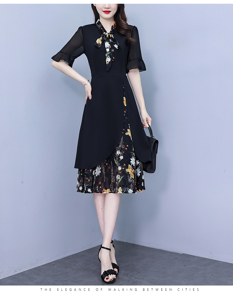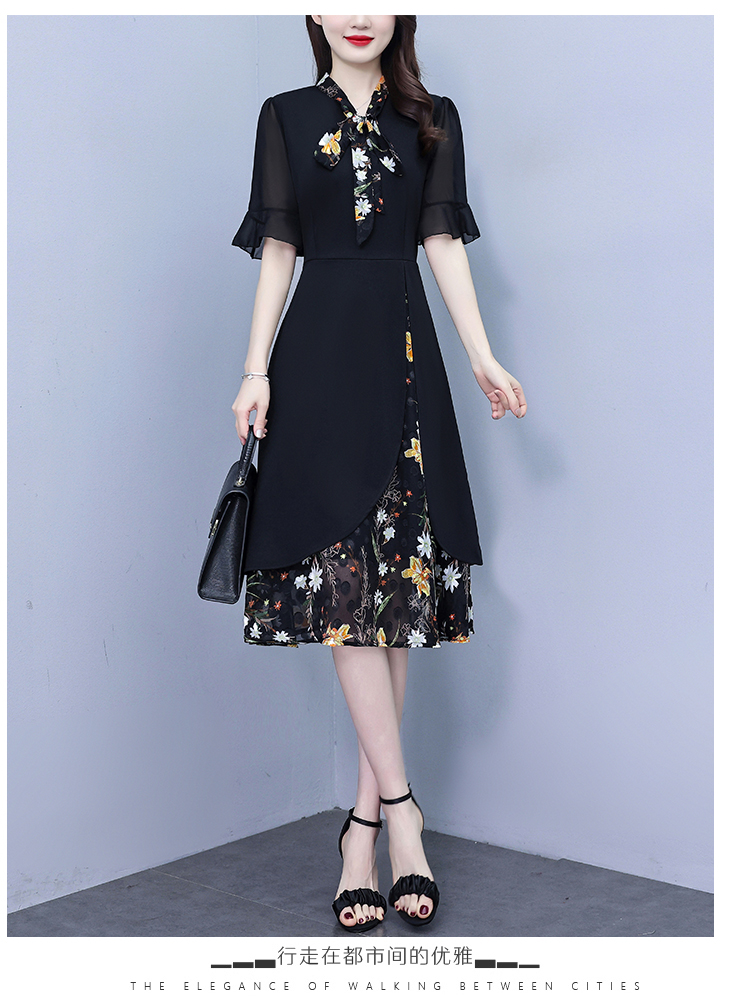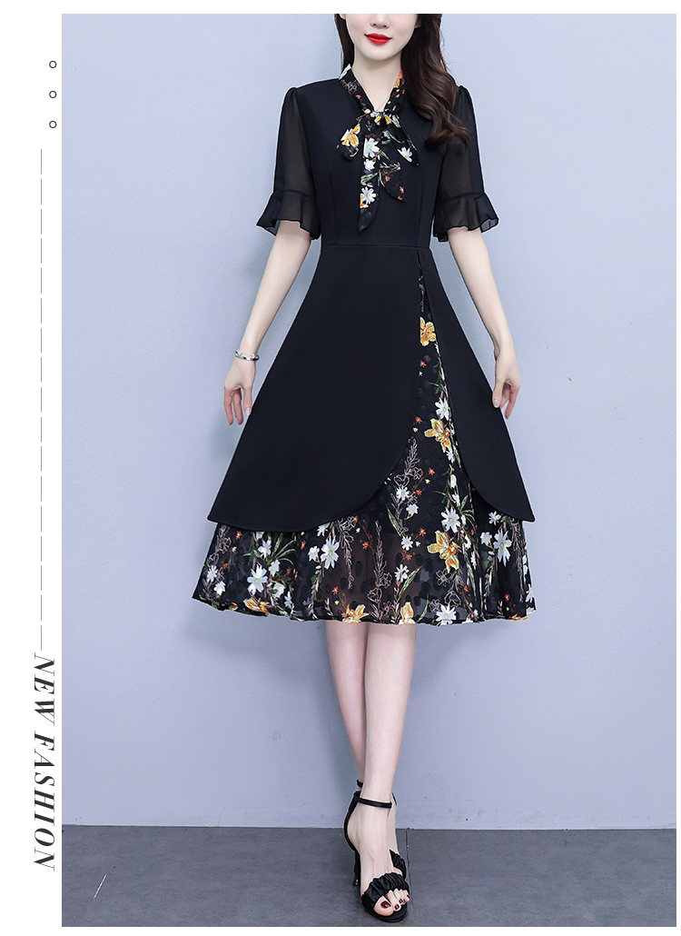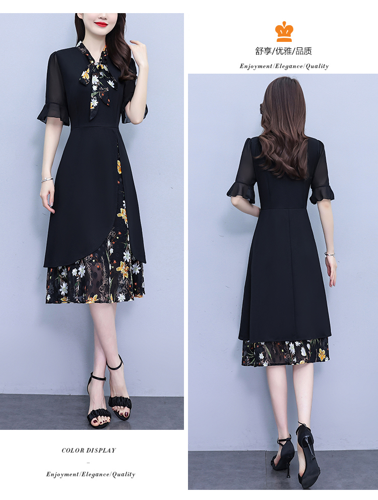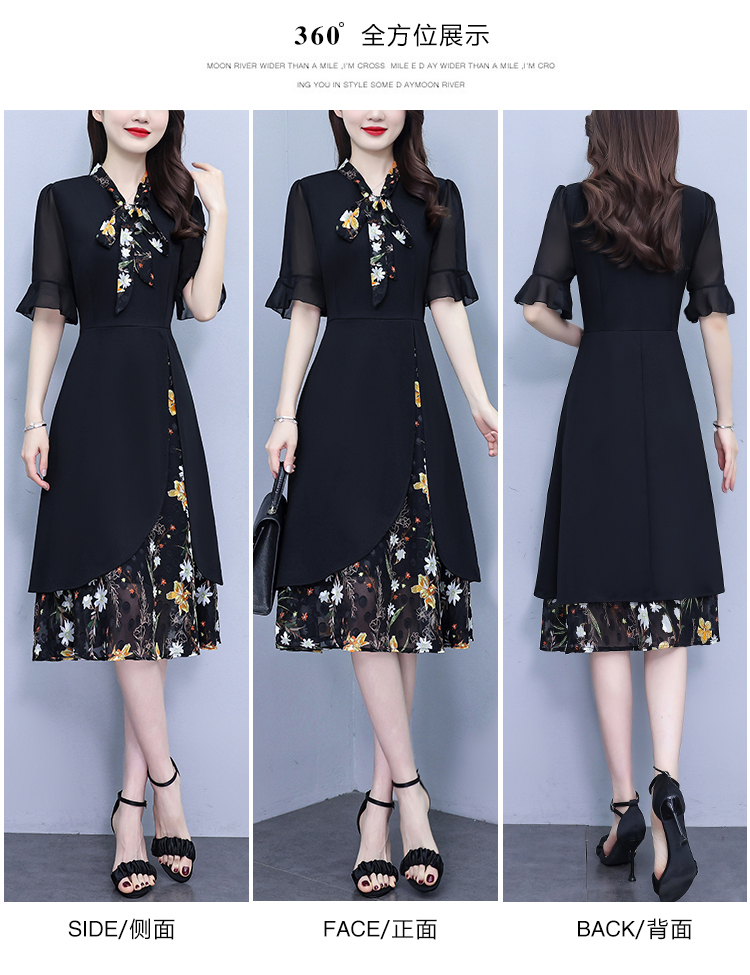 RY889# 中年妈妈大码女装2026新款短袖V领收腰显瘦遮肚子拼接雪纺连衣裙