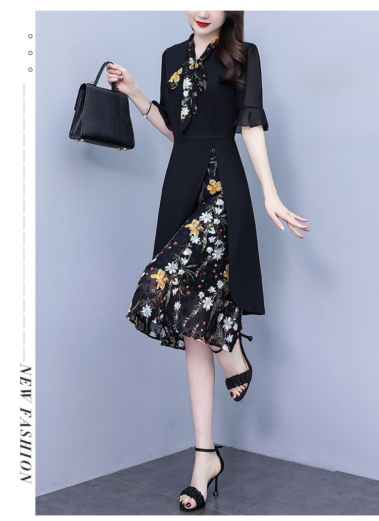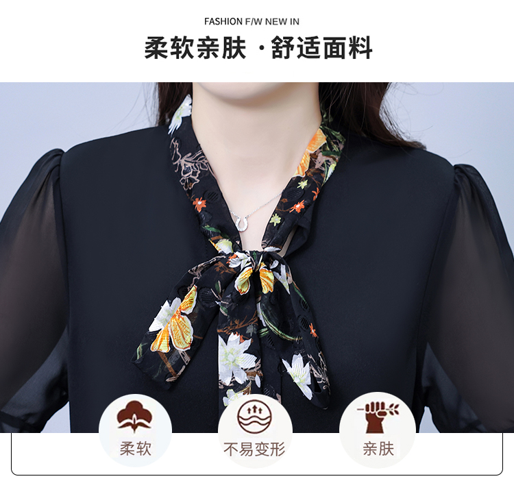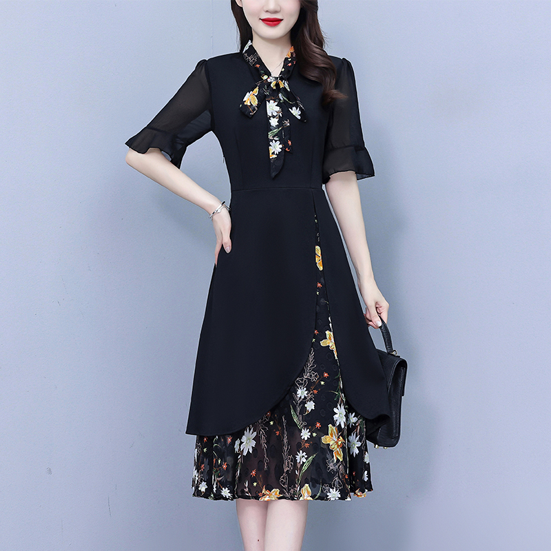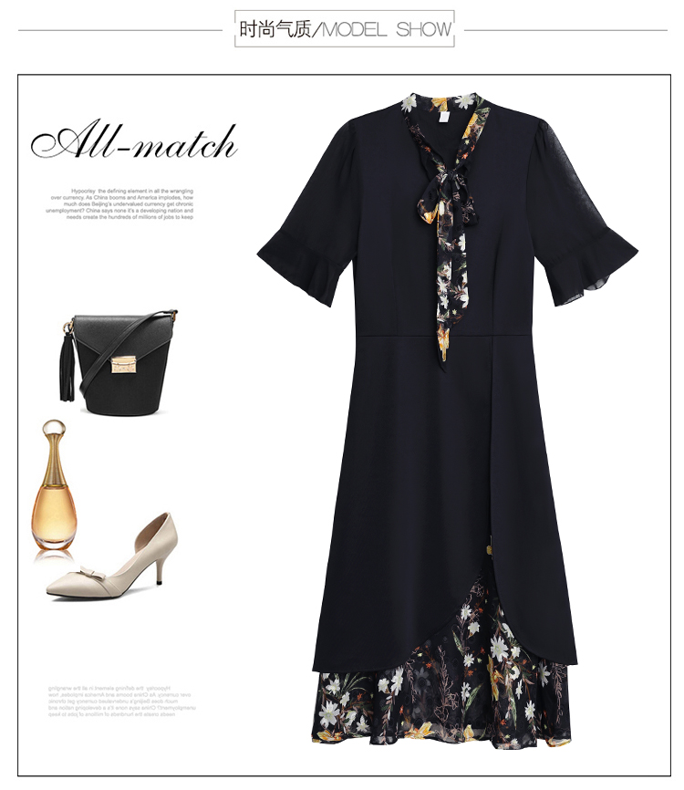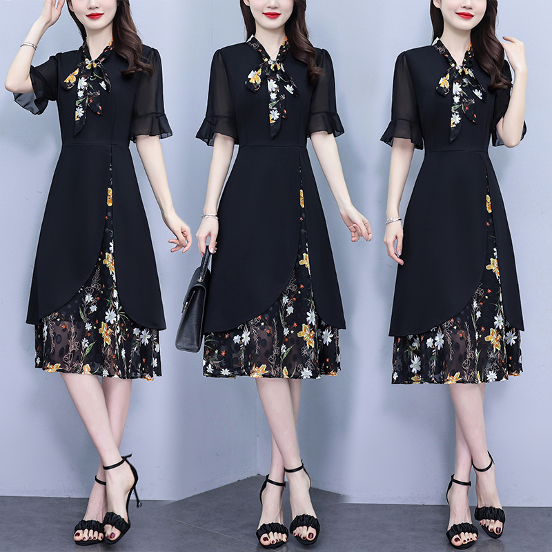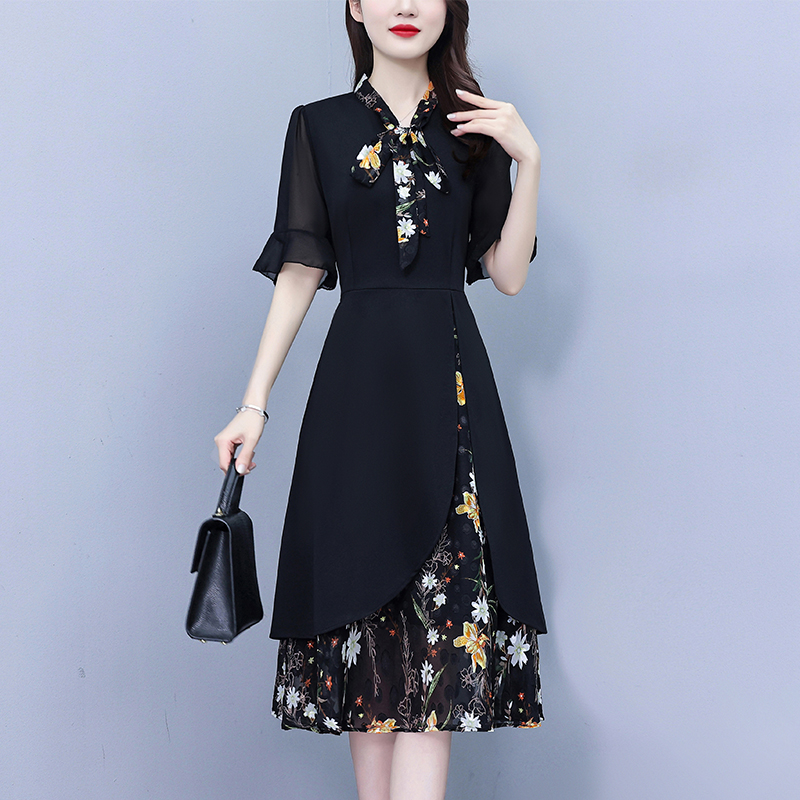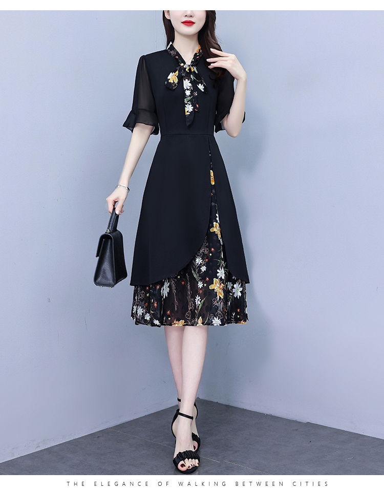 RY889# 中年妈妈大码女装2026新款短袖V领收腰显瘦遮肚子拼接雪纺连衣裙