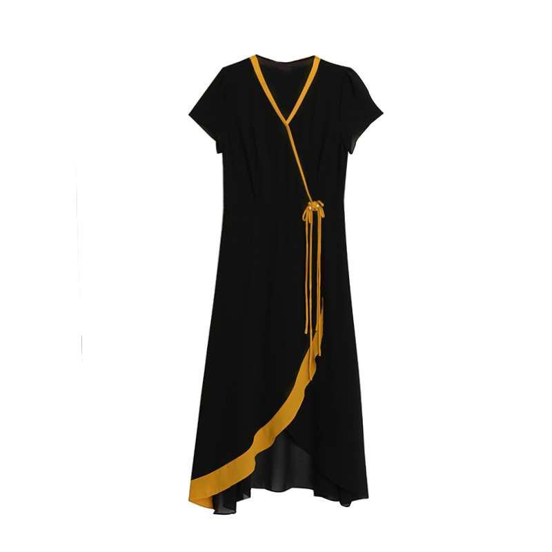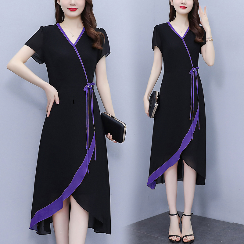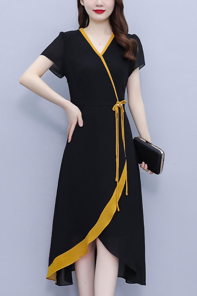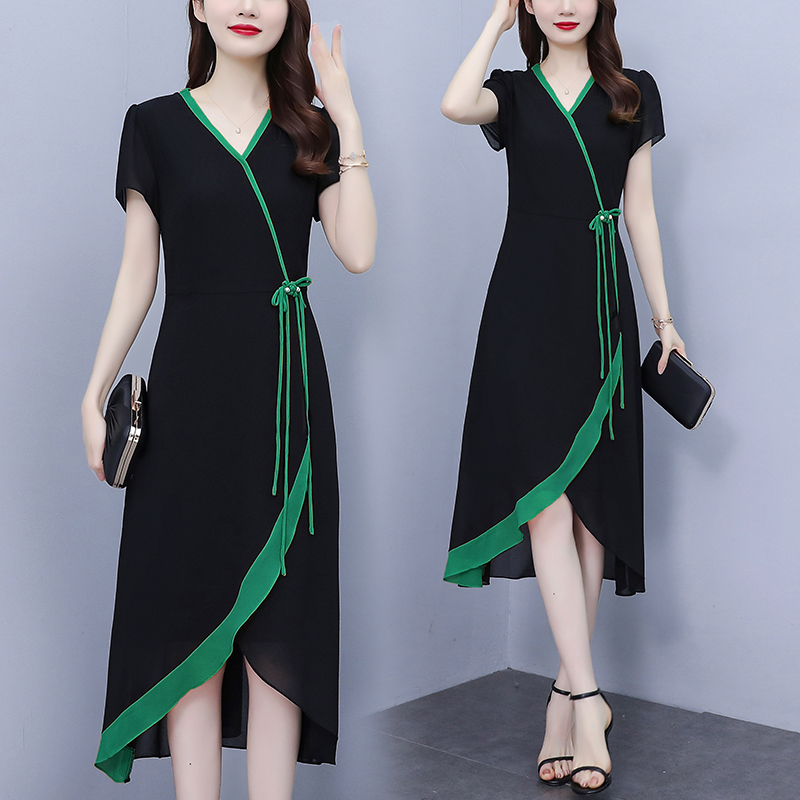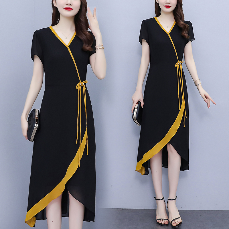 RY891# 2026黑色拼接碎花假两件连衣裙中年妈妈气质显瘦减龄遮肚子裙...
