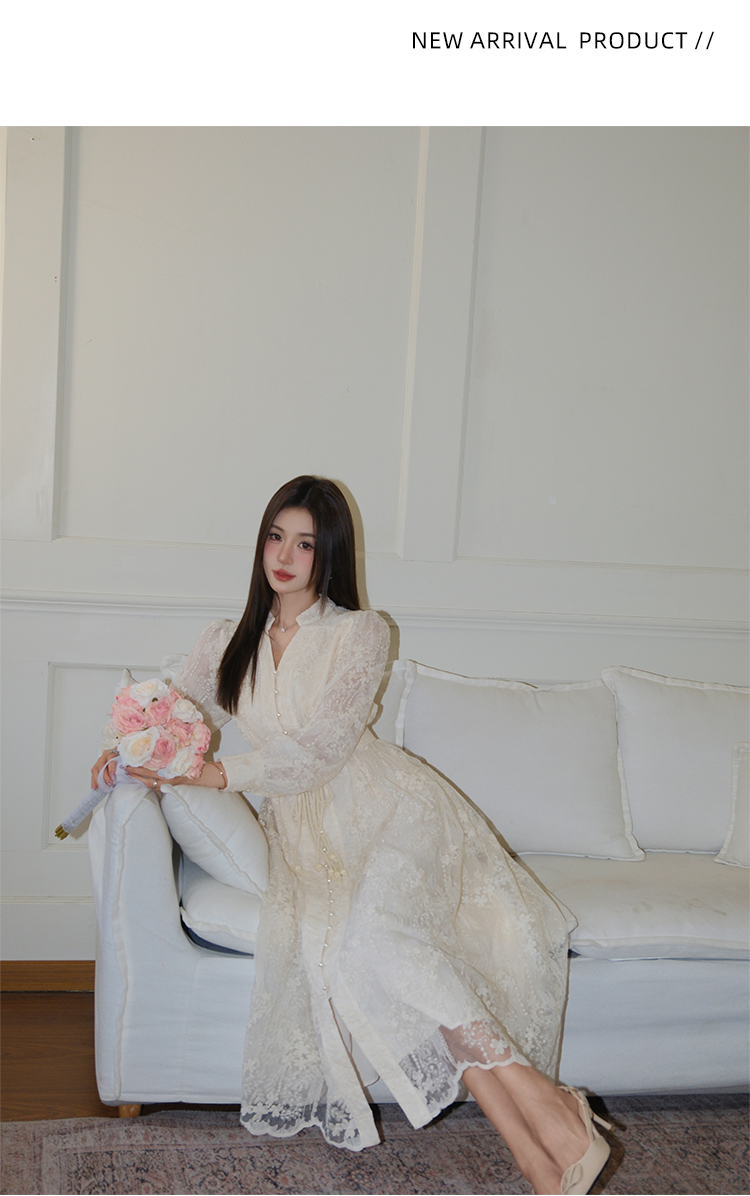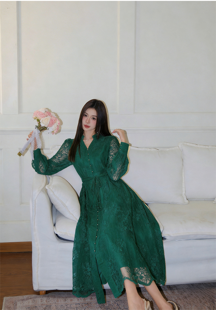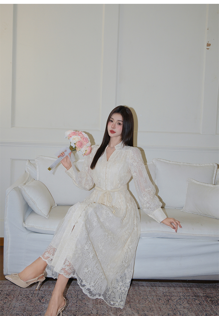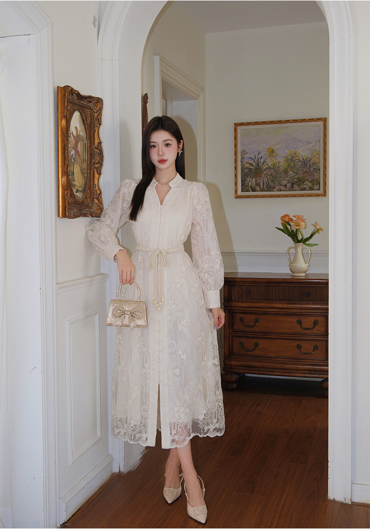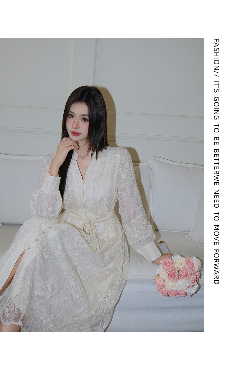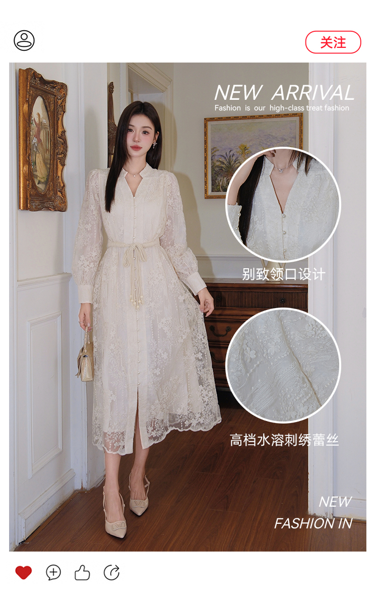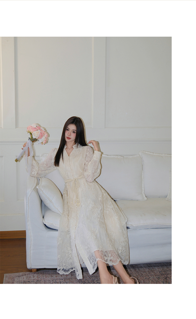 RY1273# 十三行品质 重工刺绣V领灯笼袖连衣裙收腰显瘦大摆长裙子7297