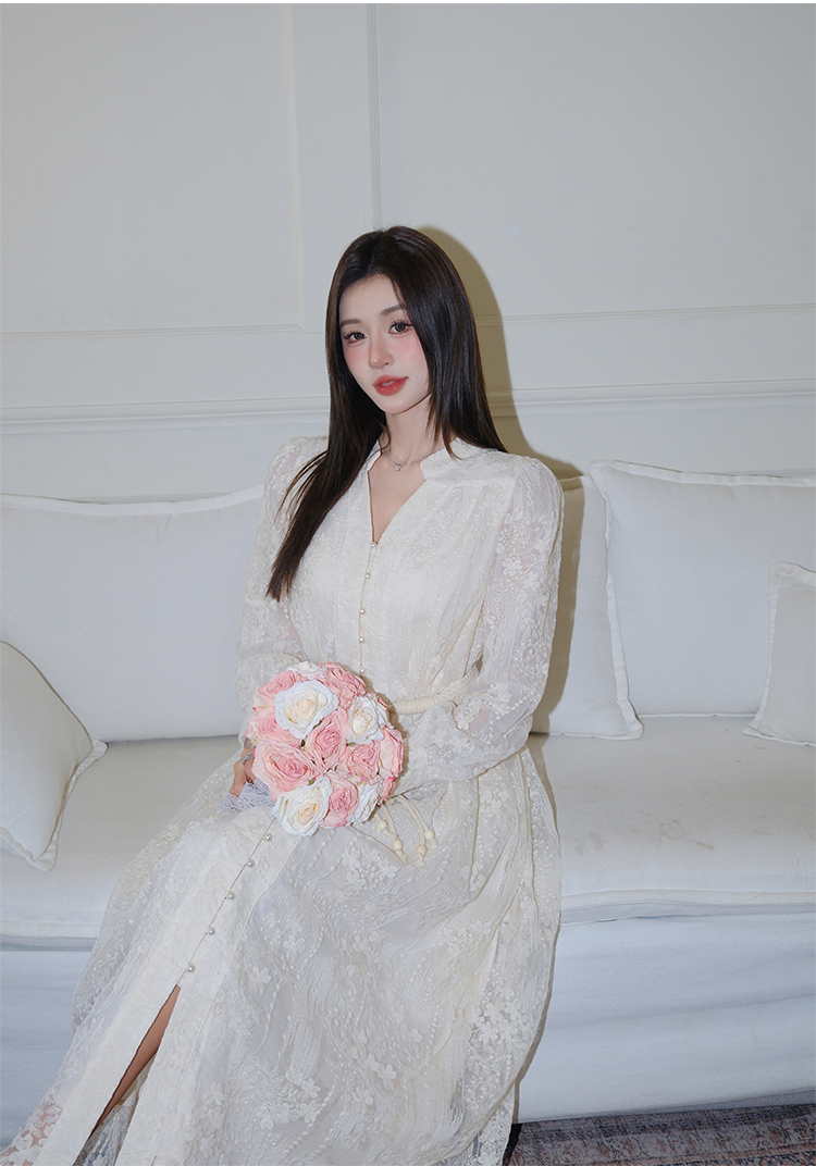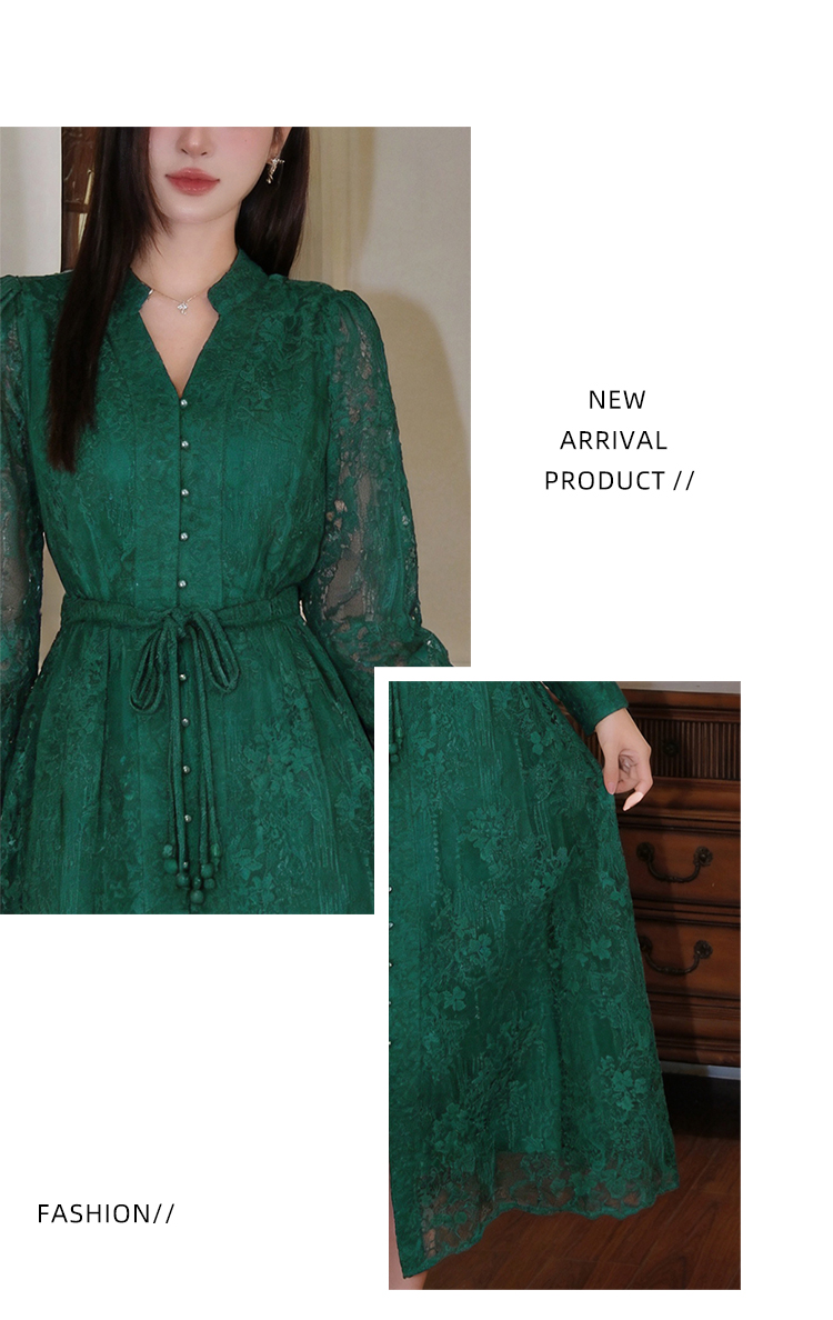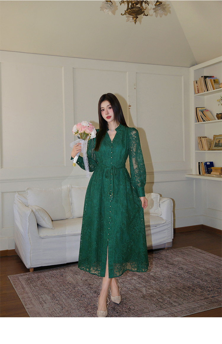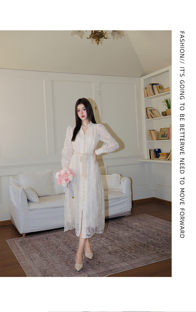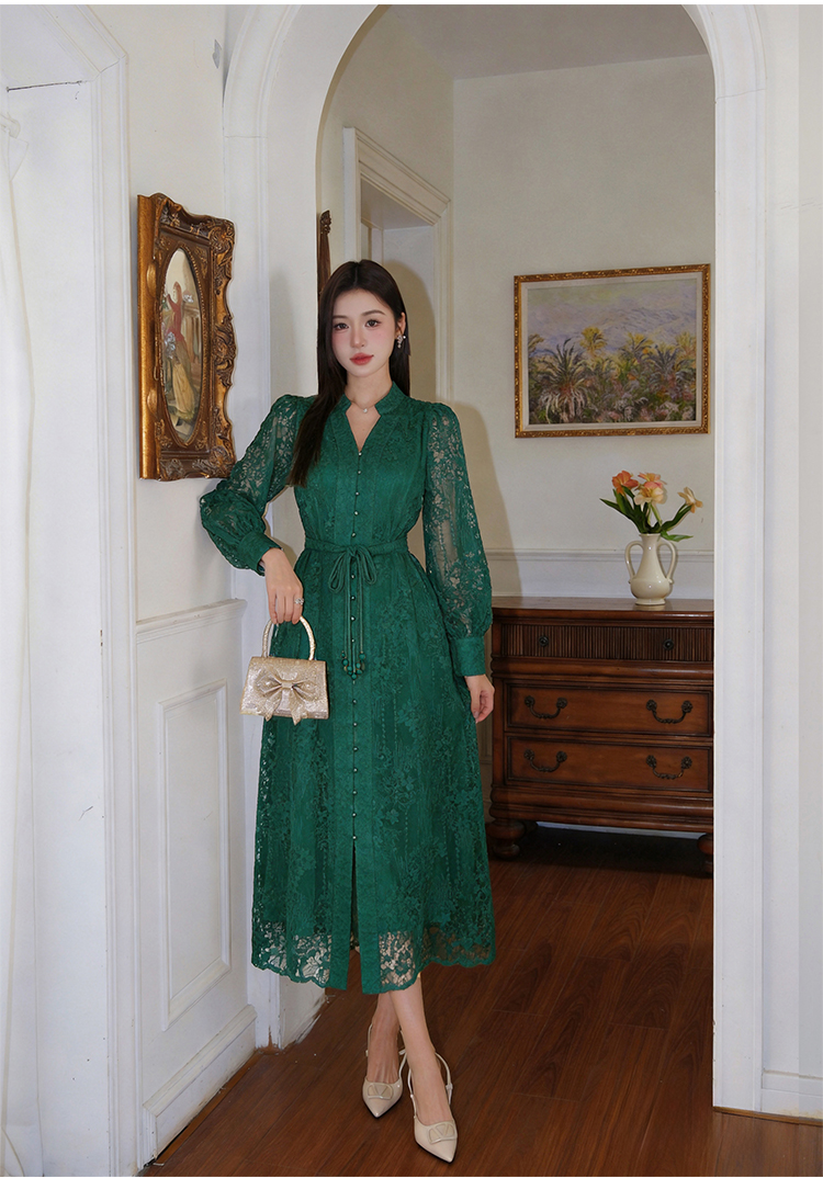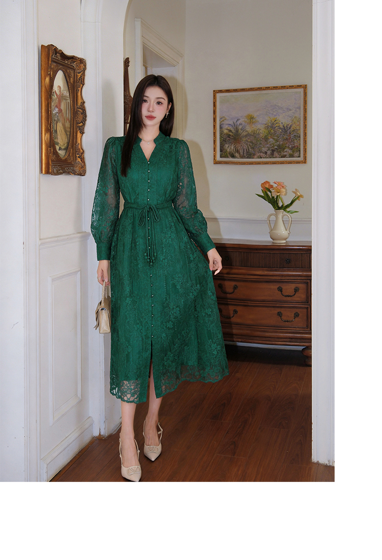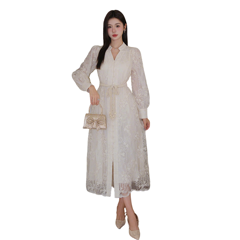 RY1273# 十三行品质 重工刺绣V领灯笼袖连衣裙收腰显瘦大摆长裙子7297
