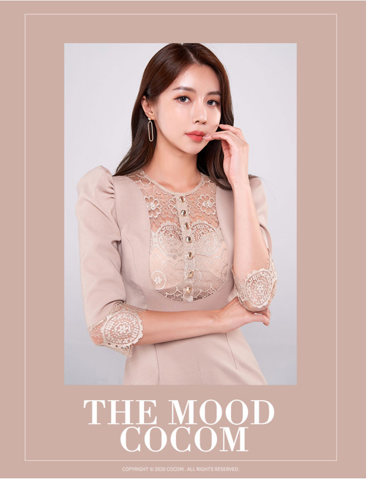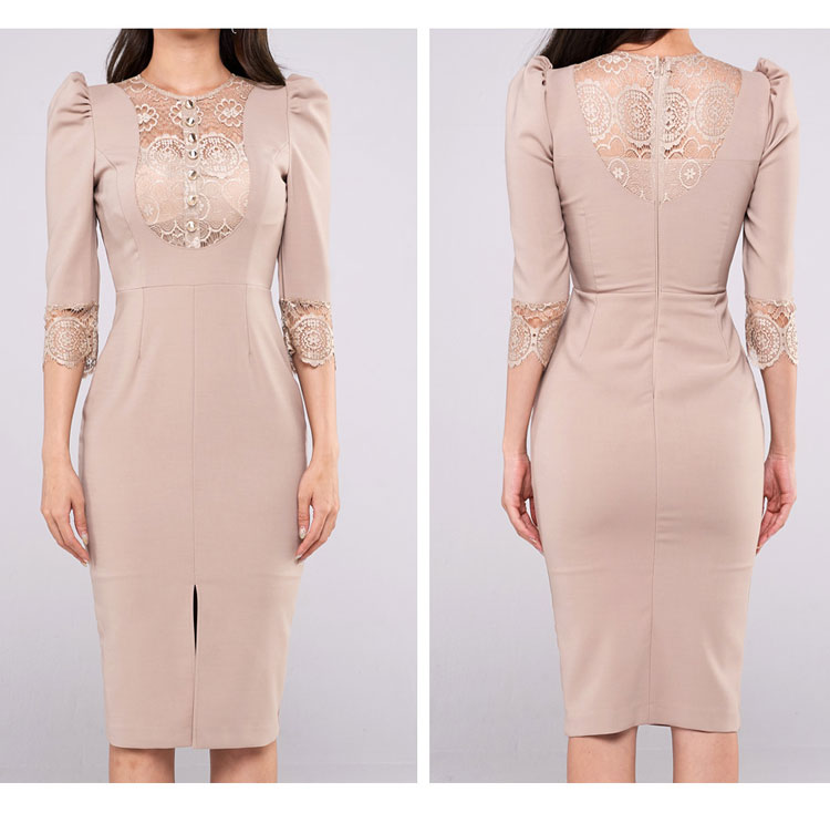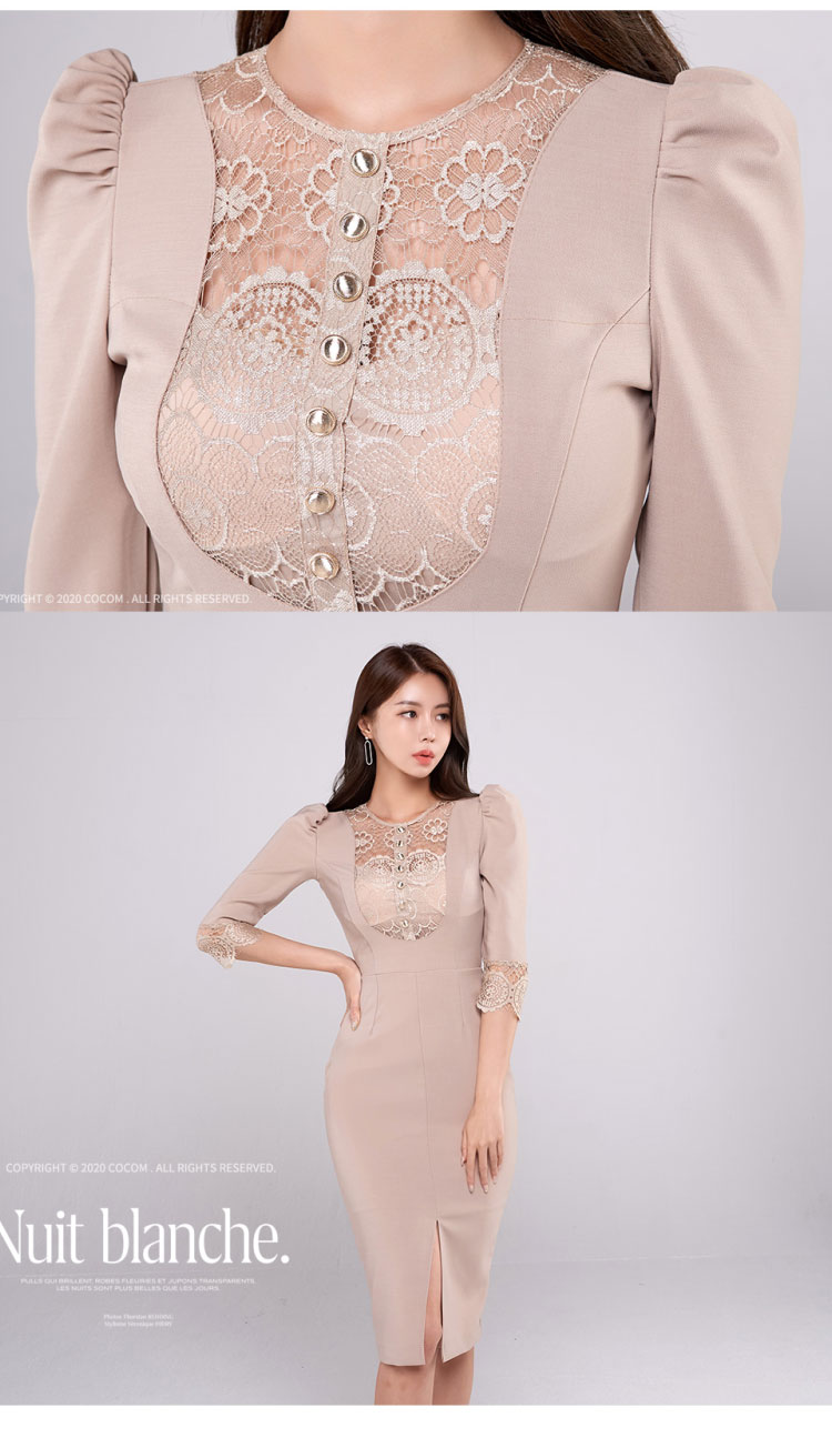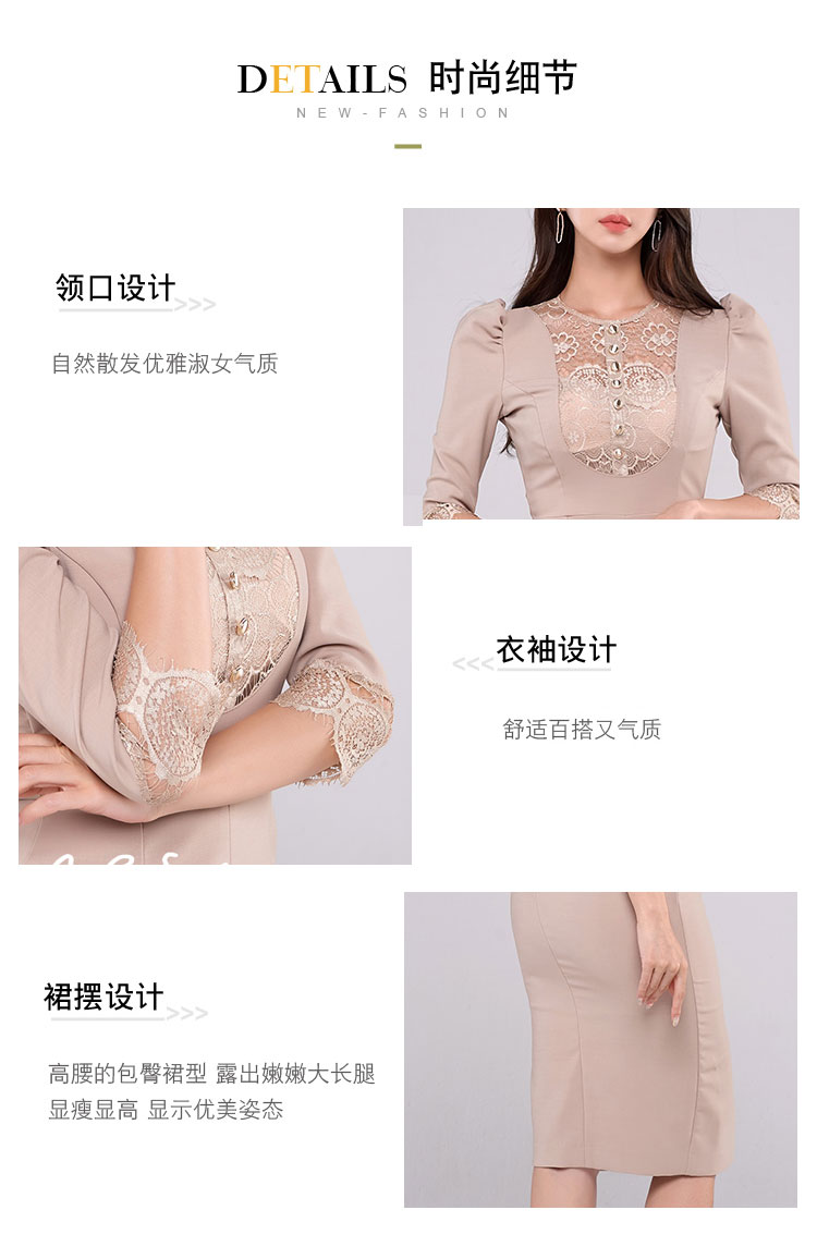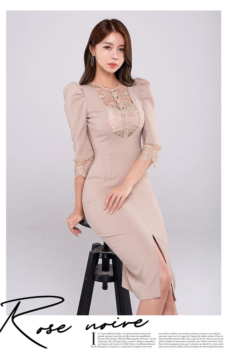 RY1275# 蕾丝拼接连衣裙女泡泡袖中袖收腰包臀开叉裙气质修身裙