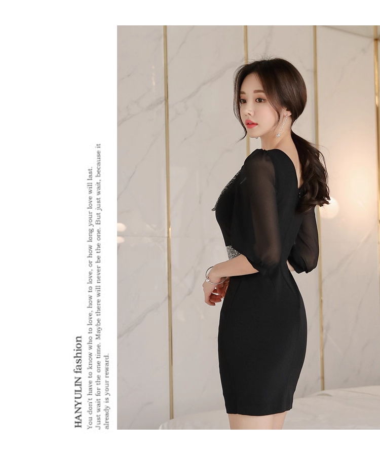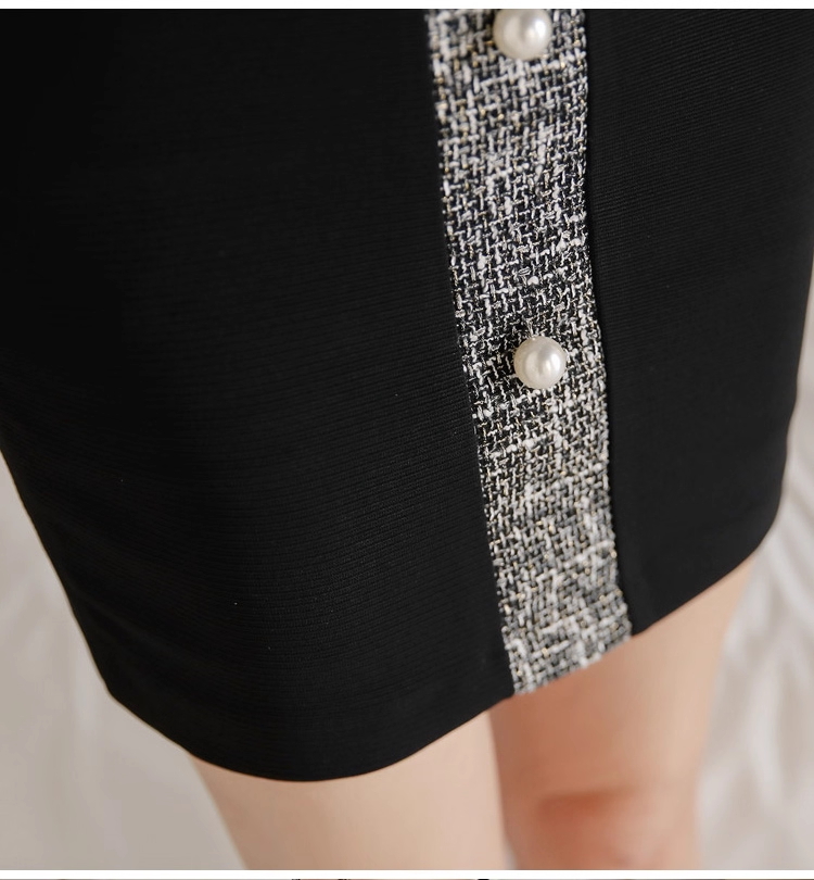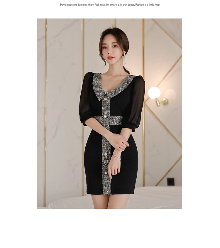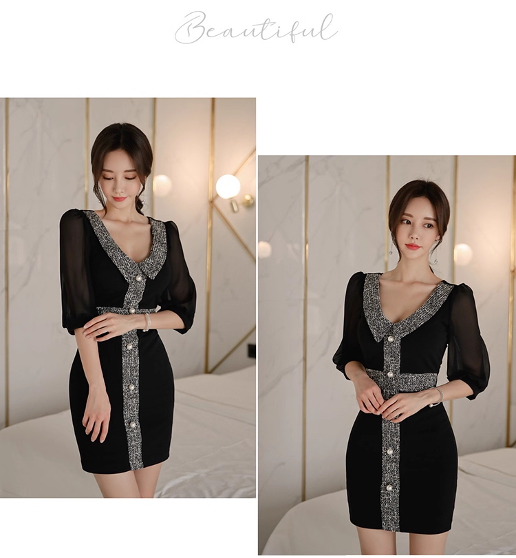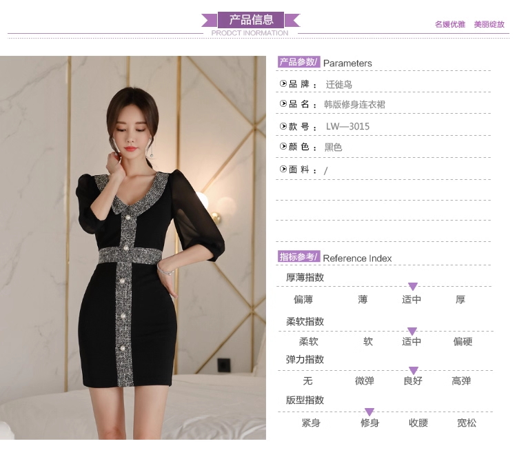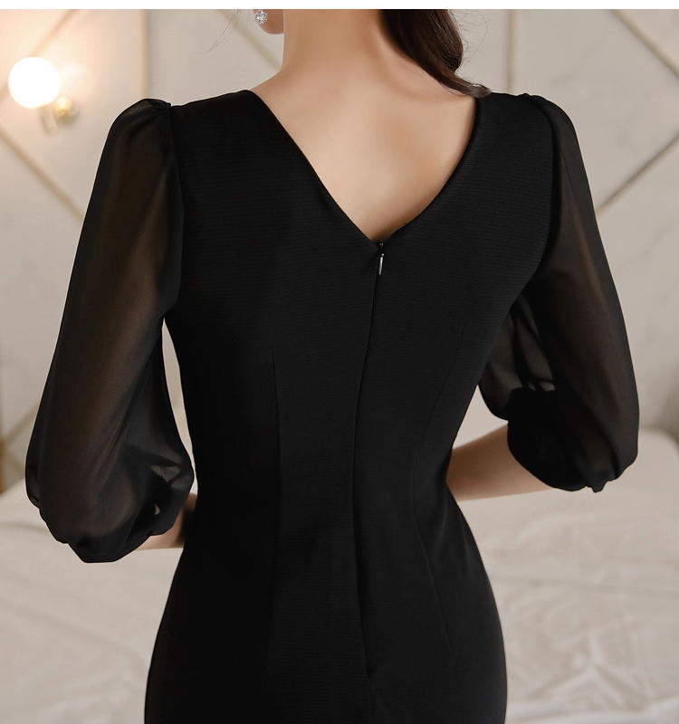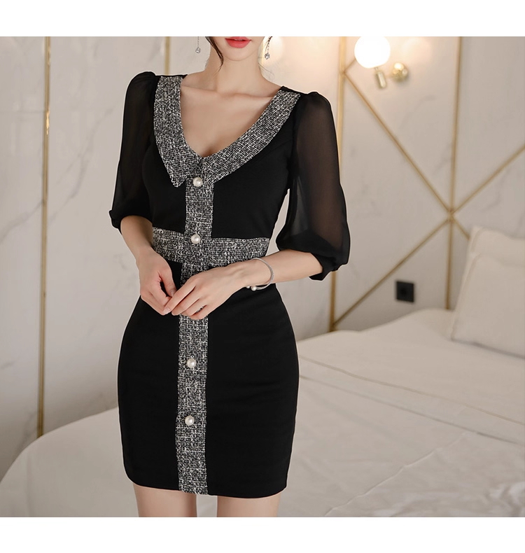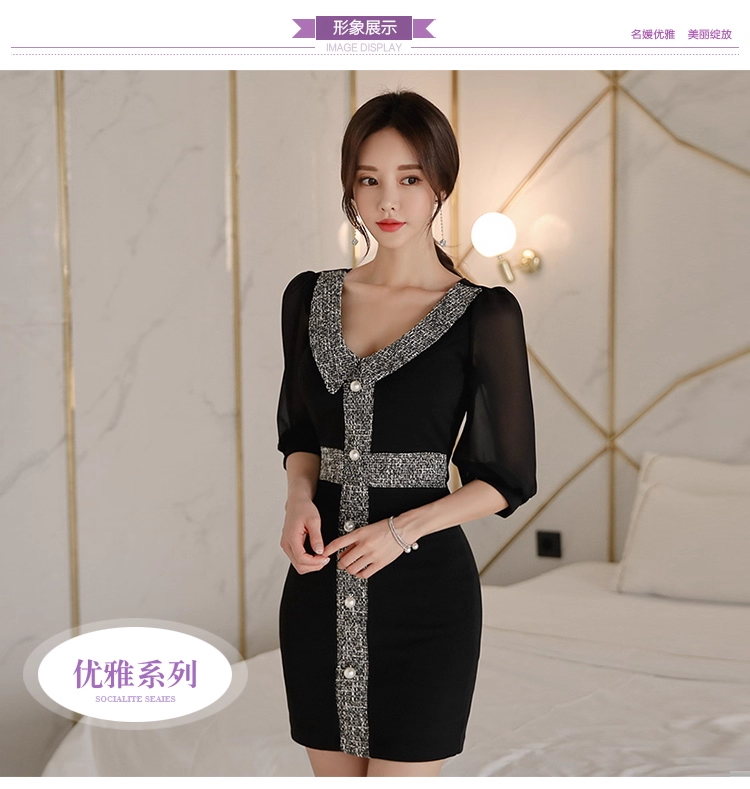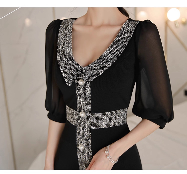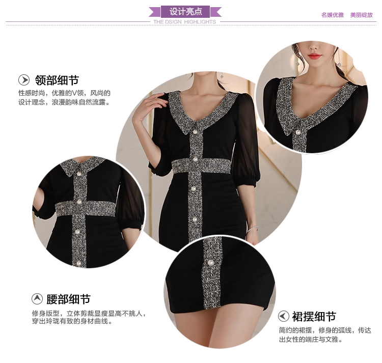 RY1276# 新款小香风连衣裙女V领雪纺中袖收腰显瘦包臀气质小黑裙