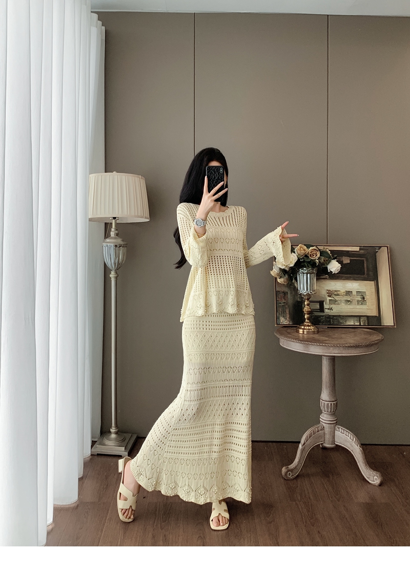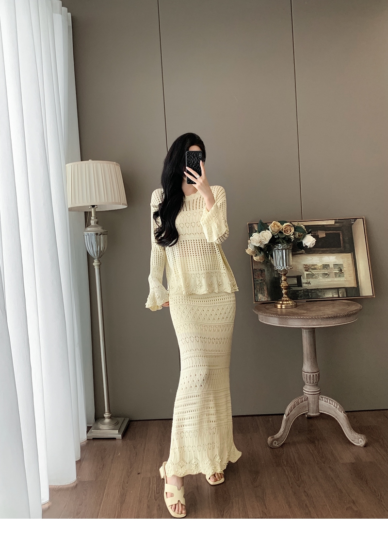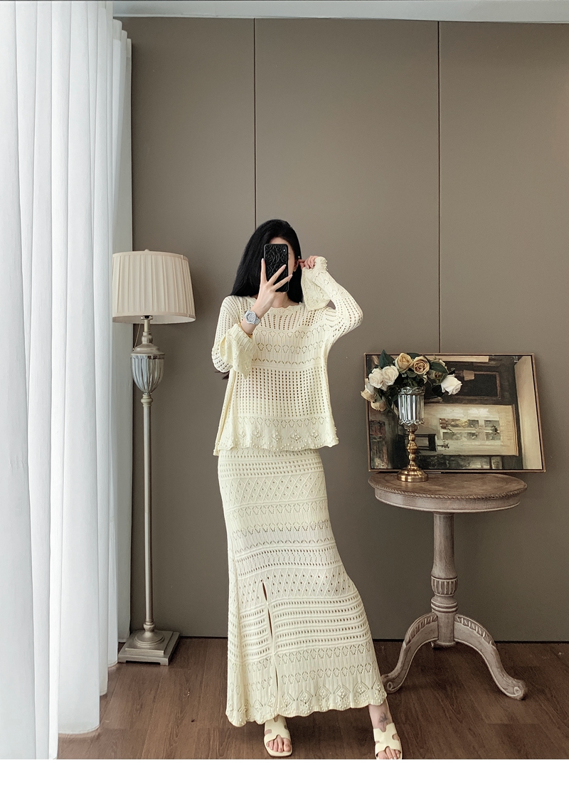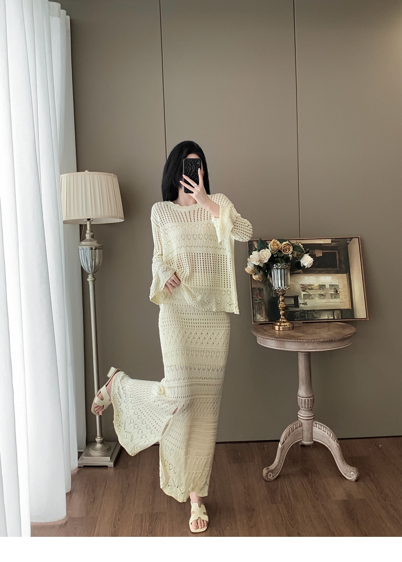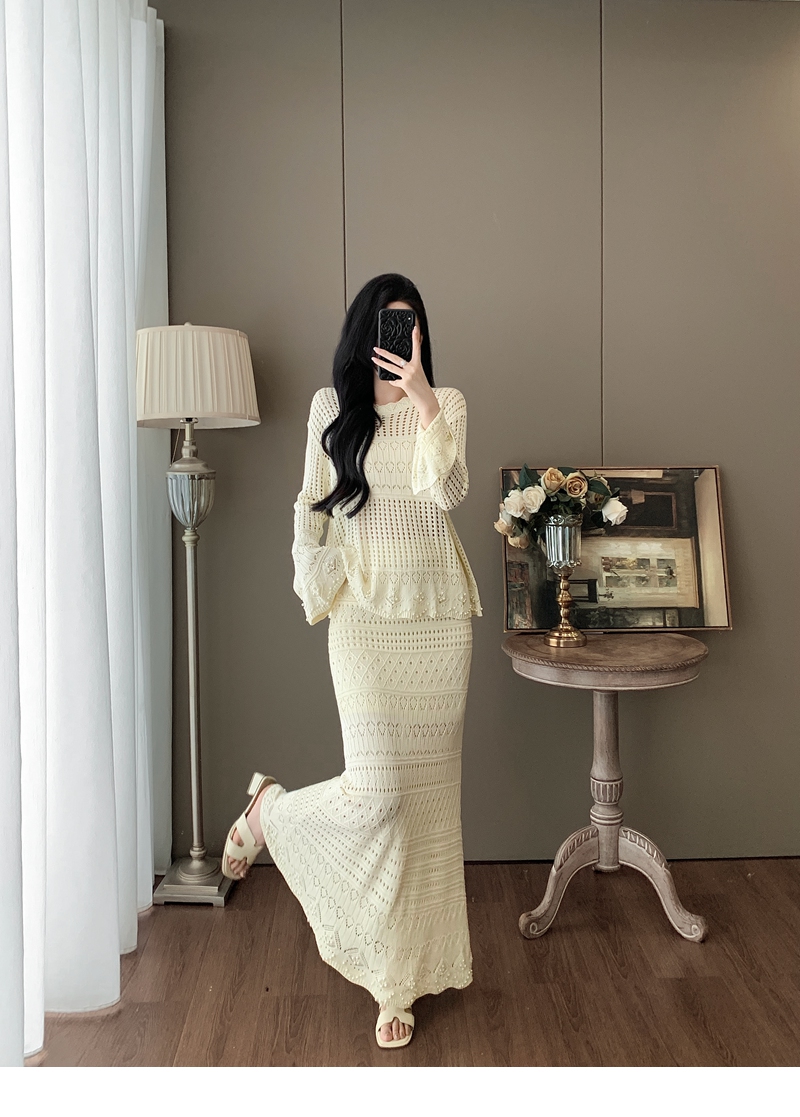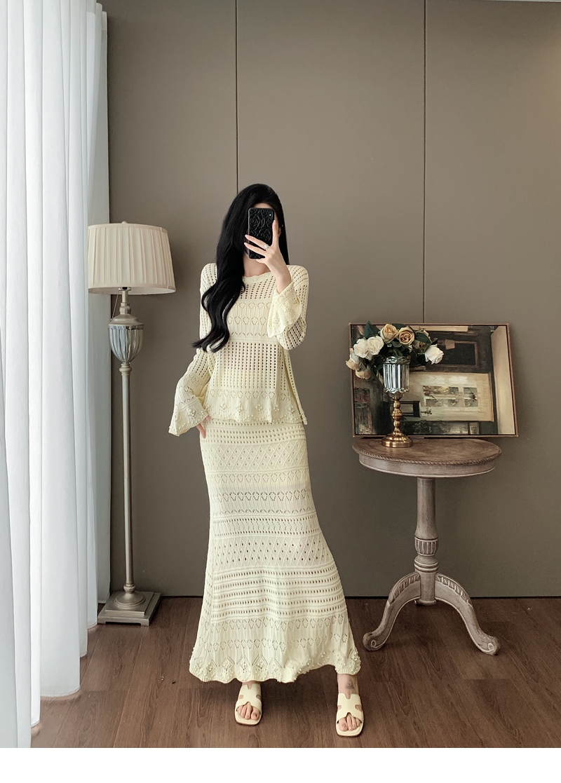 RY1283# 法式小香风淑女针织套装女2025秋季新款温柔杏镂空上衣长裙两件套