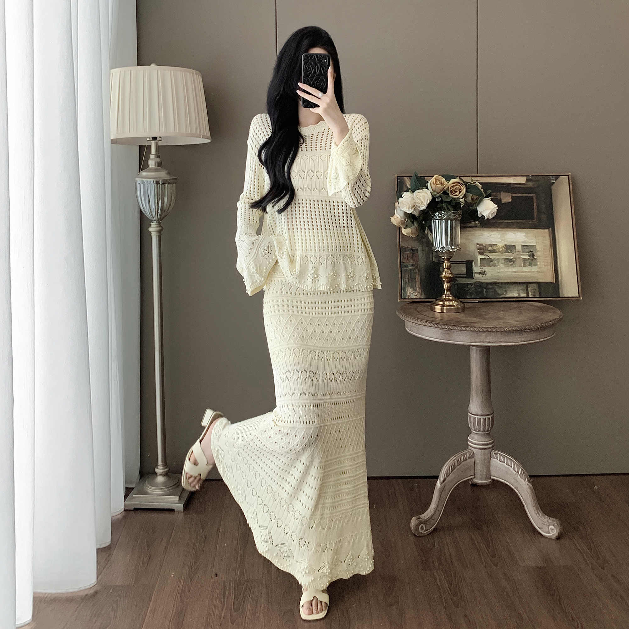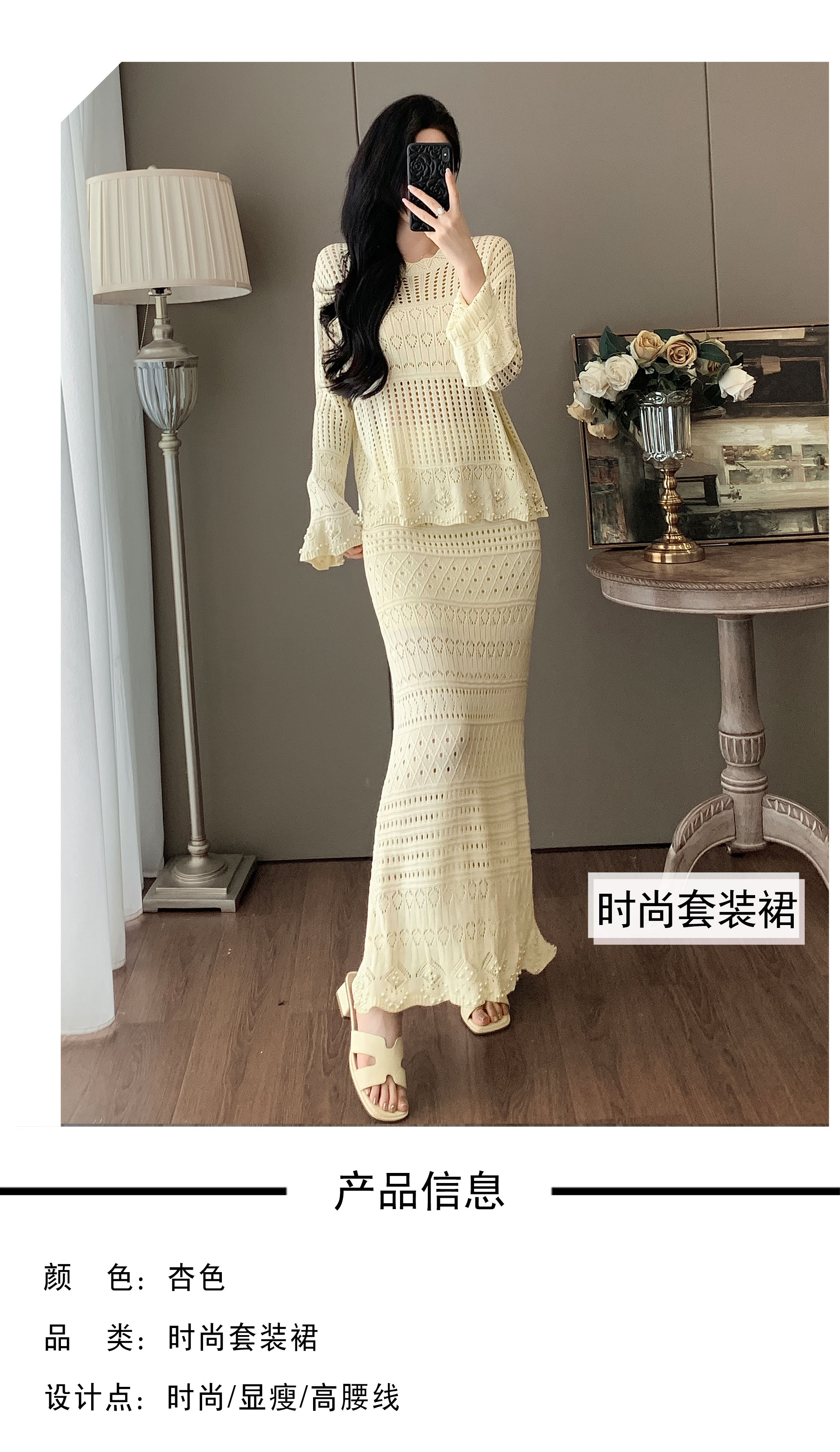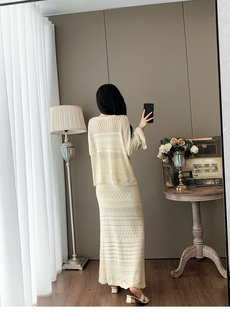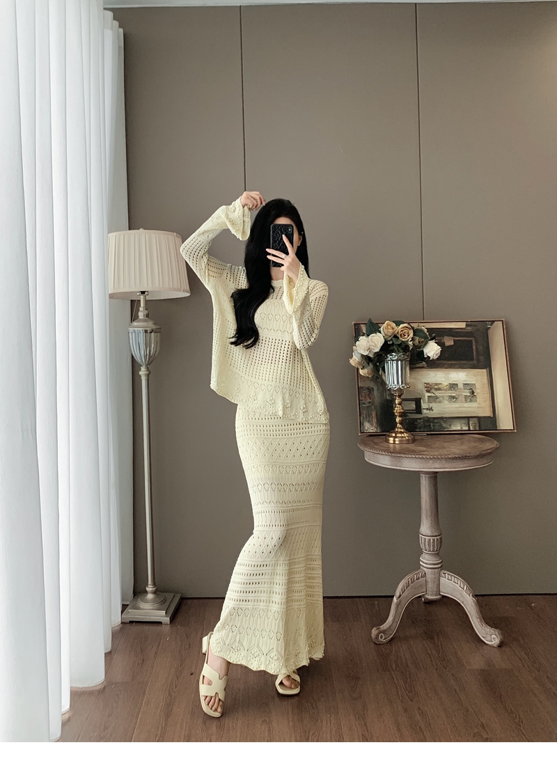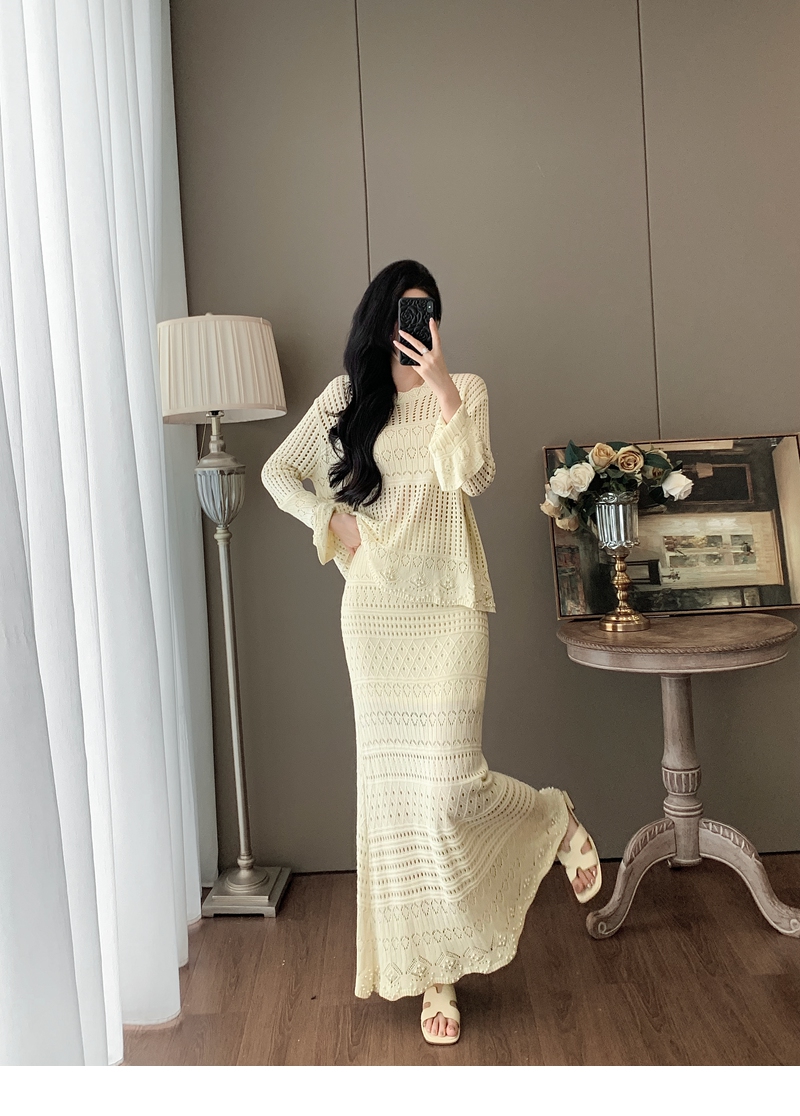 RY1283# 法式小香风淑女针织套装女2025秋季新款温柔杏镂空上衣长裙两件套