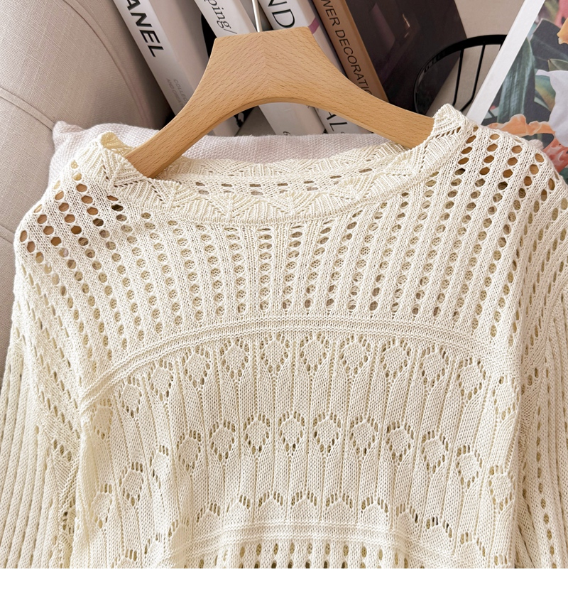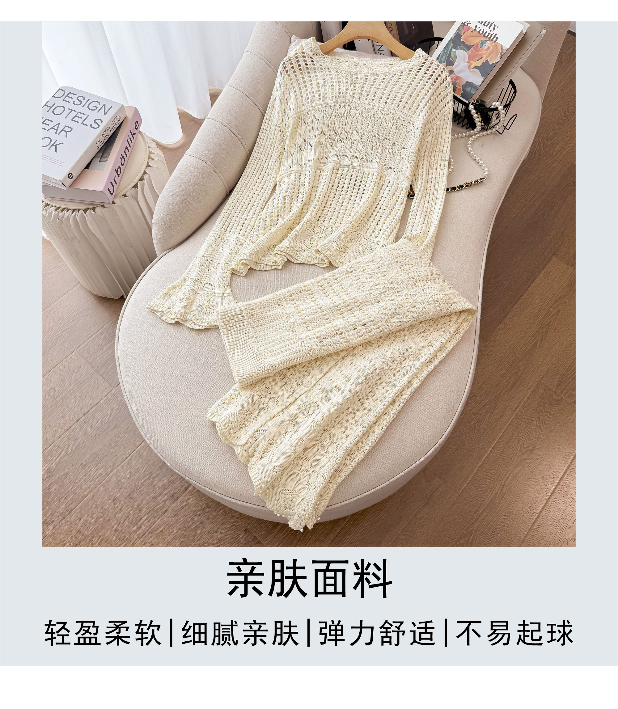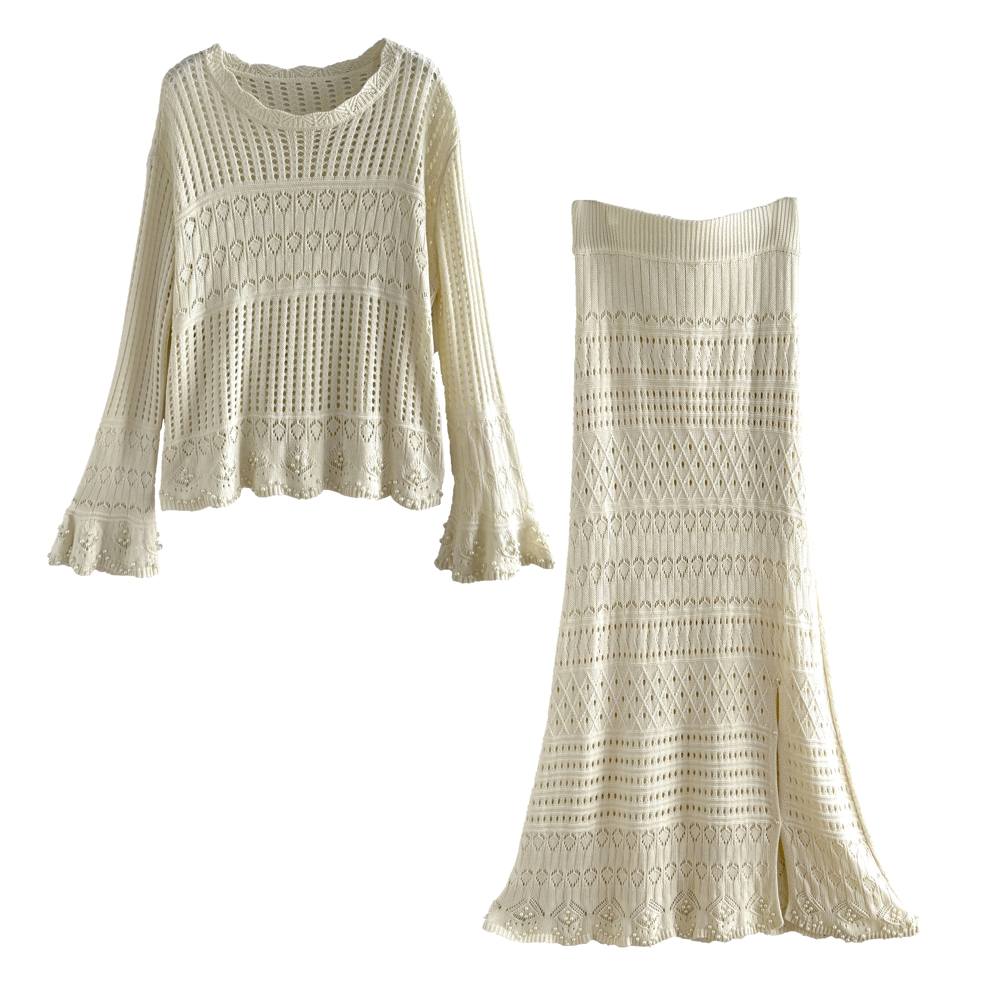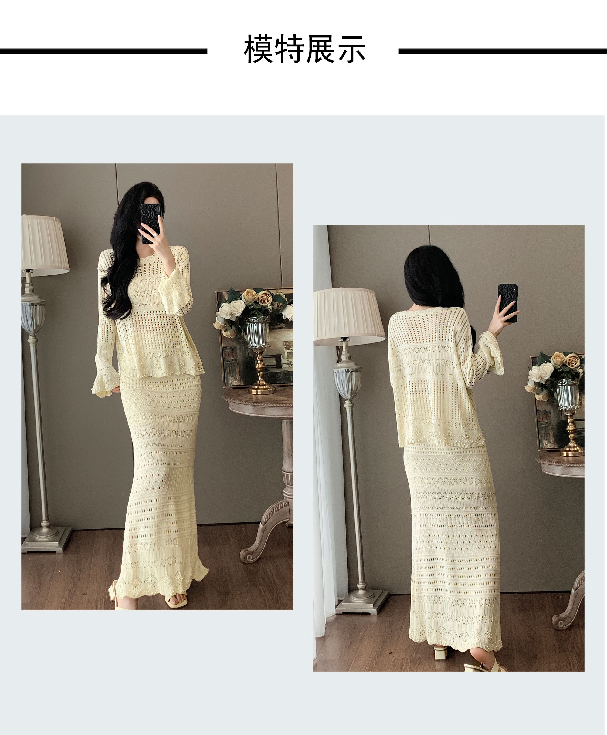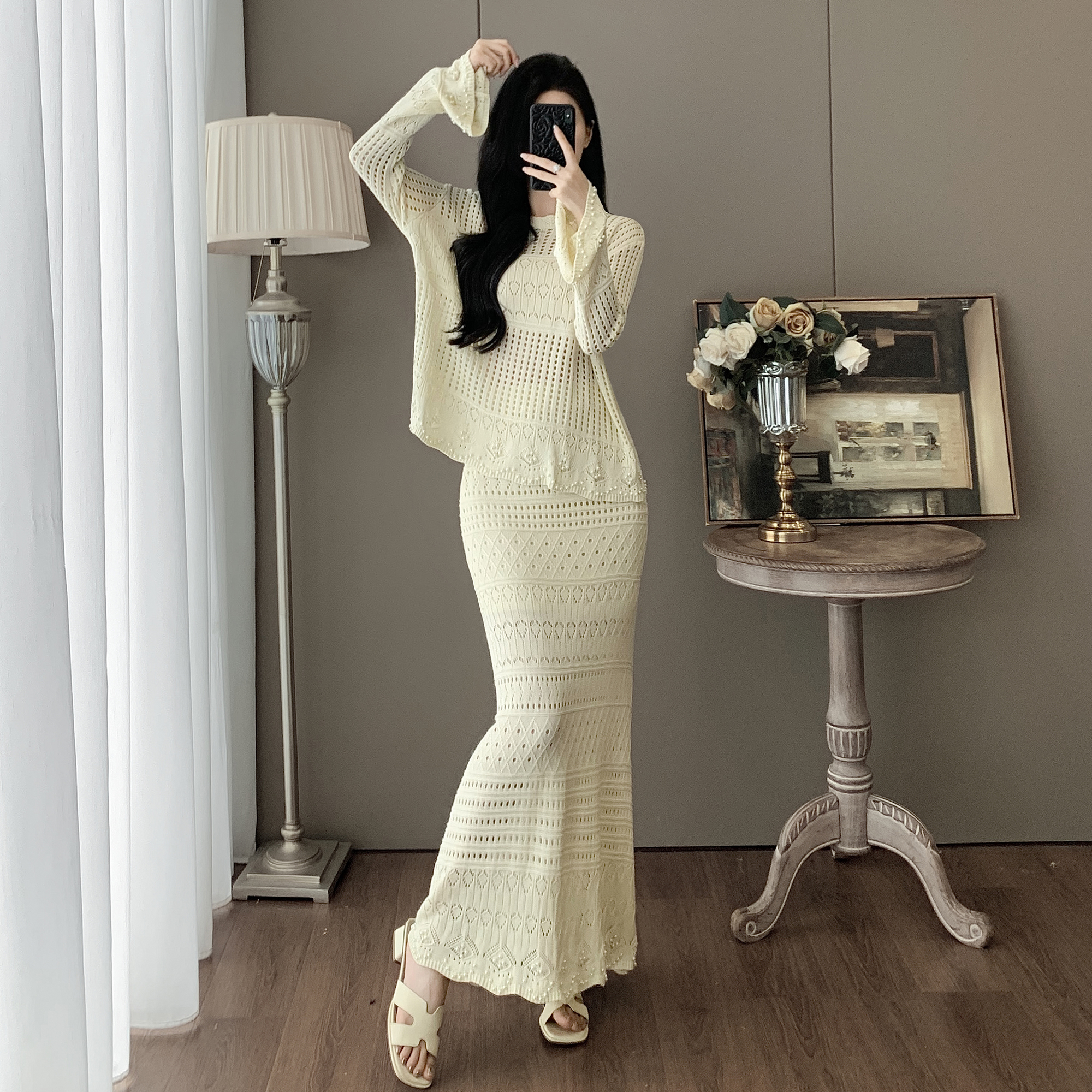 RY1283# 法式小香风淑女针织套装女2025秋季新款温柔杏镂空上衣长裙两件套