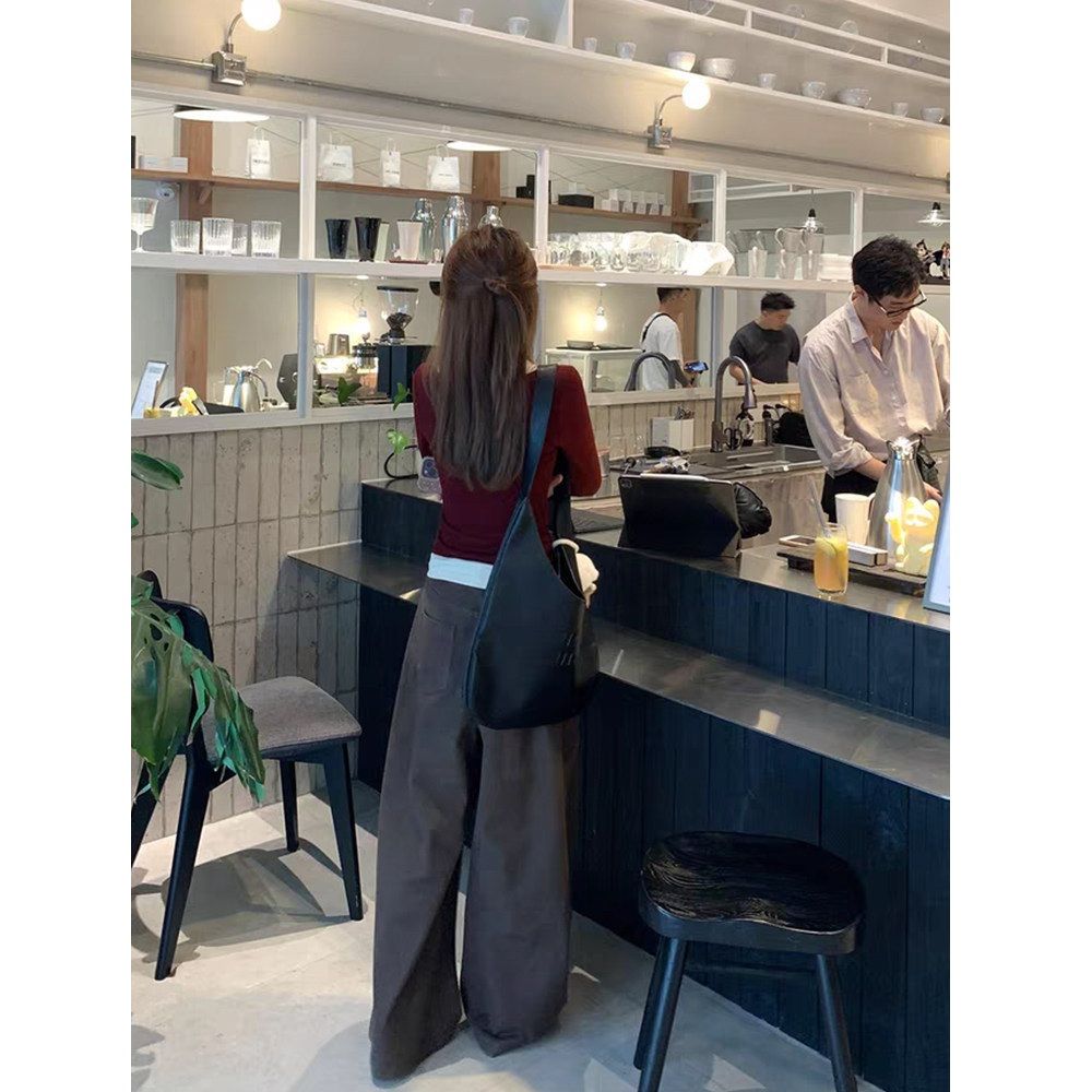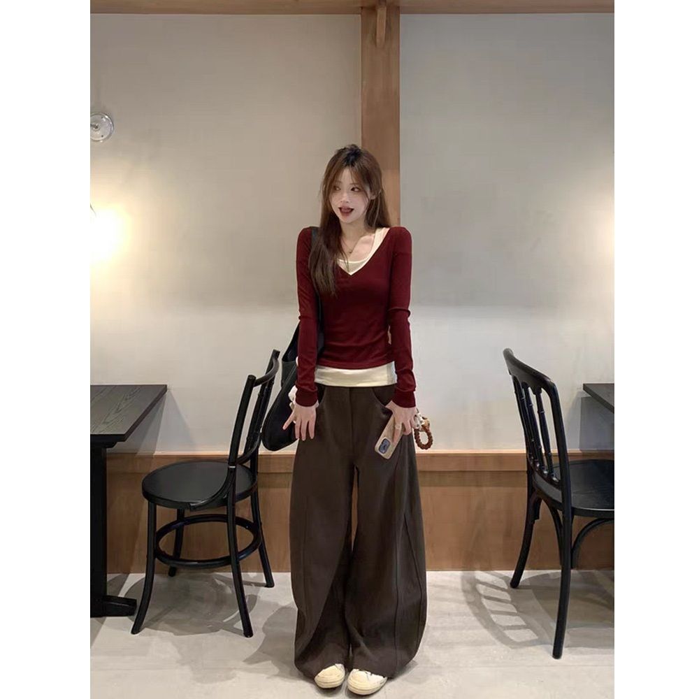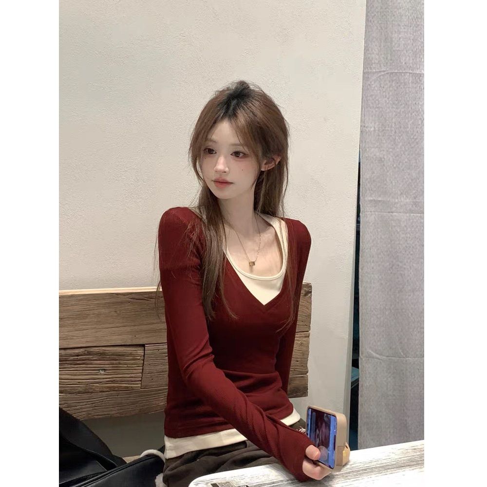 RY1289# 撞色设计感假两件长袖t恤女秋冬新款纯欲风露锁骨修身显瘦打底衫