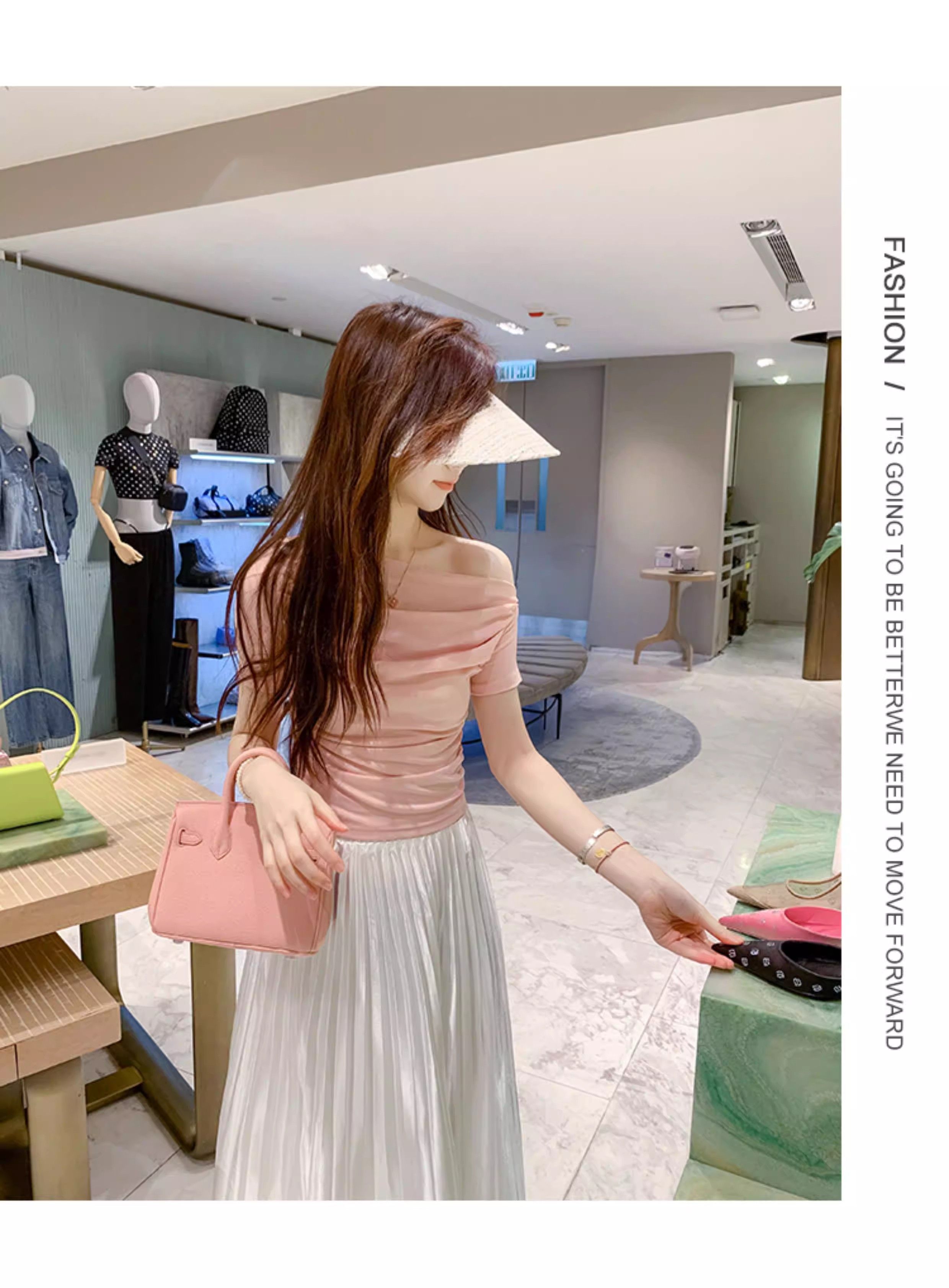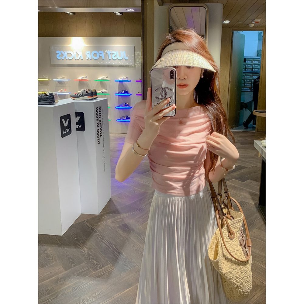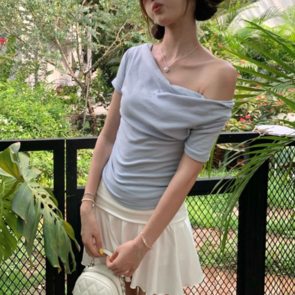 RY1295# 一字露肩短袖t恤女夏季设计感小众上衣