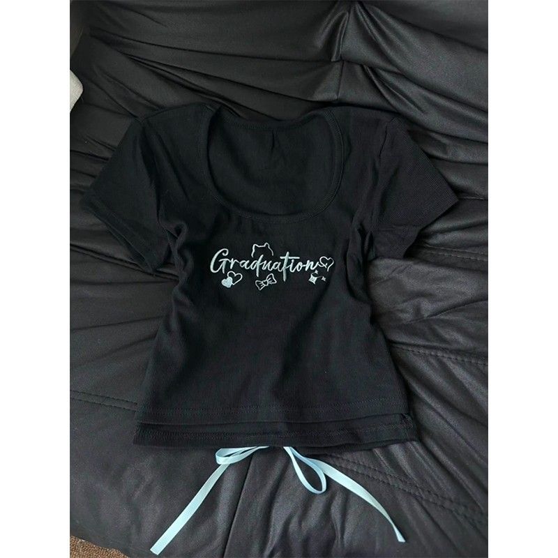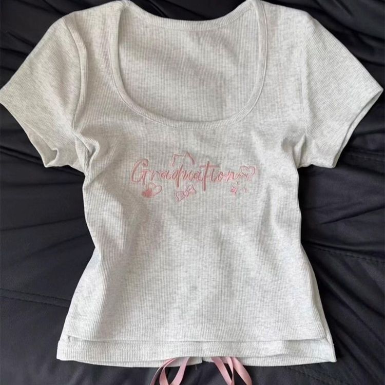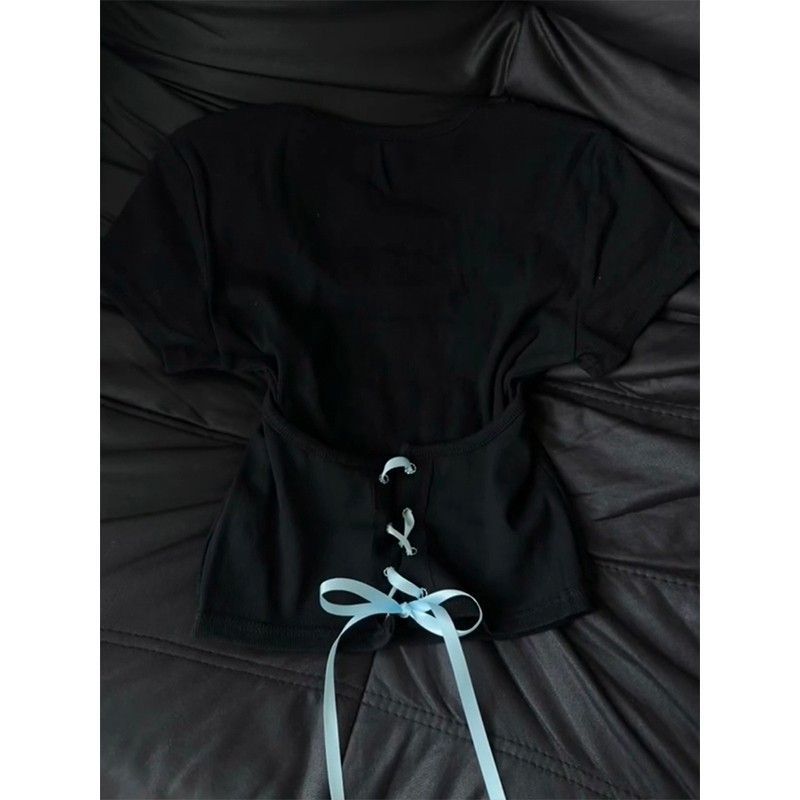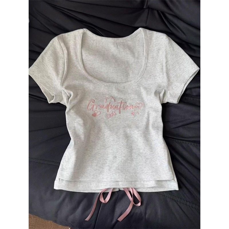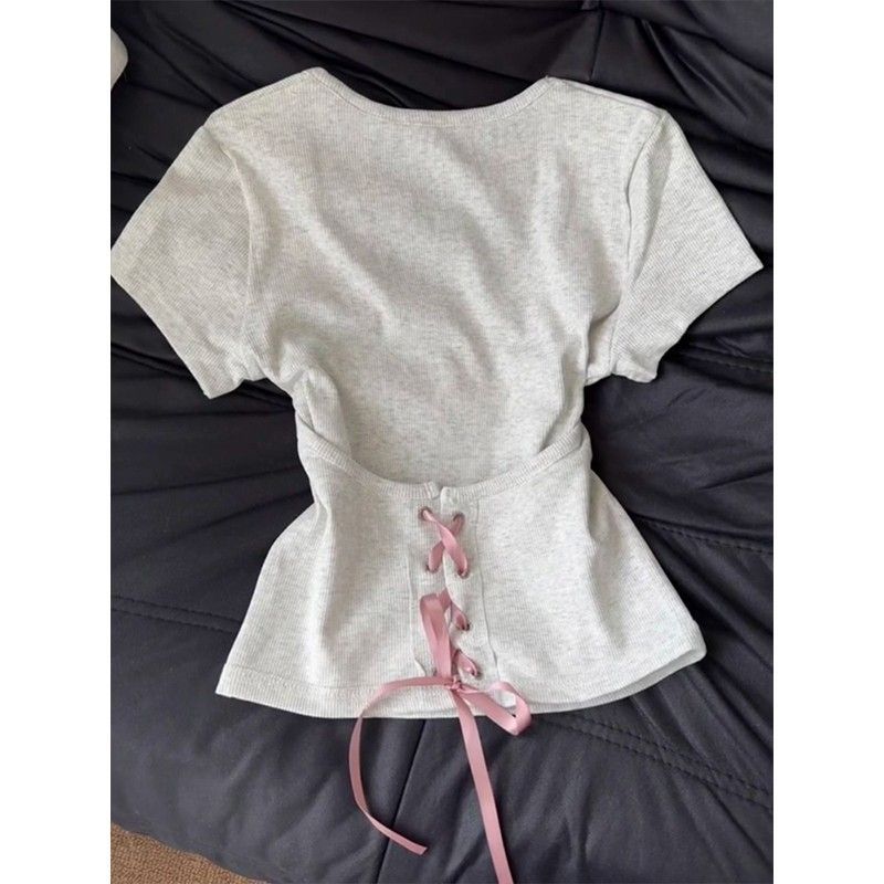 RY1296# 辣妹低领正肩灰色正肩t恤短袖女夏设计感不规则绑带修身显瘦上衣